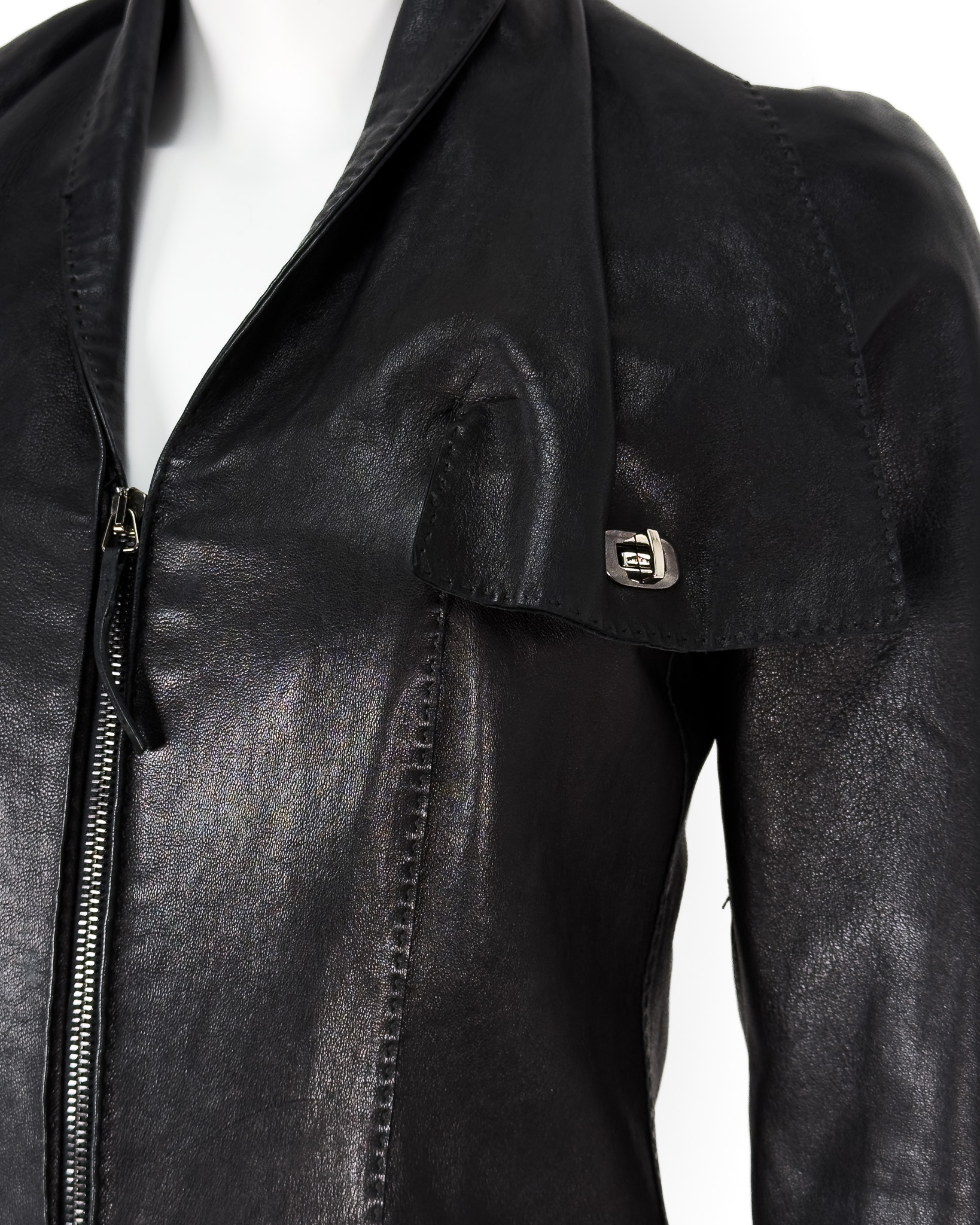 "Czarna kurtka skórzana, miękka skóra, szeroki kołnierz wykończony srebrnym przekręcam zapięciem na kieszeniach w okolicy biustu, taliowana, cztery kieszenie z klapami, zapinana na dwa suwaki, delikatne poduszki na ramionach, ozdobiona stębnowaniem. Rozmiar z metki IT 40. Skład: 100% skóra owcza; podszewka: 60% acetat, 40% rayon. Wymiary: szerokość mierzona od pachy do pachy 43cm, długość całkowita 62cm."