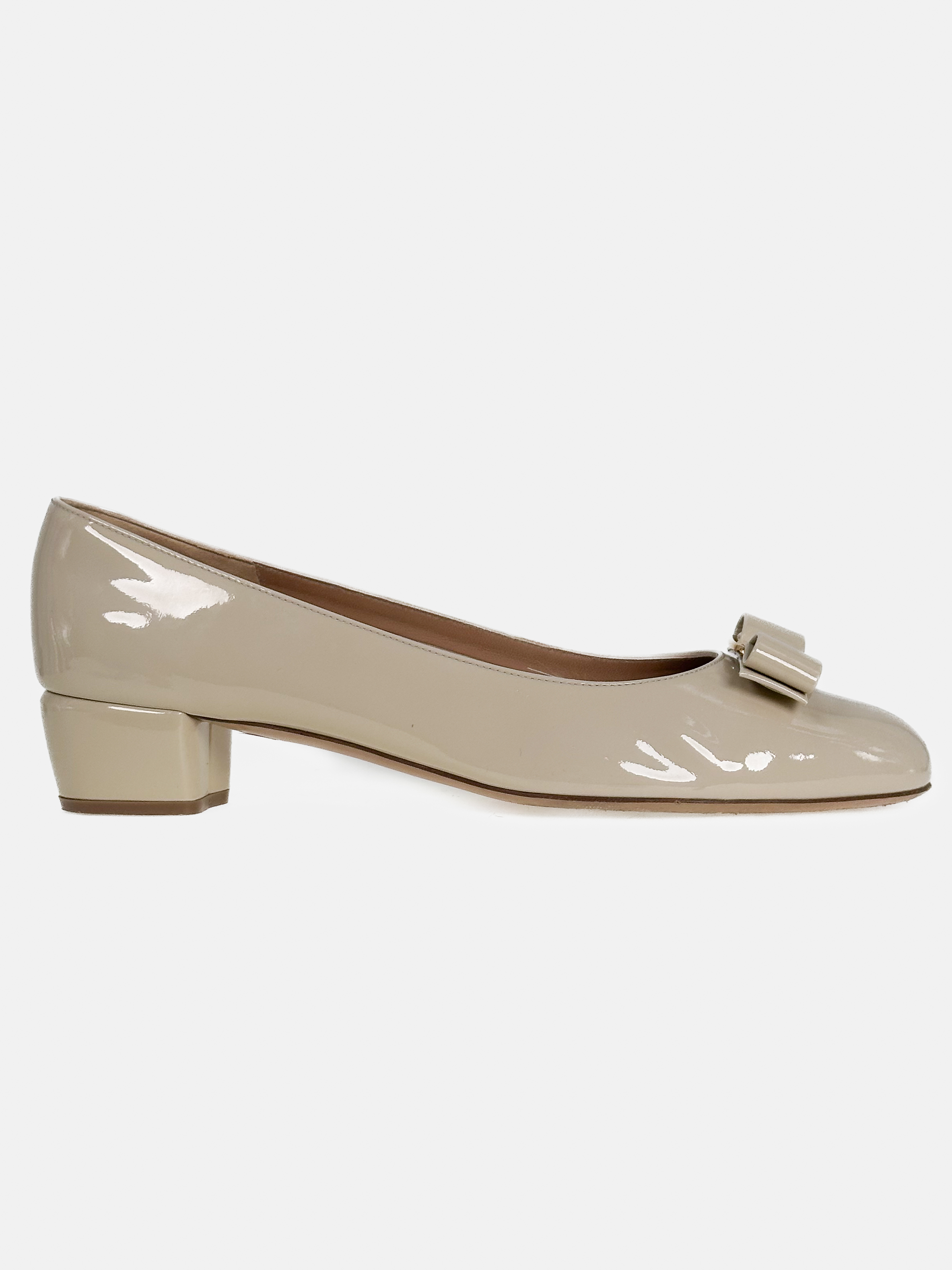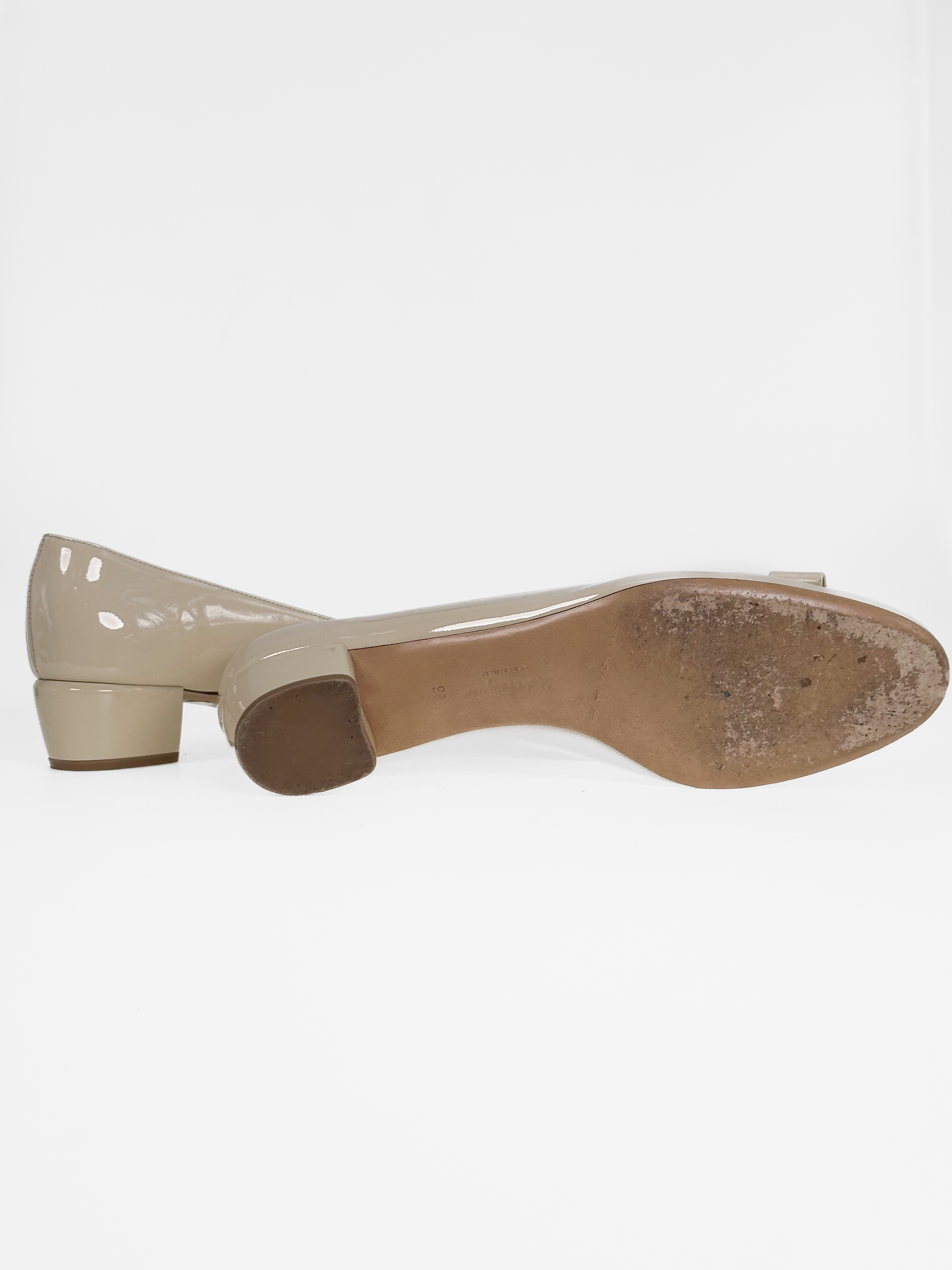 "Beżowe lakierowane baleriny na obcasie, z przodu złota kokardka z logo, rozmiar 39,5. Stan bardzo dobry, posiadają przetarcia na podeszwie."