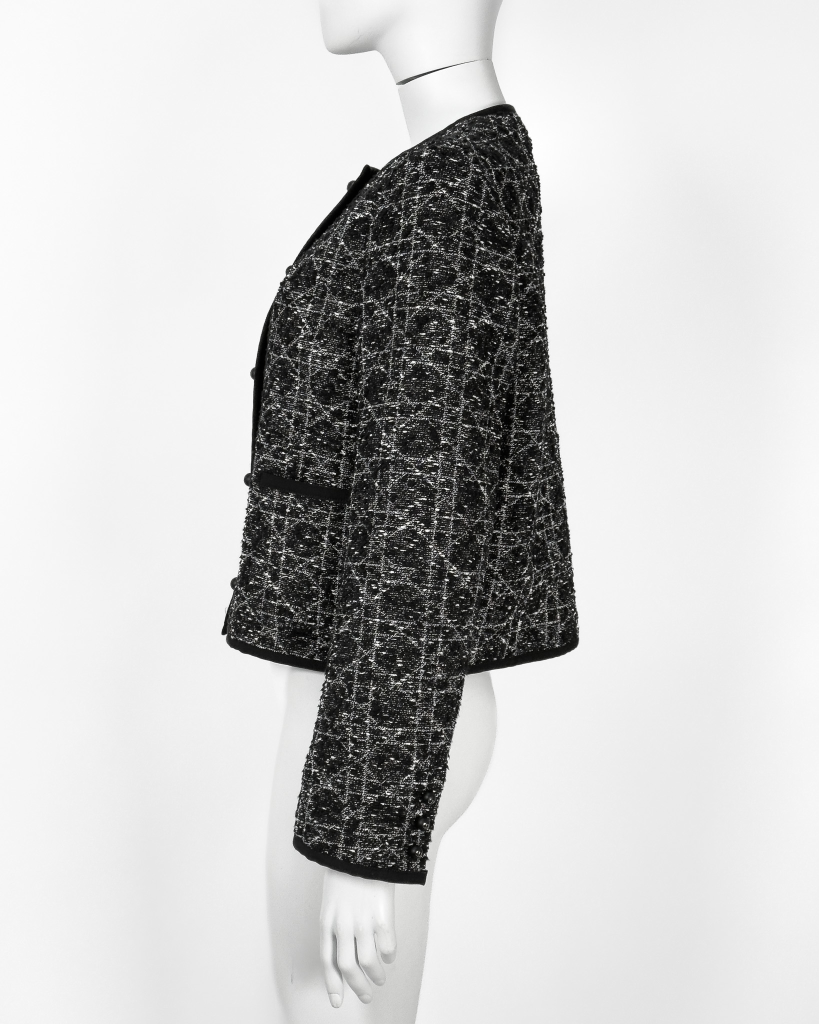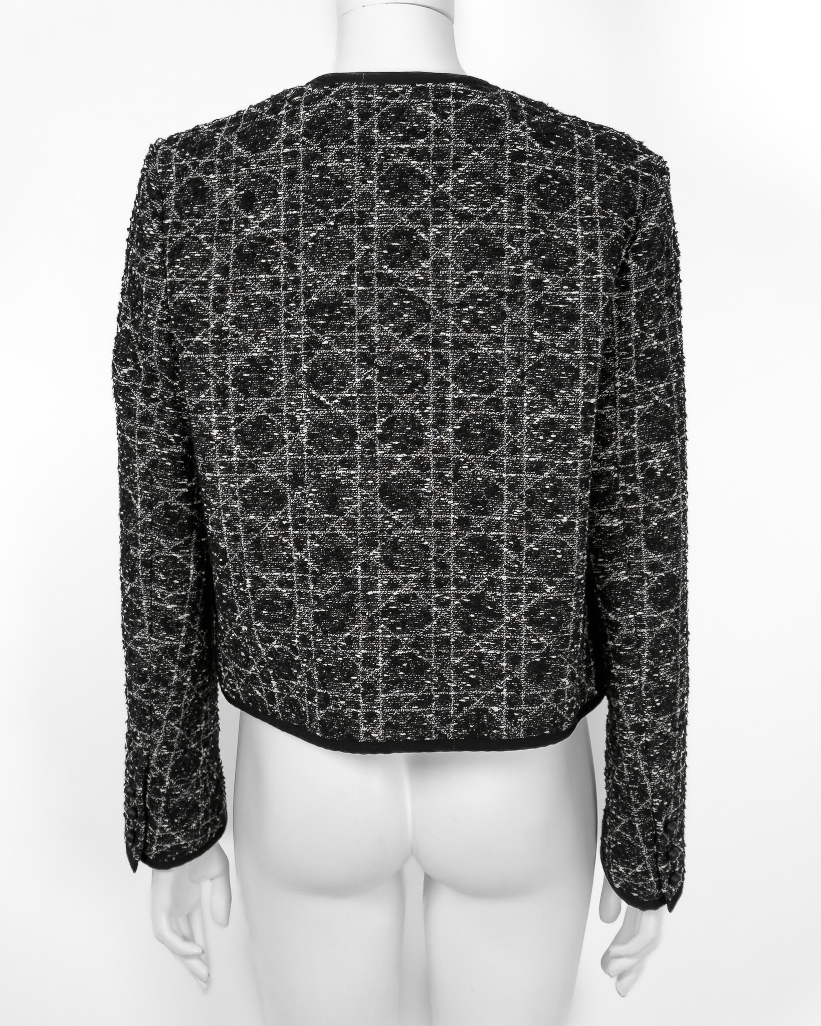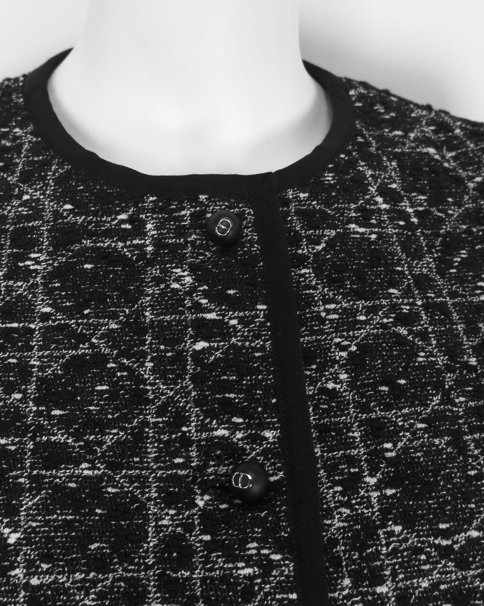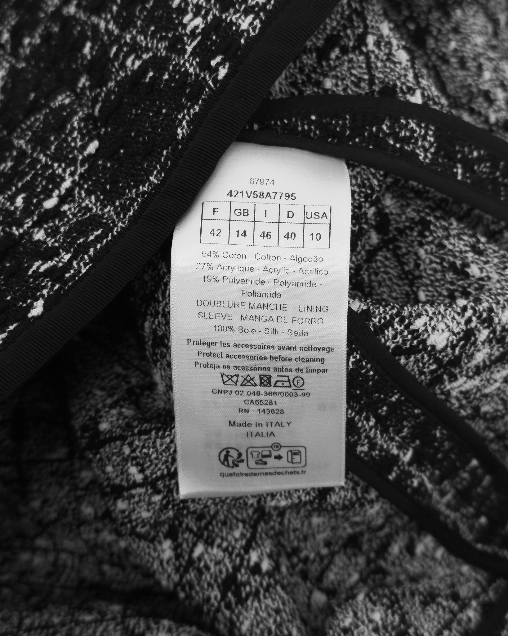 "Czarno-biała tweedowa marynarka z czarną lamówką, pudełkowy krój, kwadratowe kieszenie z przodu, okrągłe guziki z logo marki, zaokrąglony dekolt. Stan idealny, z metką. Rozmiar z metki IT 46. Skład: 54% bawełna, 27% akryl, 19% poliamid. Wymiary: szerokość mierzona od pachy do pachy 52cm, długość całkowita 53cm."