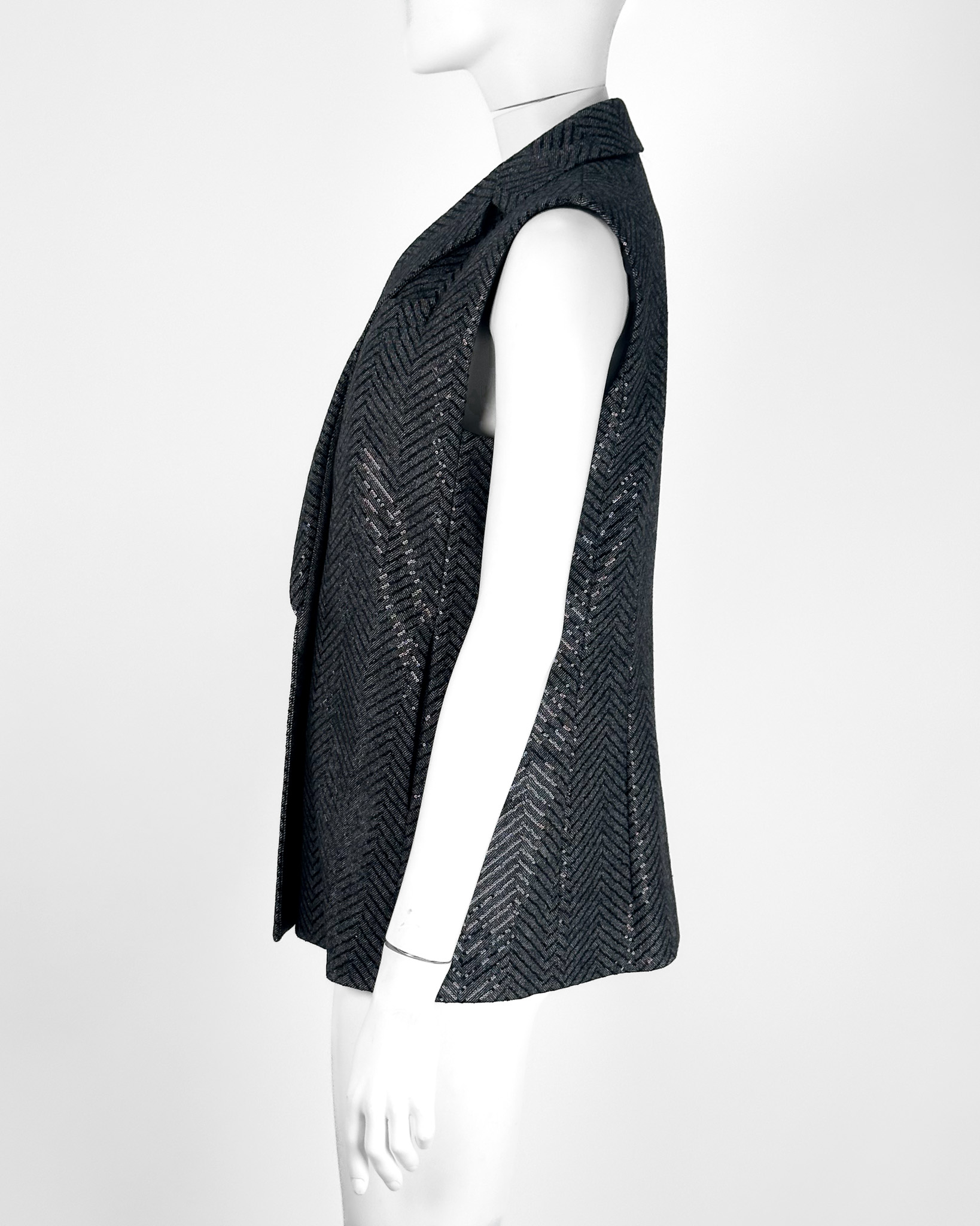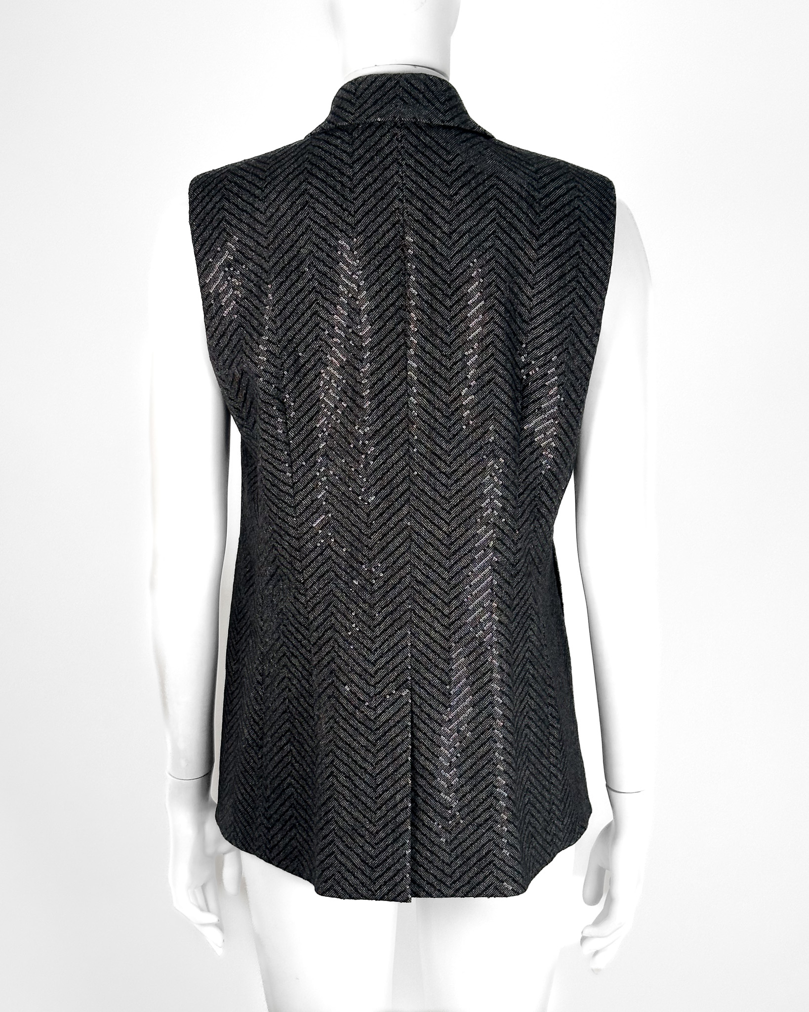 "Prosta marynarkowa kamizelka z cekinami w jodełkę, jedwabna podszewka, zapinana na dwurzędowe guziki, rozmiar 40. Stan - jak nowa.