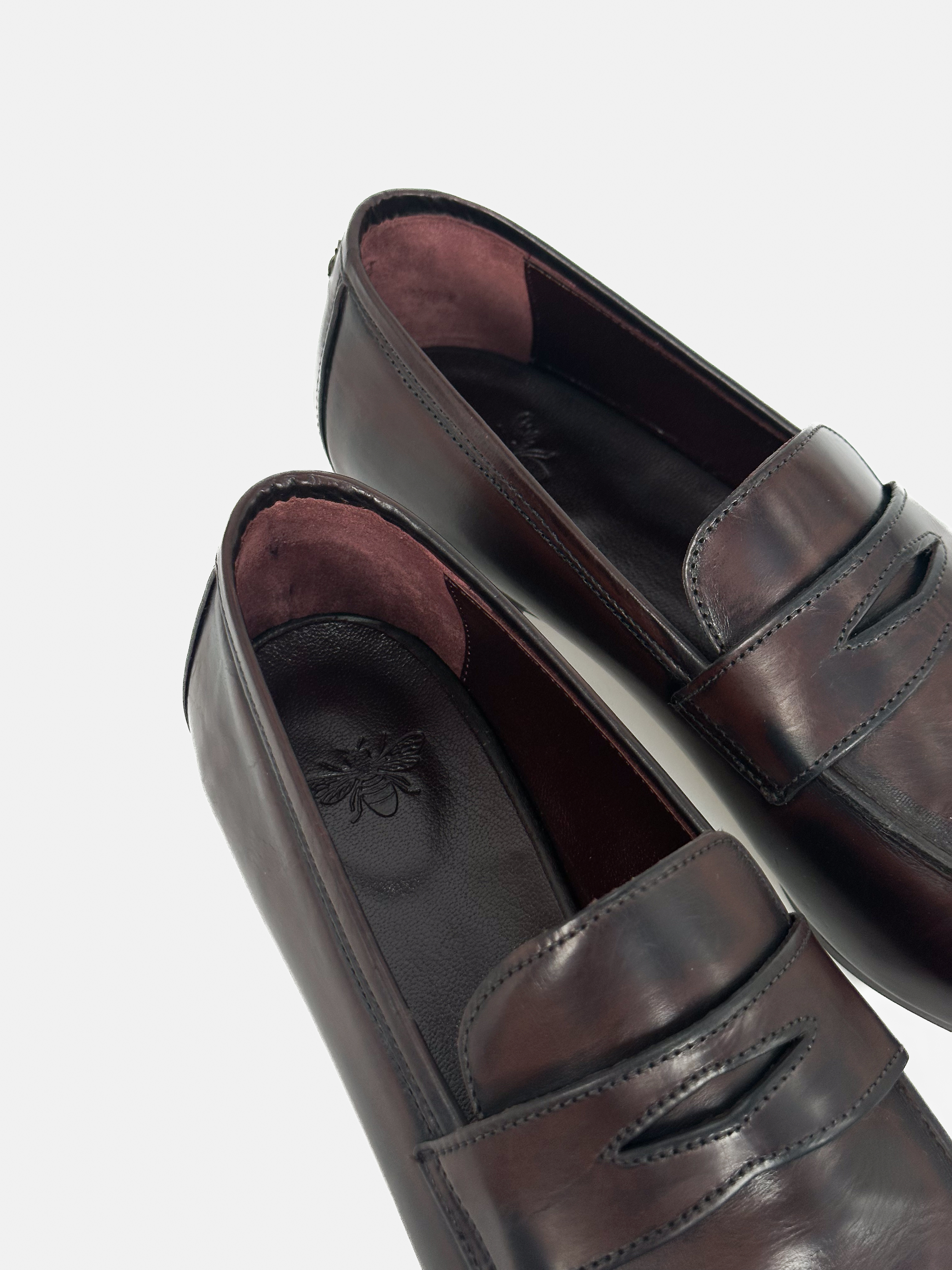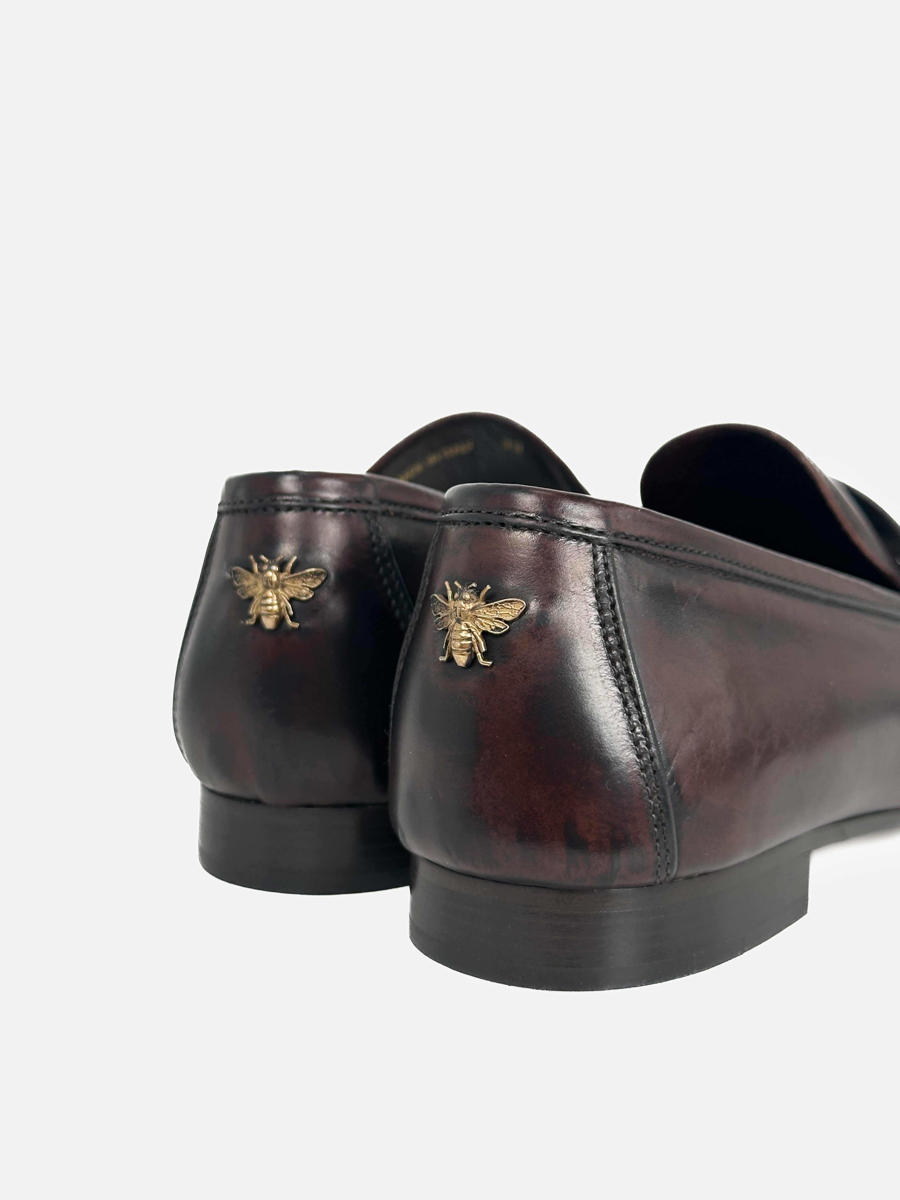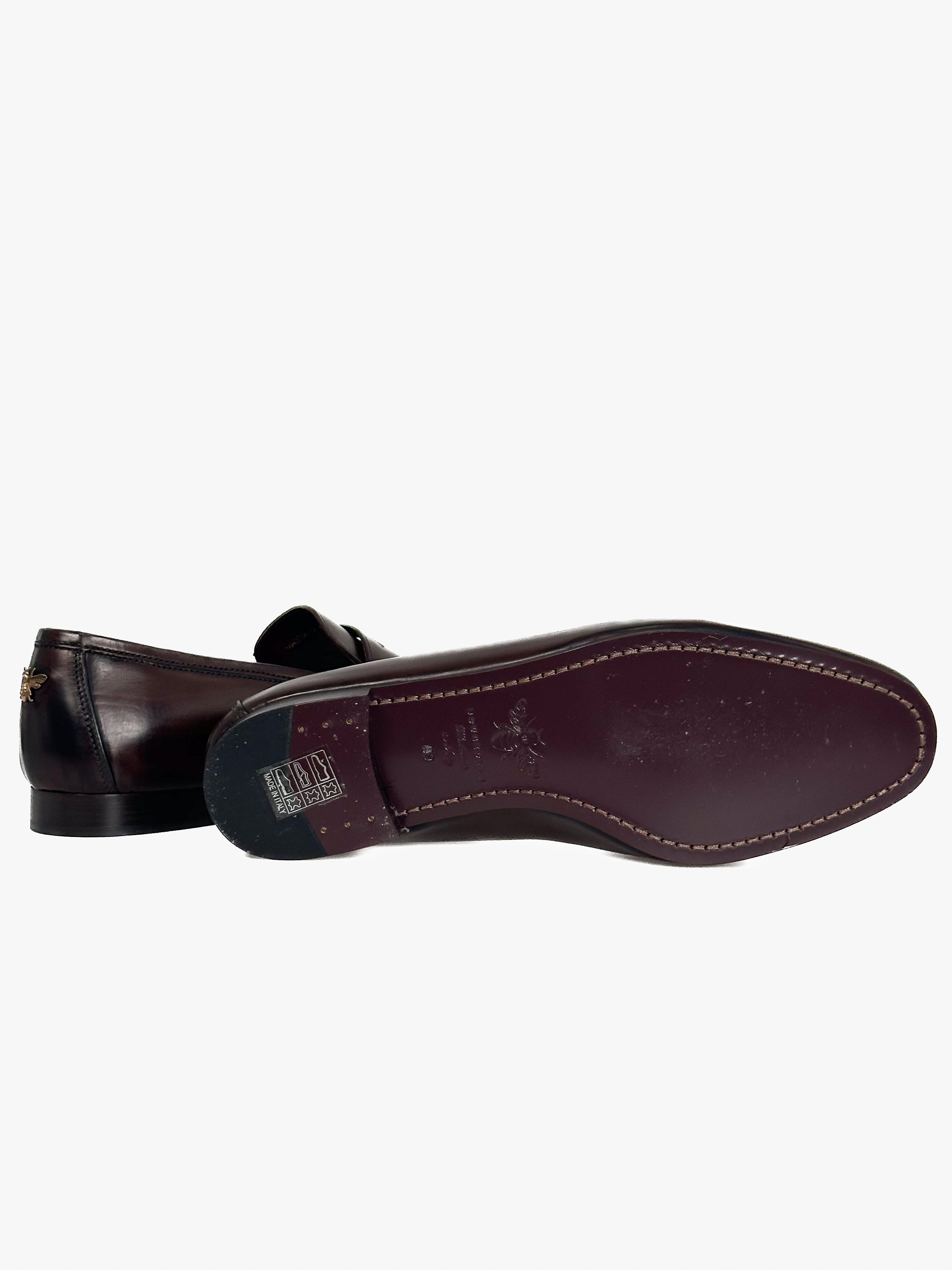 "Skórzane mokasyny w kolorze burgundowo-brązowym, z tyłu złote logo marki, noski obcas, migdałowe noski. Nowe z pudełkiem, rozmiar 39."