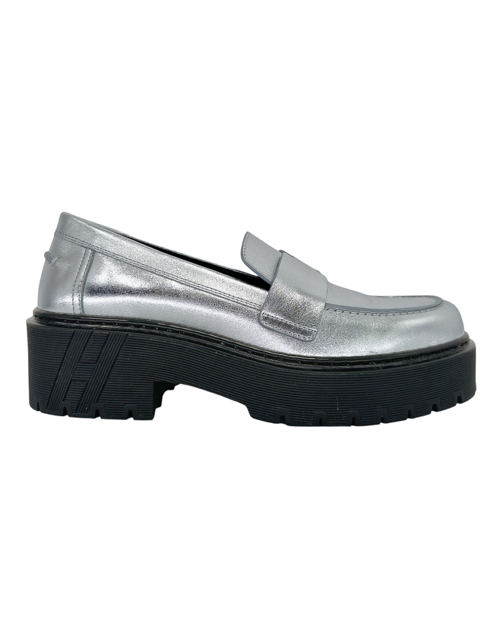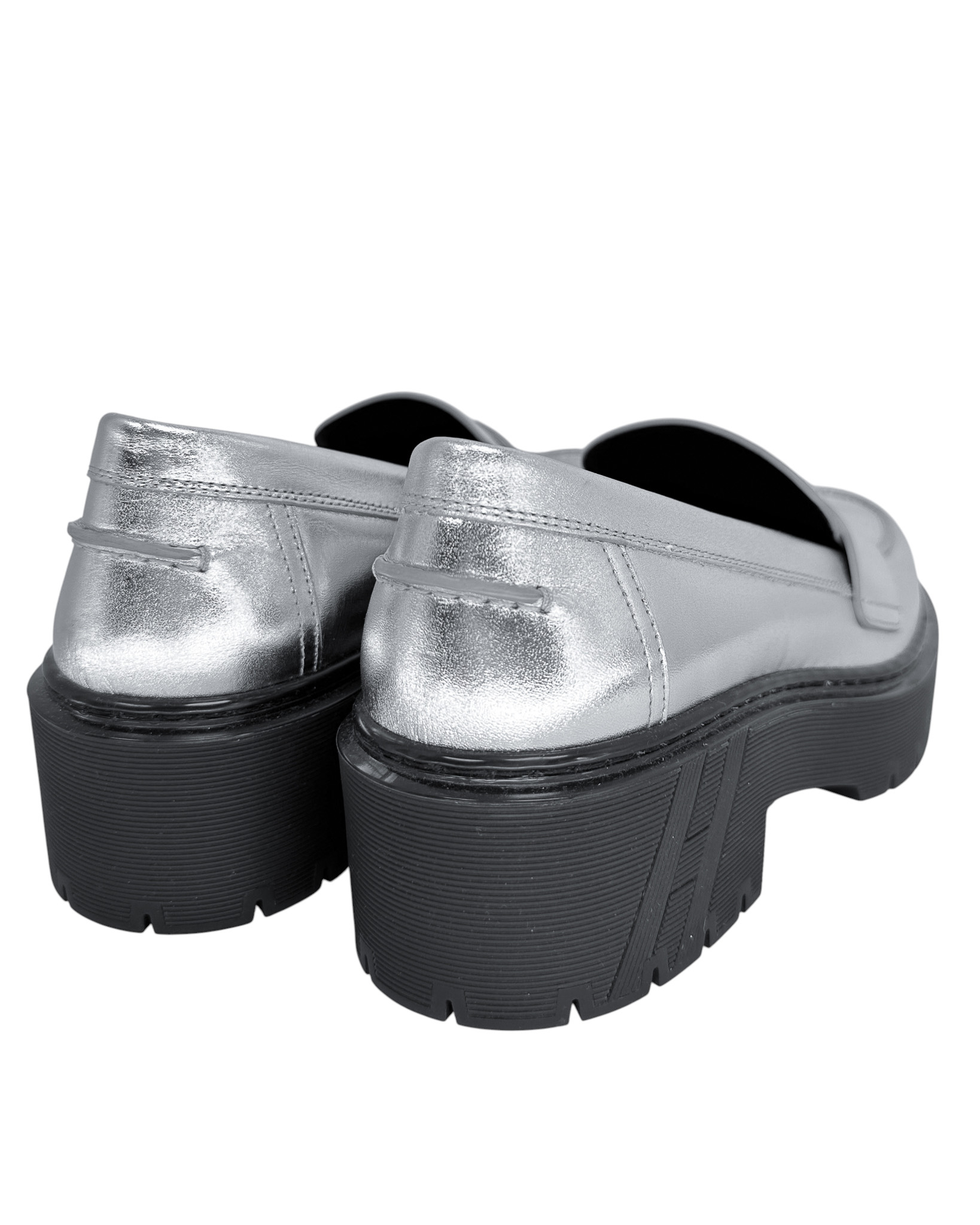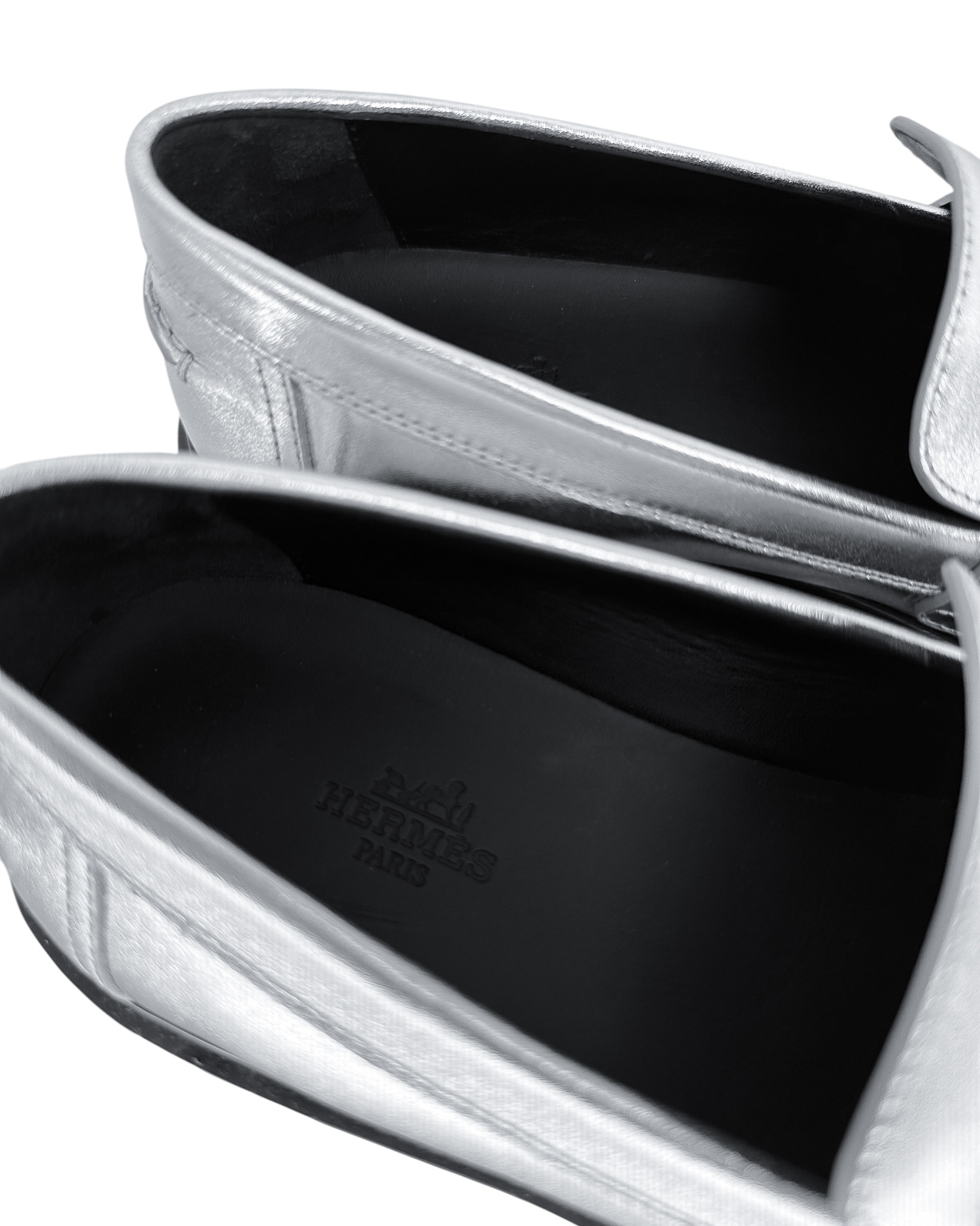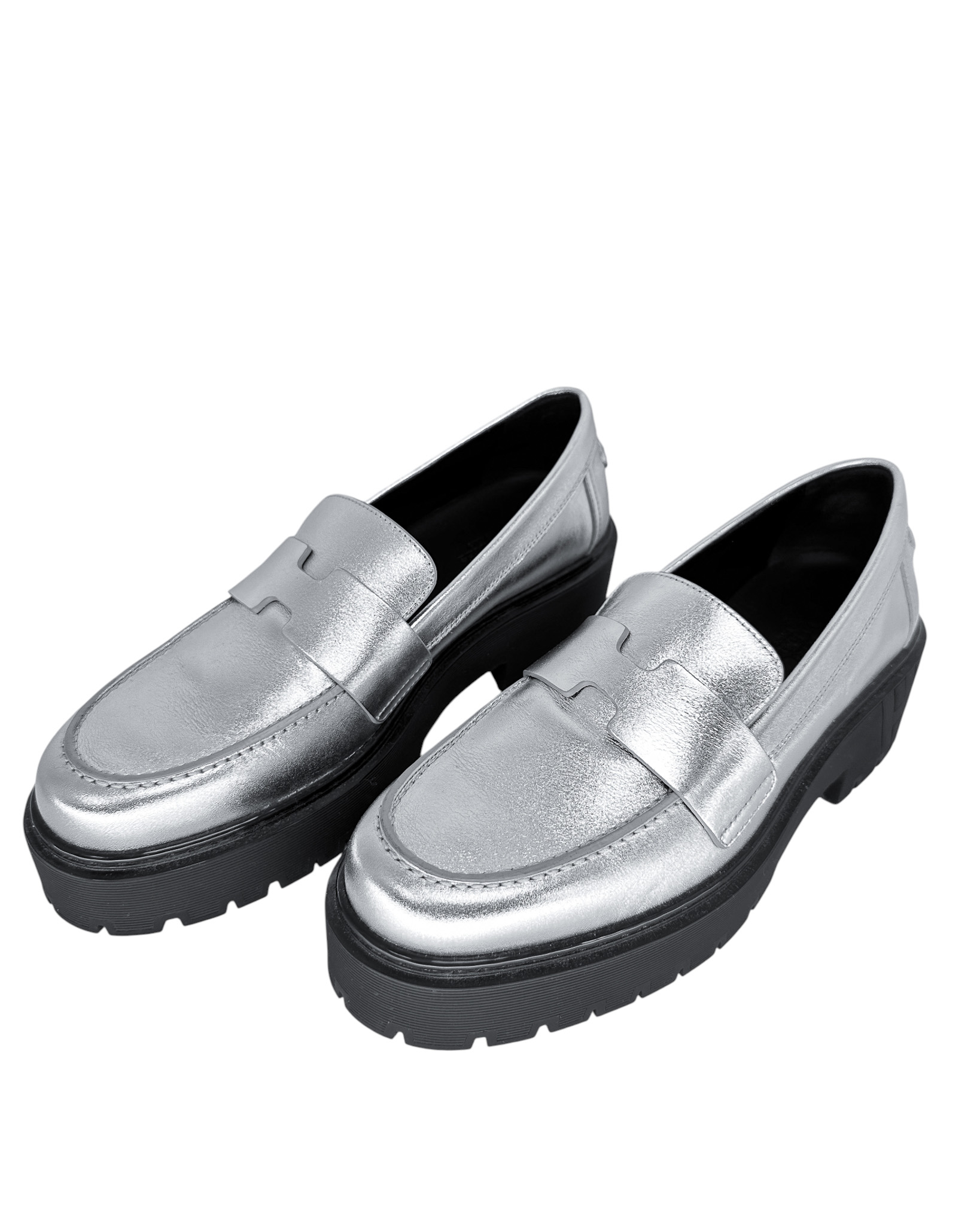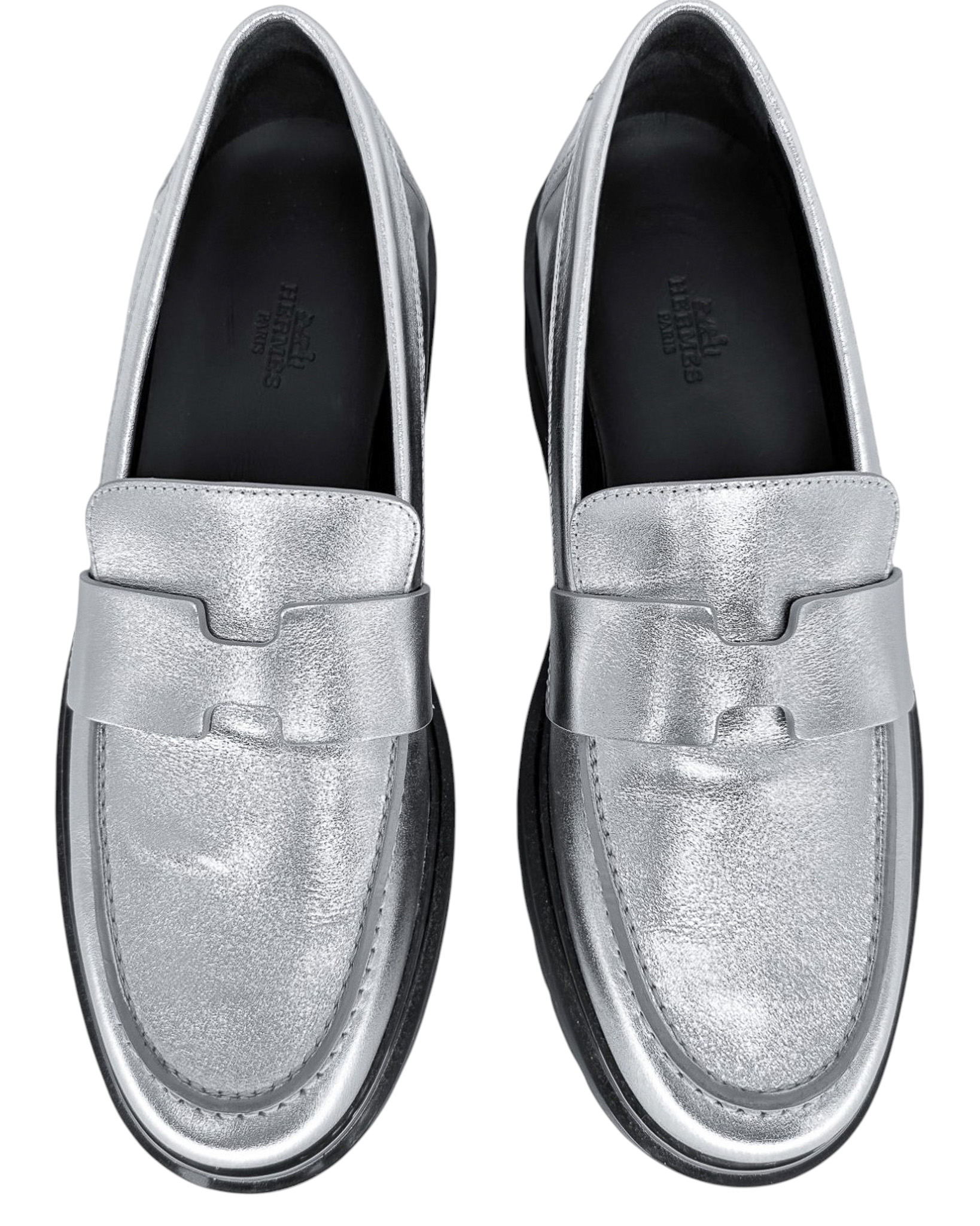 "Srebrne skórzane mokasyny na czarnej, gumowej wyższej podeszwie, ozdobione paskiem w charakterystycznym dla marki kształcie litery "H" w przedniej części, zaokrąglone noski, wycięcia po bokach, wsuwane, w zestawie z workiem przeciwkurzowym marki Chloe. Stan bardzo dobry, posiadają delikatne zadrapania na noskach, minimalne ślady użytkowania na podeszwie. Rozmiar 38. ( wypadają na większe)."