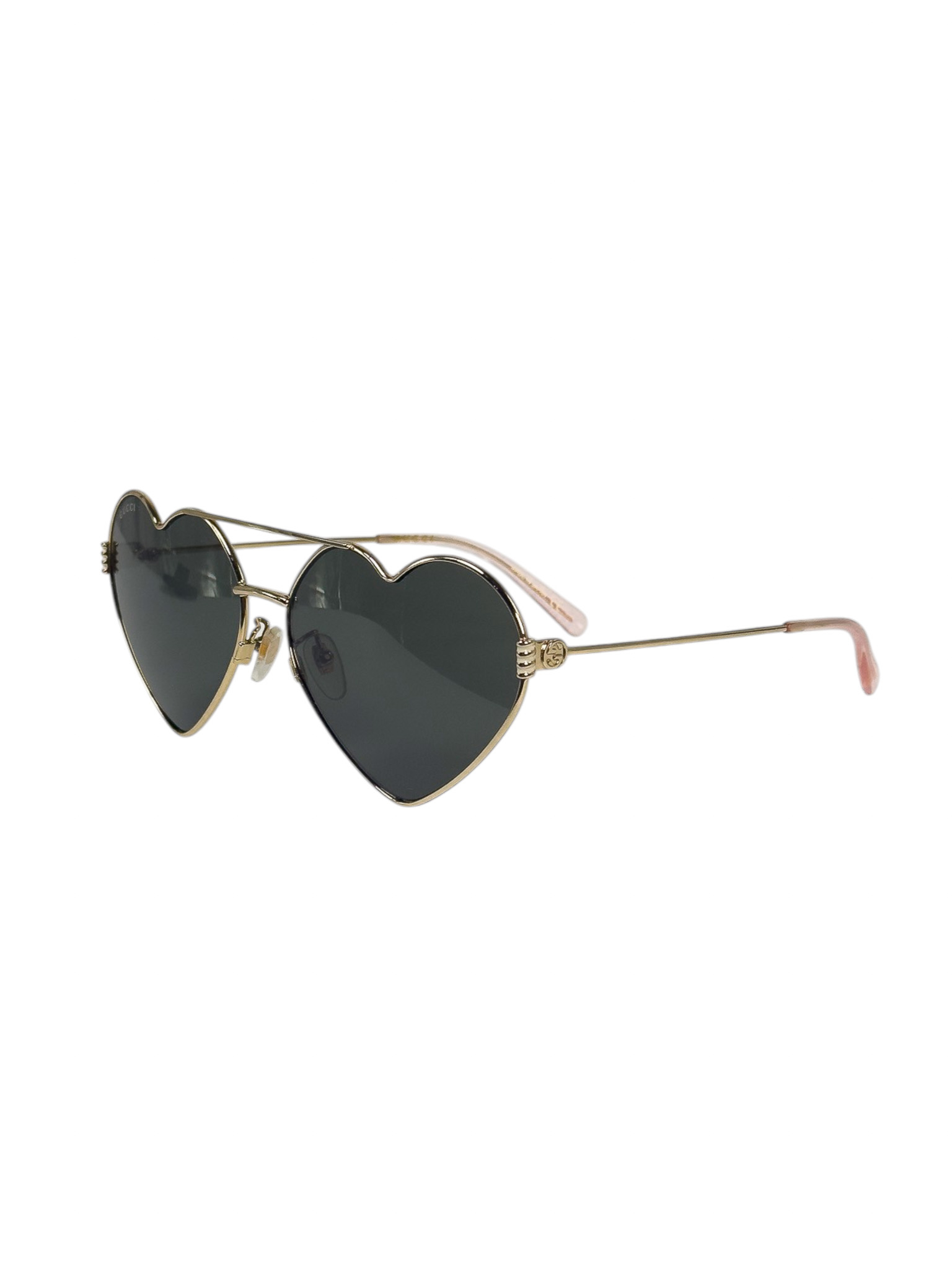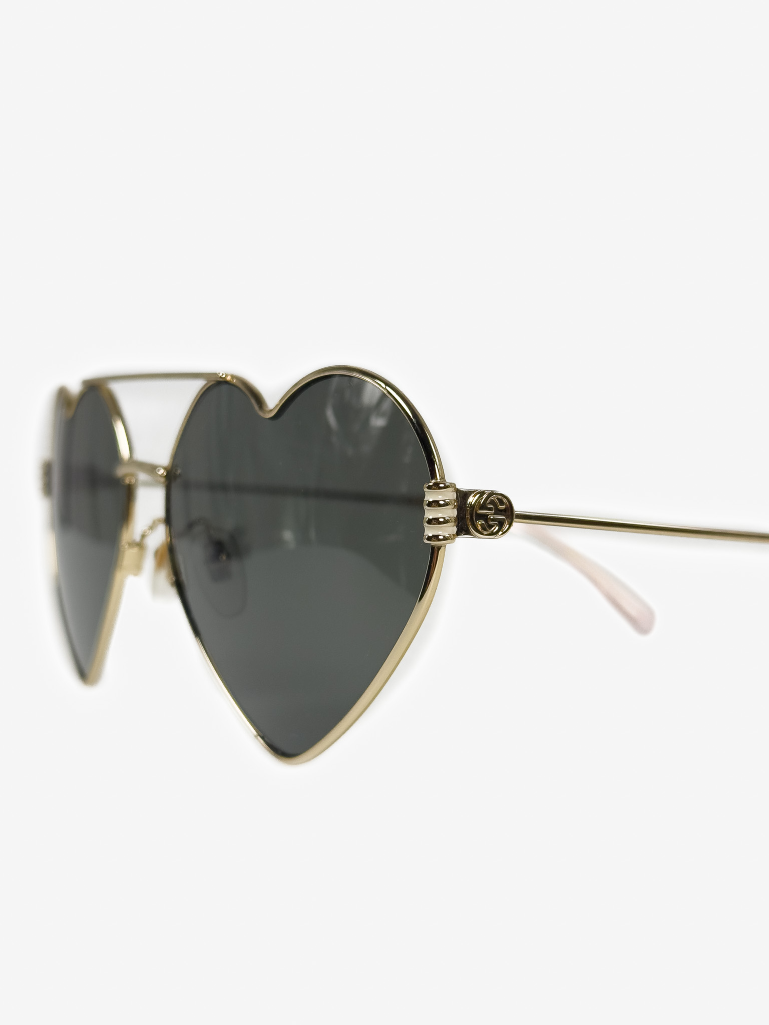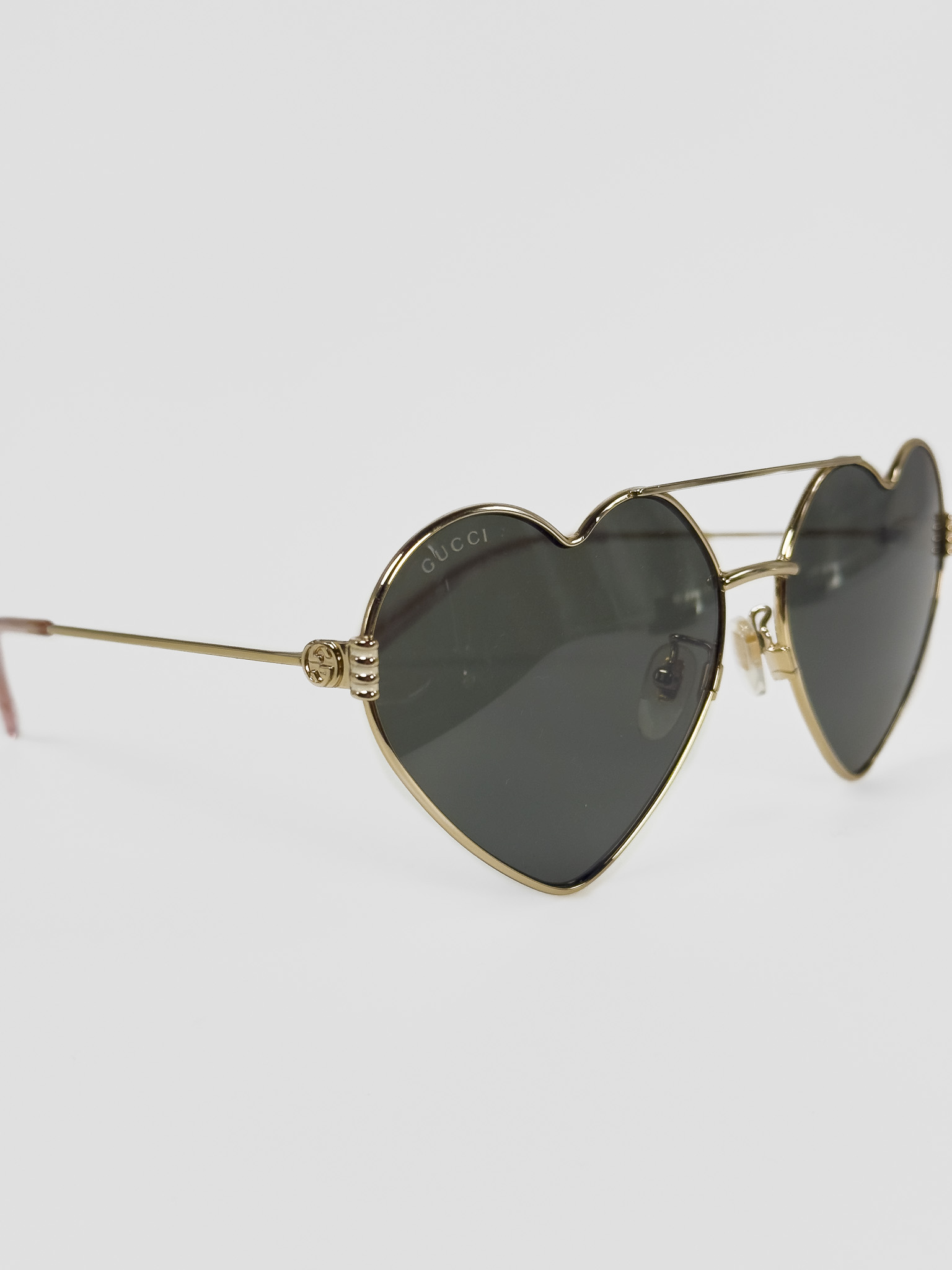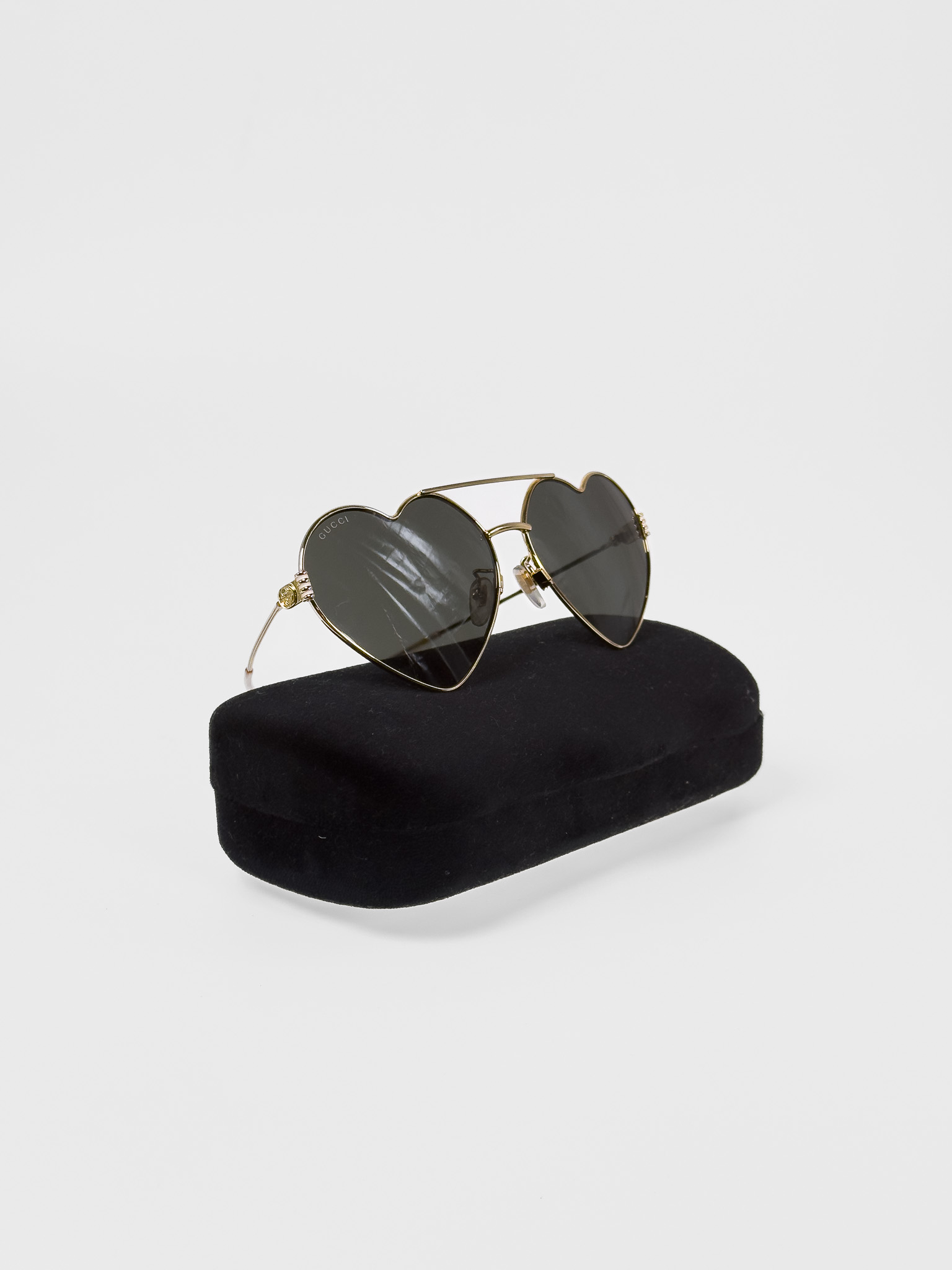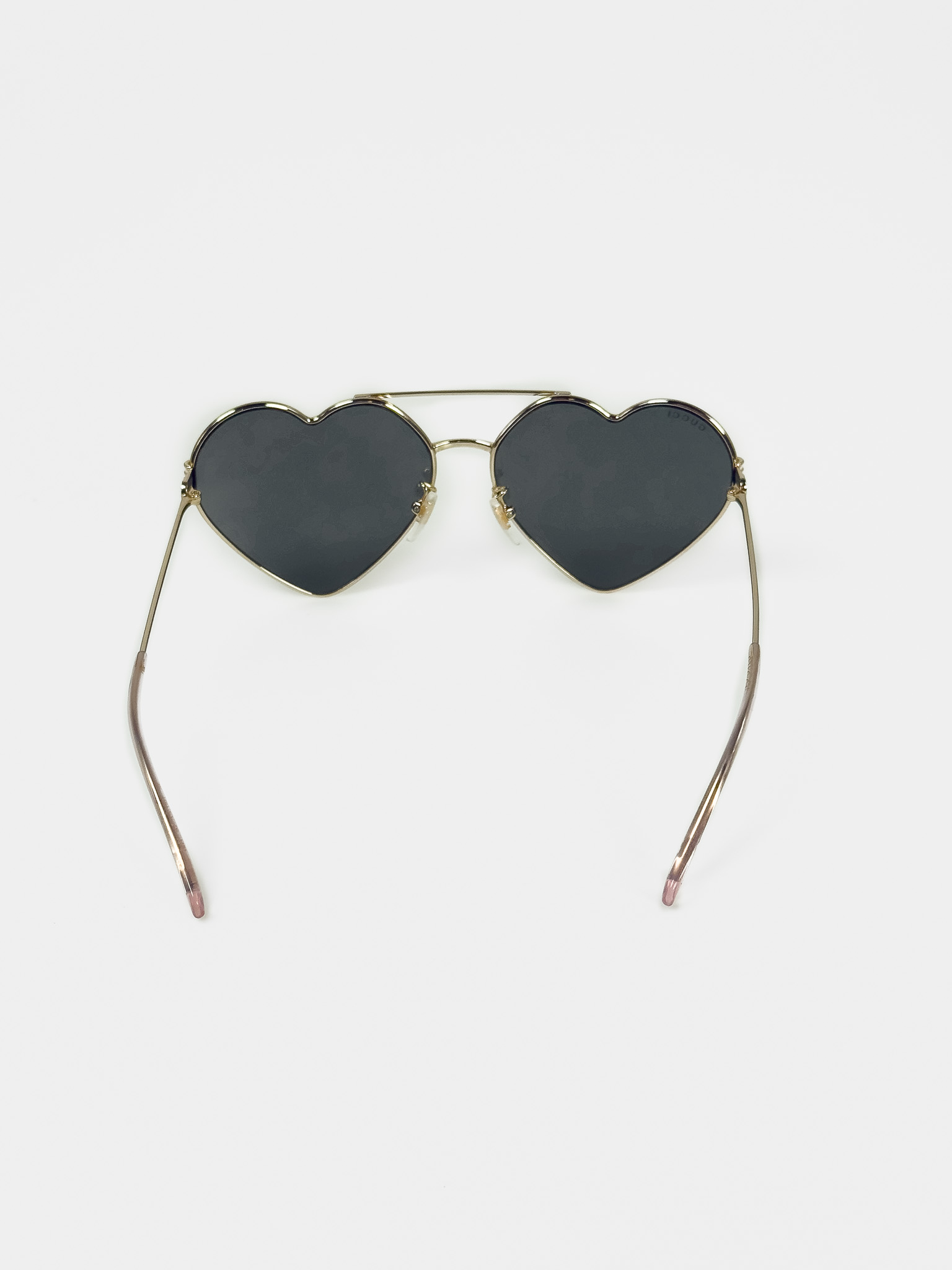 "Okulary przeciwsłoneczne w kształcie serc, cienkie, złote oprawki, ciemne szkła, delikatne logowanie po bokach. Etui w komplecie. Stan bardzo dobry."