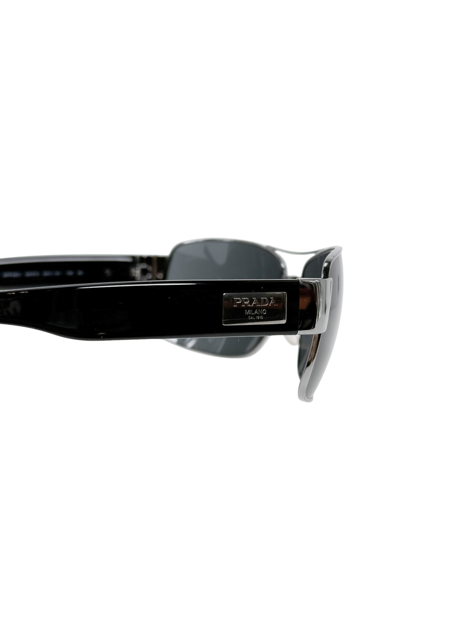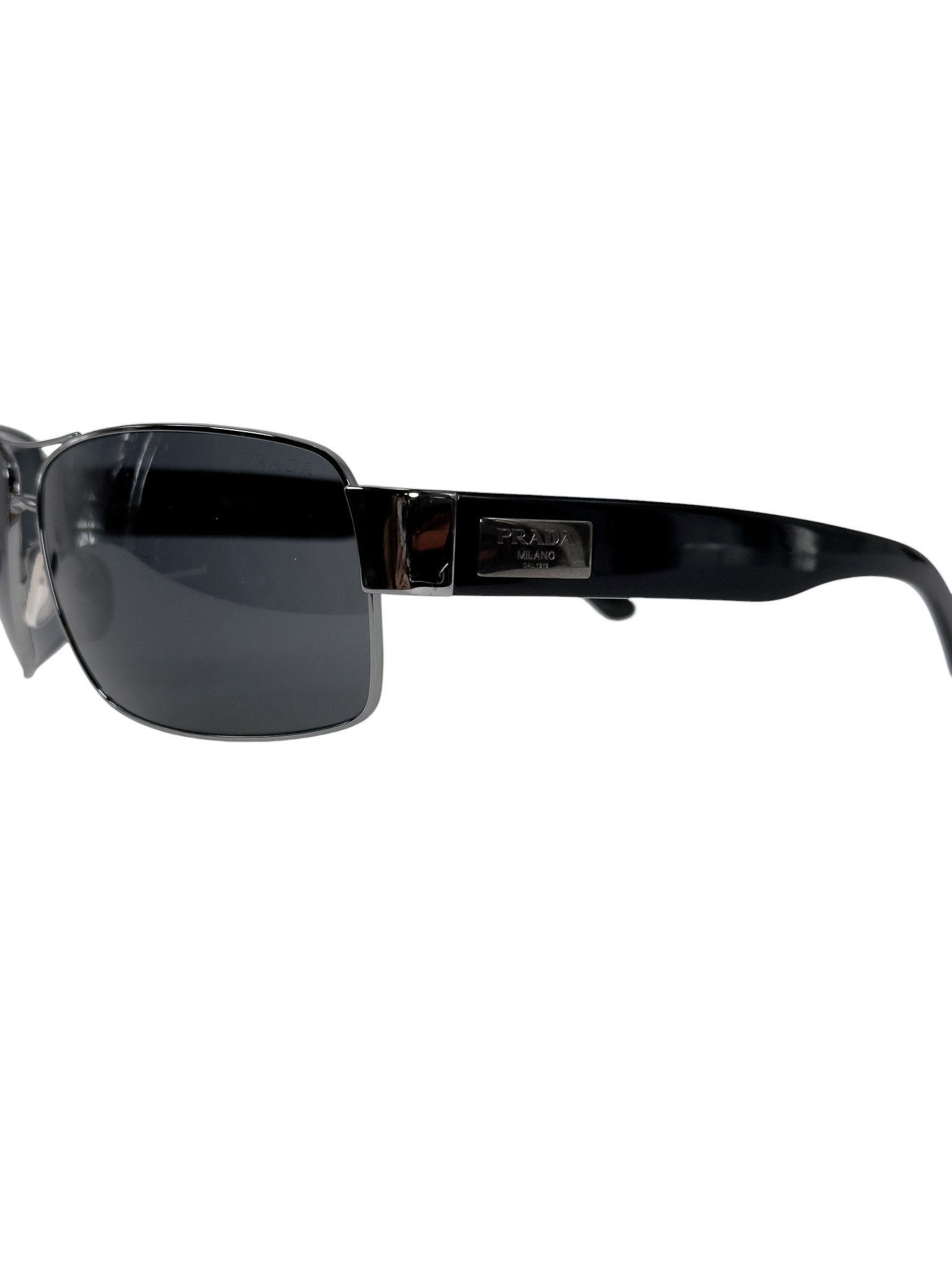 "Ciemnoszare męskie okulary przeciwsłoneczne, podłużny kształt, szkła z poświatą granatowego koloru, chromowane elementy przy oprawkach, logo na zausznikach. Etui w zestawie. Stan dobry, posiadają rysy na szkłach oraz zausznikach."