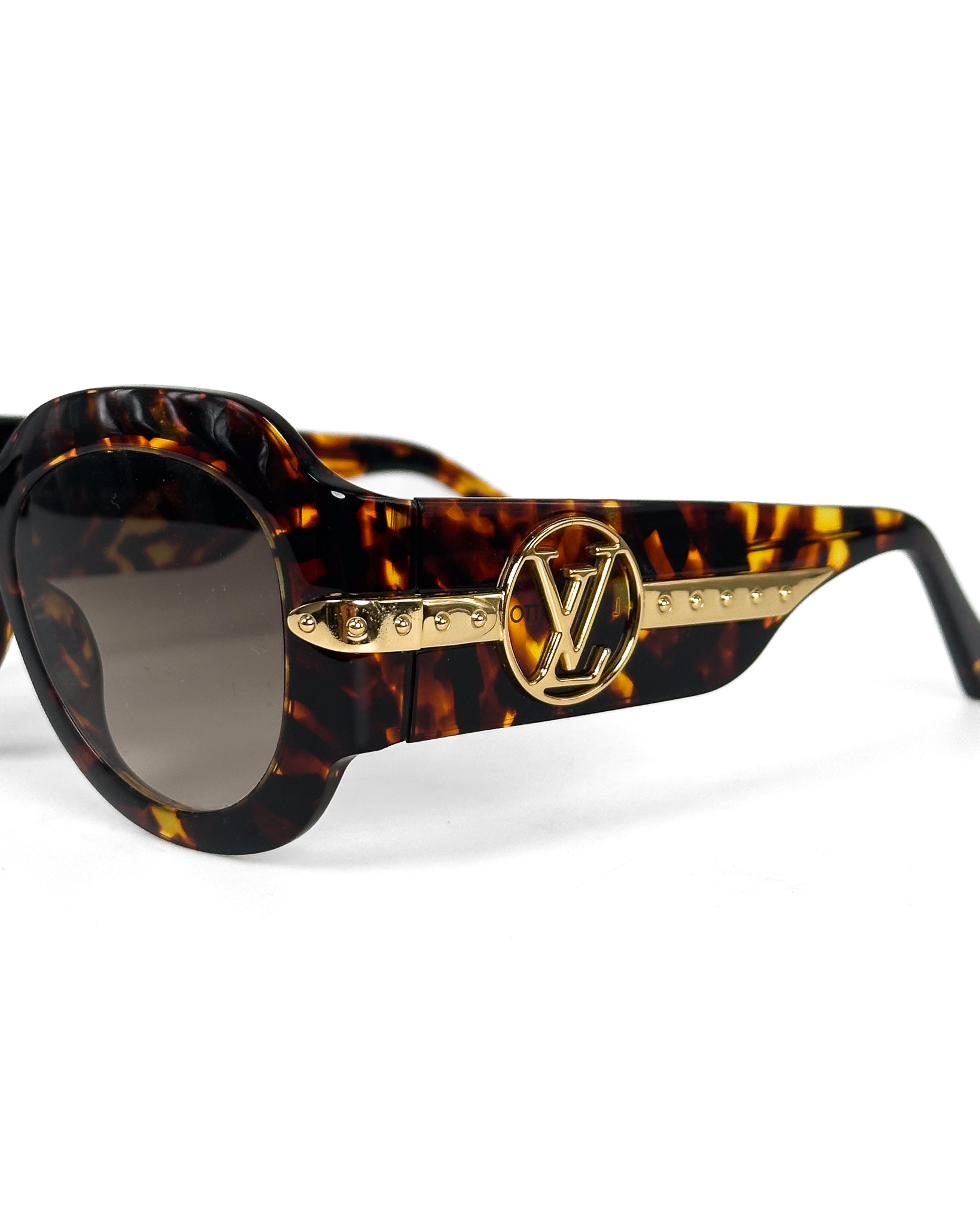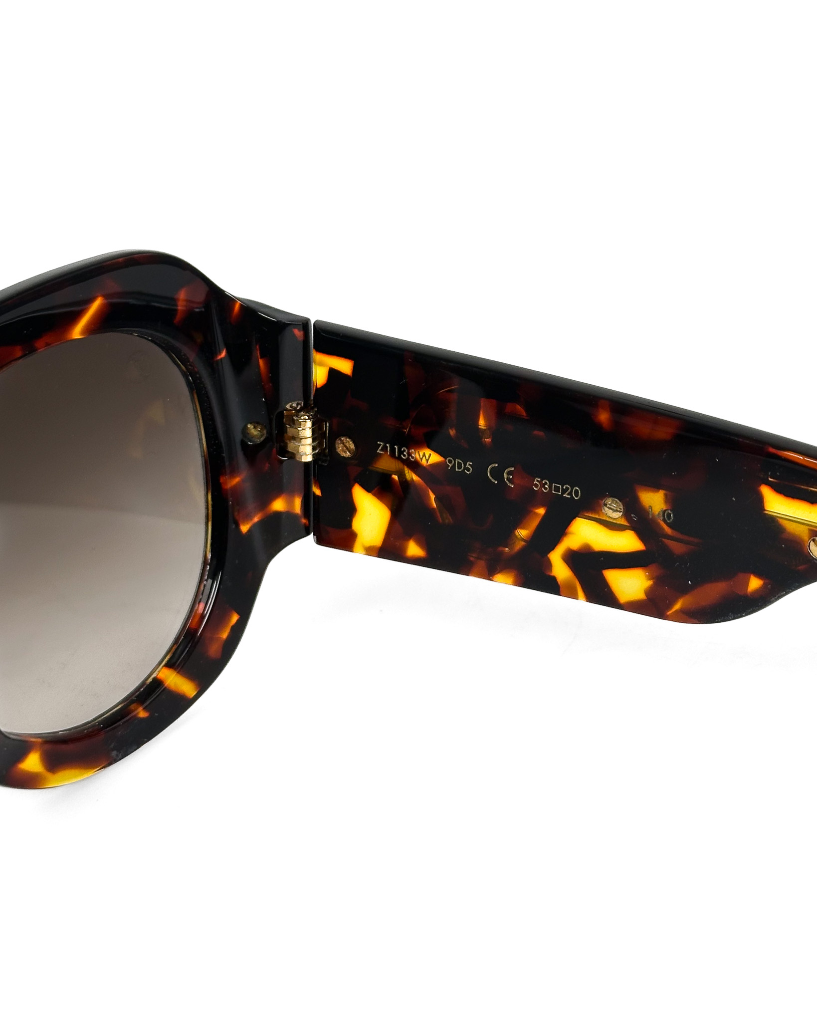 "Brązowe szylkretowe okulary przeciwsłoneczne, złote logo na zausznicach. W komplecie w pudełkiem papierowym oraz granatowym skórzanym oraz torbą papierową"