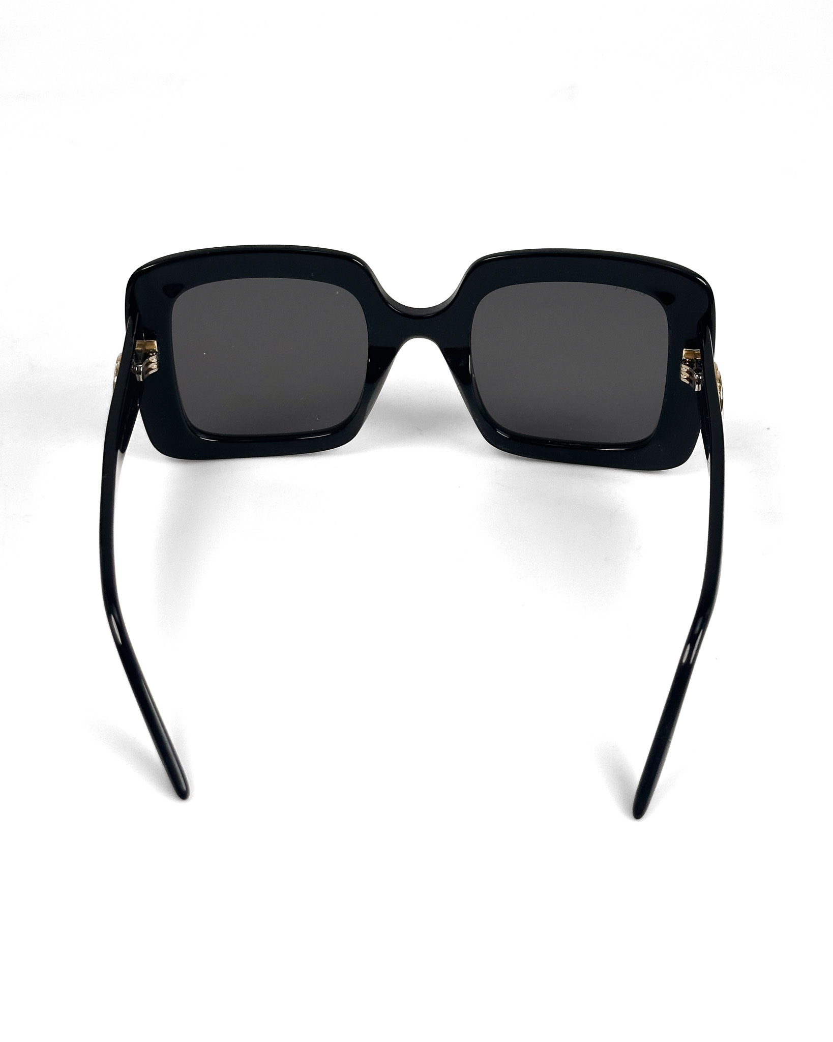 "Czarne kwadratowe okulary w grubszych oprawkach, duże złote logo marki na zausznikach. Posiadają rysy na oprawkach oraz drobne rysy na szkłach. W zestawie z pudelkiem i woreczkiem do przechowywania."