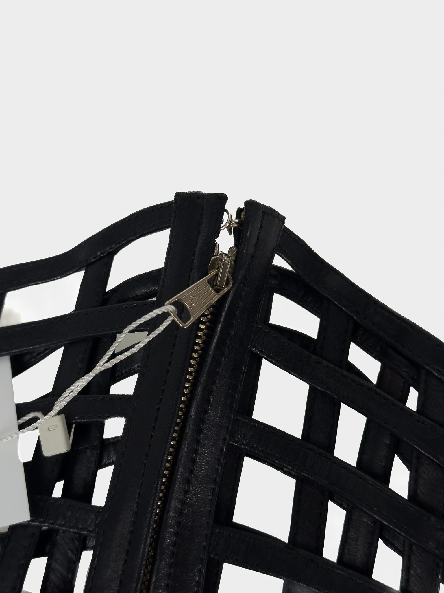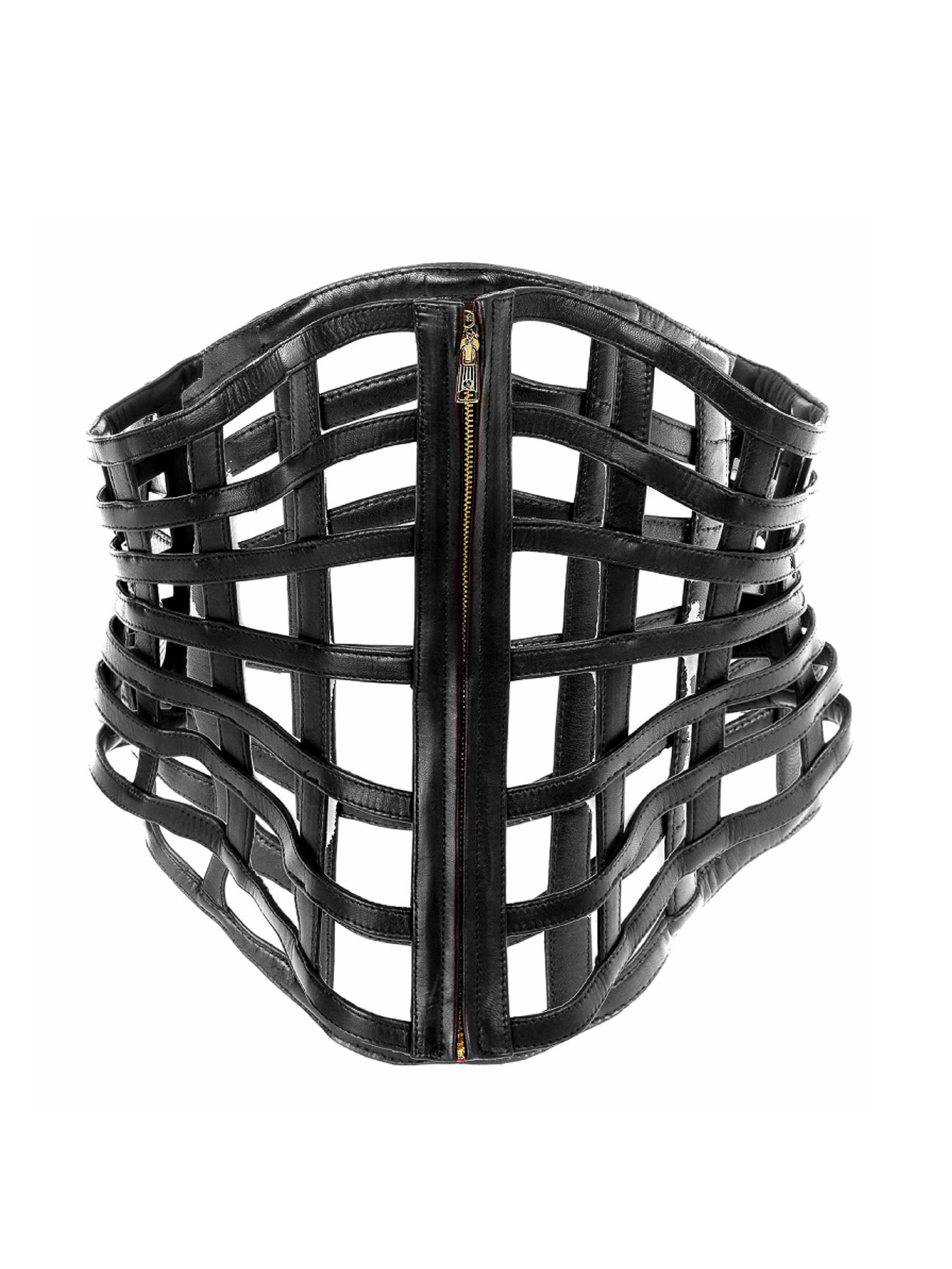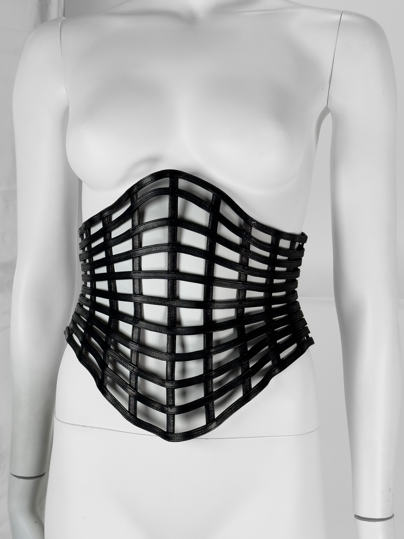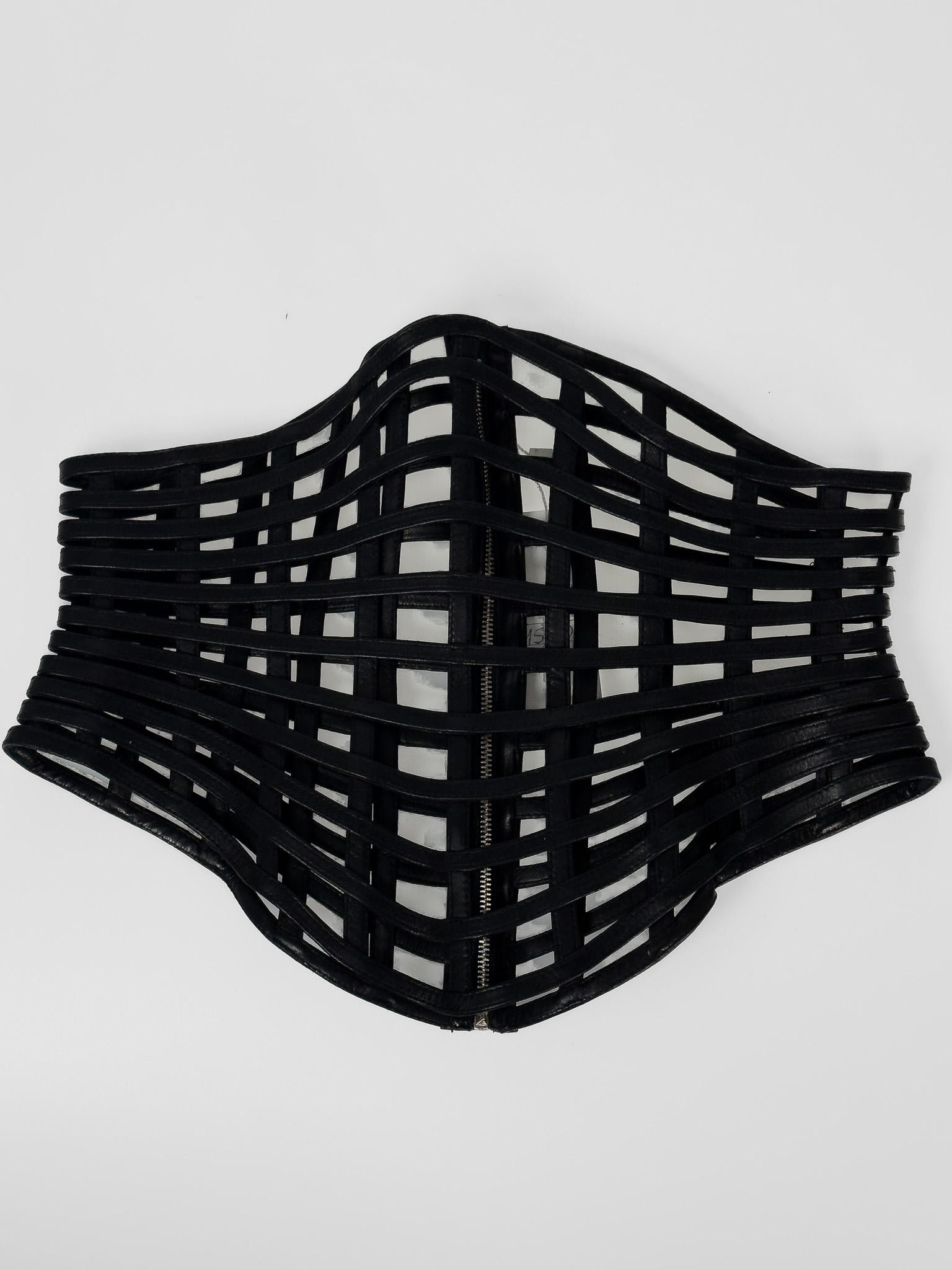 "Czarny, szeroki pasek do talii, gorsetowy krój, zapinany na złoty zamek. Stan bardzo dobry. Wymiary: obwód mierzony w najwęższym miejscu 33cm, szerokość mierzona w najszerszym miejscu 28cm."