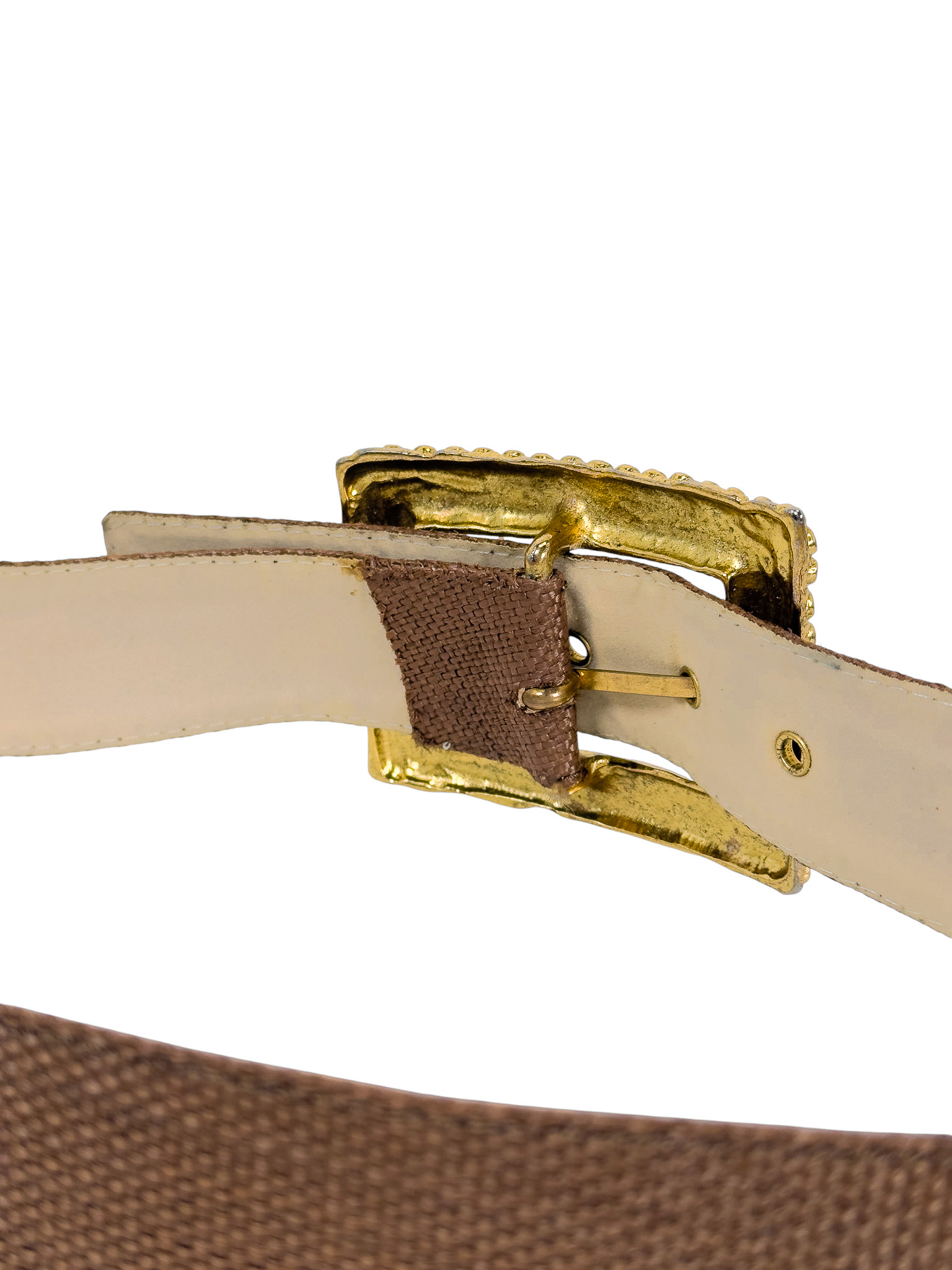 "Brązowy pasek ozdobiony dużą złotą prostokątną klamrą z grawerowanym logo marki, materiałowy, beżowe wnętrze. Stan bardzo dobry, delikatnie zabrudzone wnętrze. Wymiary: długość do ostaniej dziurki 71cm, szerokość 3,5cm."