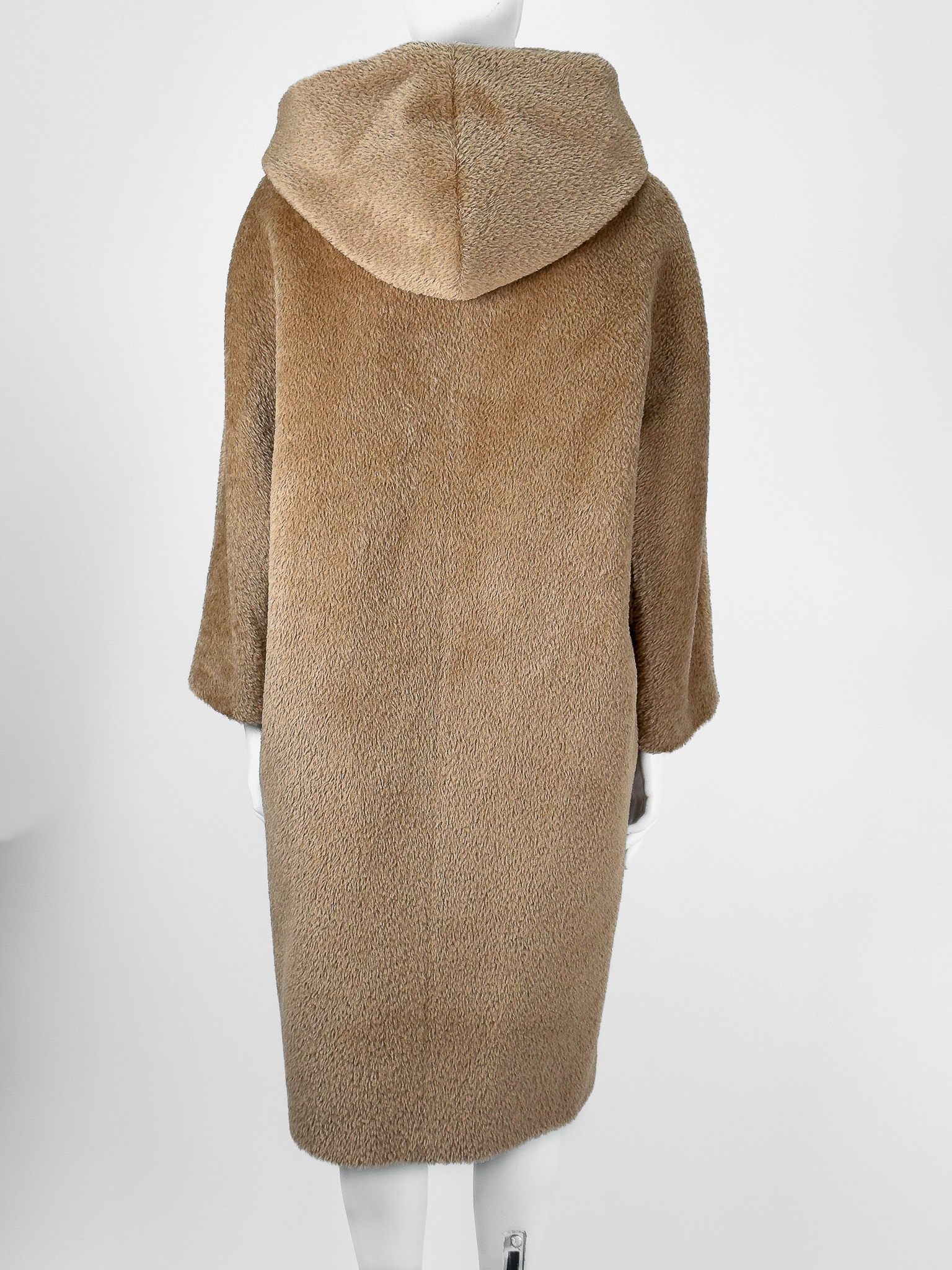 "Długi beżowy płaszcz z misia, zapinany na jeden guzik, kołnierz z kapturem. Rozmiar z. metki IT 40. Skład: 52% alpaka, 48% wełna. Wymiary: szer. ramion 55 cm, szer. biustu 58 cm, szer. talii 60 cm, dł. całkowita 106 cm, dł. rękawa 42 cm."