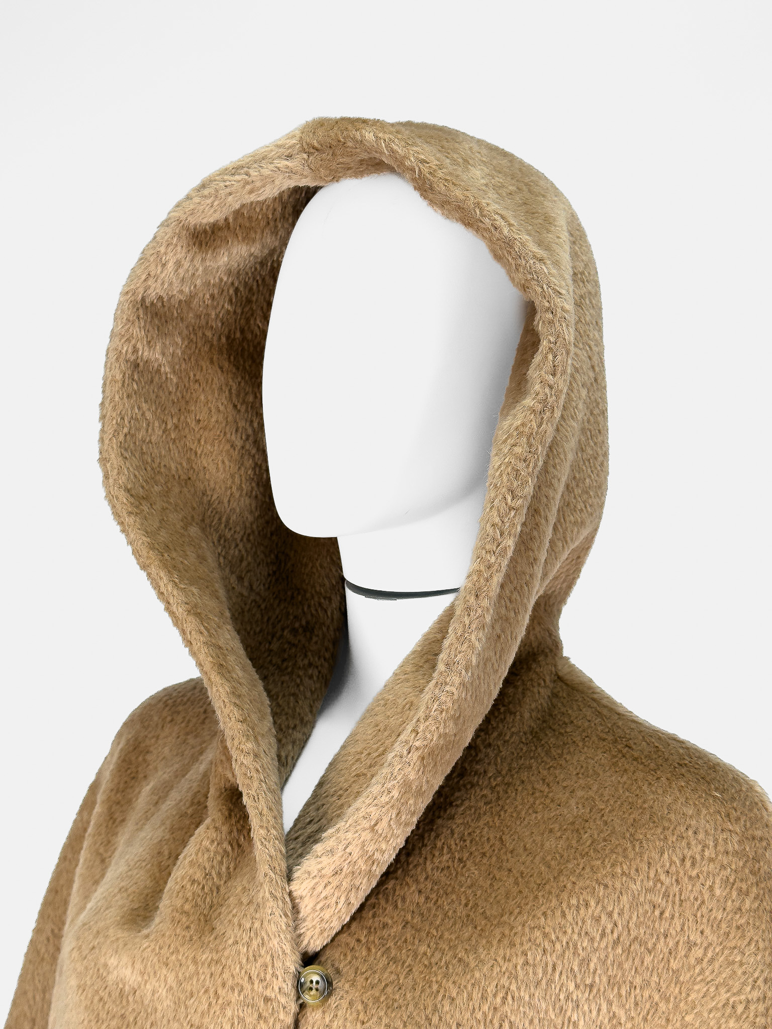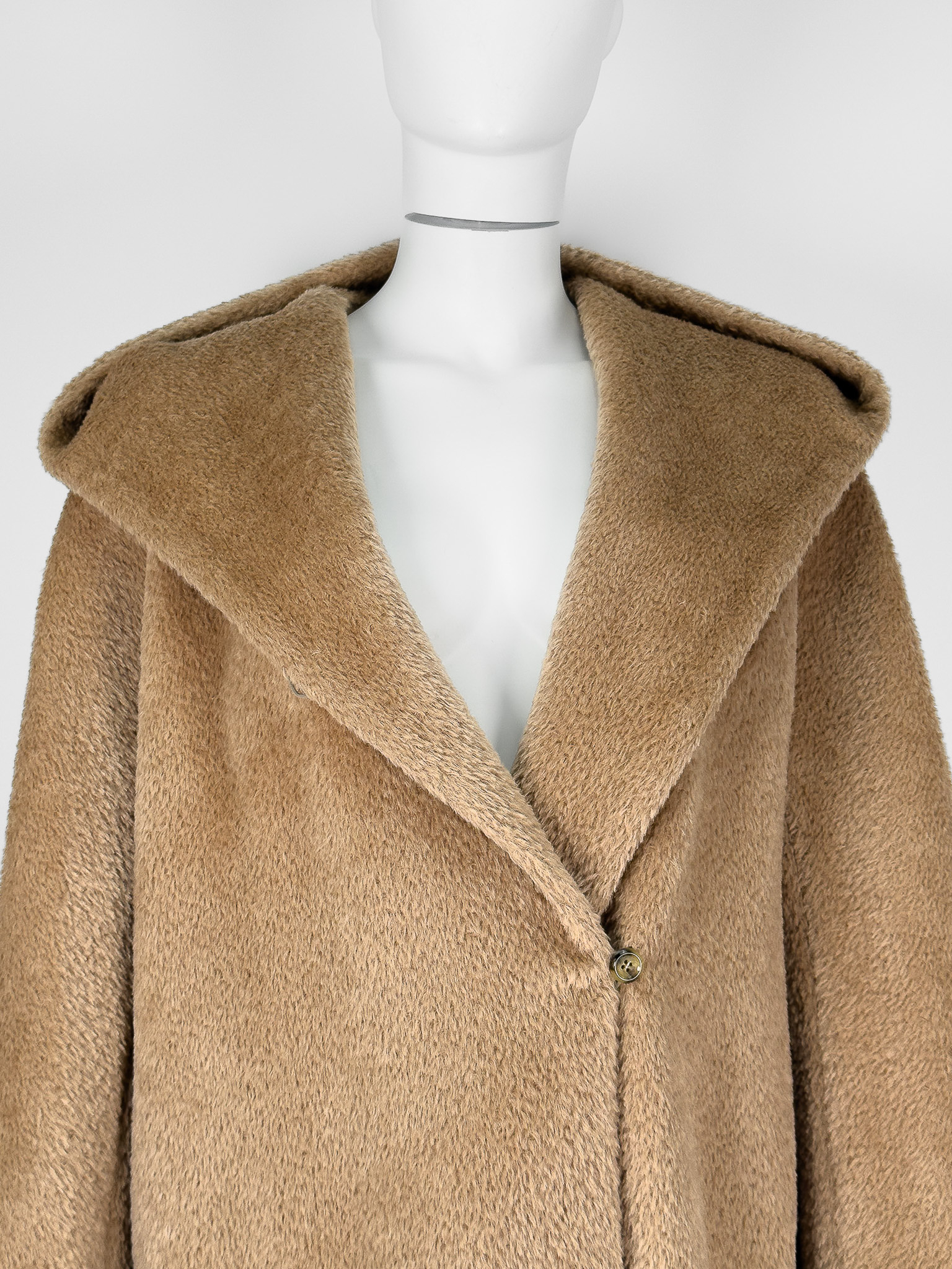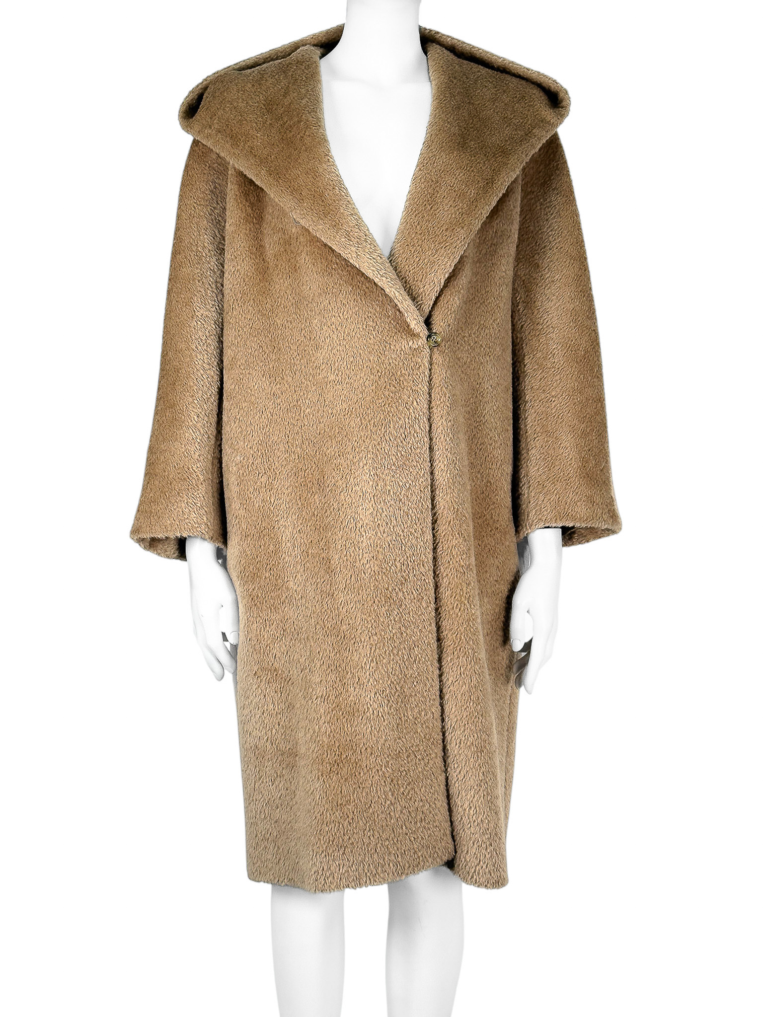 "Długi beżowy płaszcz z misia, zapinany na jeden guzik, kołnierz z kapturem. Rozmiar z. metki IT 40. Skład: 52% alpaka, 48% wełna. Wymiary: szer. ramion 55 cm, szer. biustu 58 cm, szer. talii 60 cm, dł. całkowita 106 cm, dł. rękawa 42 cm."