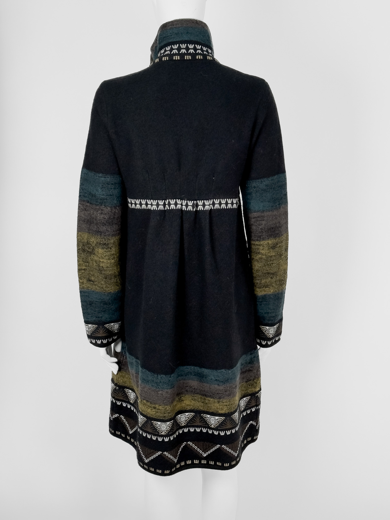"Czarny płaszcz, dwurzędowy, przeszycia w motywie asteckim, brązowo-żółto-niebieskie elementy, kołnierz zapinany na dwa logowane guziki, dwie kieszenie z przodu. Stan bardzo dobry. Brak metki ze składem oraz rozmiarem, została odcięta. Rozmiarowo wypada jak M. Wymiary: szerokość mierzona od pachy do pachy 47cm, długość całkowita 100cm."