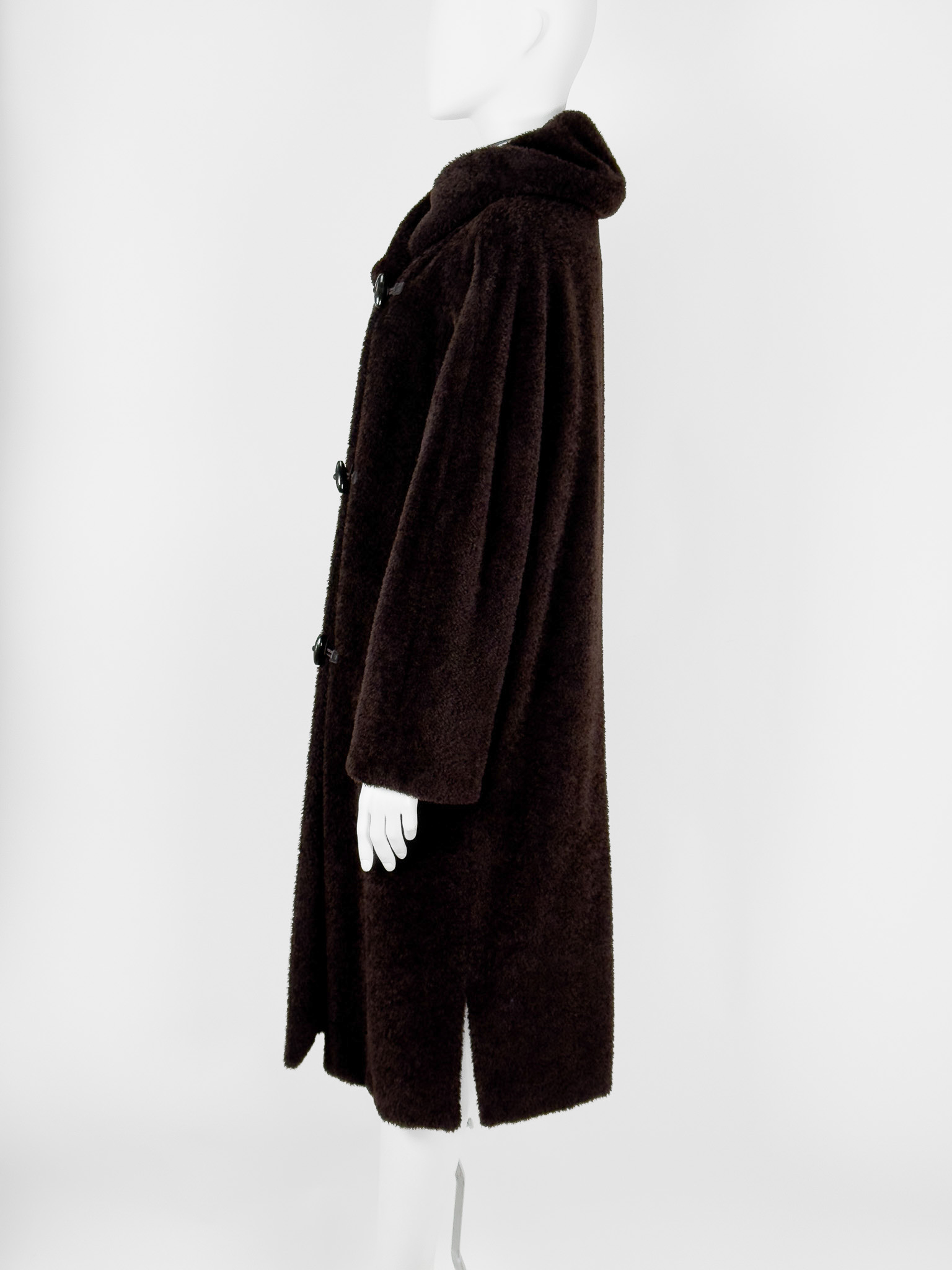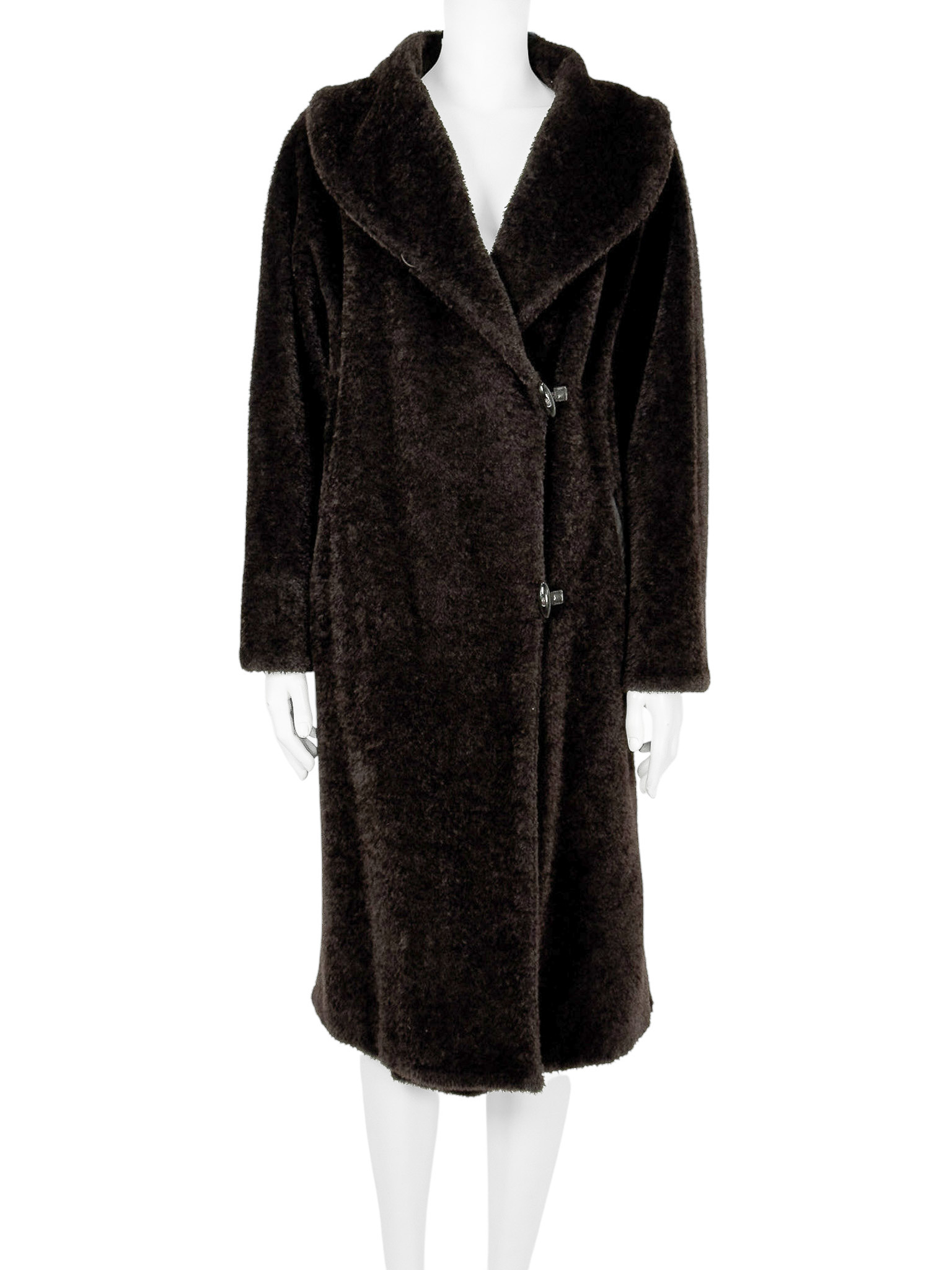 "Brązowy płaszcz zapinany na brązowe drewniane guziki, kołeczki zapinane na haftki. Skórzane wykończenie przy kieszeniach. Skład: 56% alpaka, 44% wełna. Rozmiar z metki IT 42."