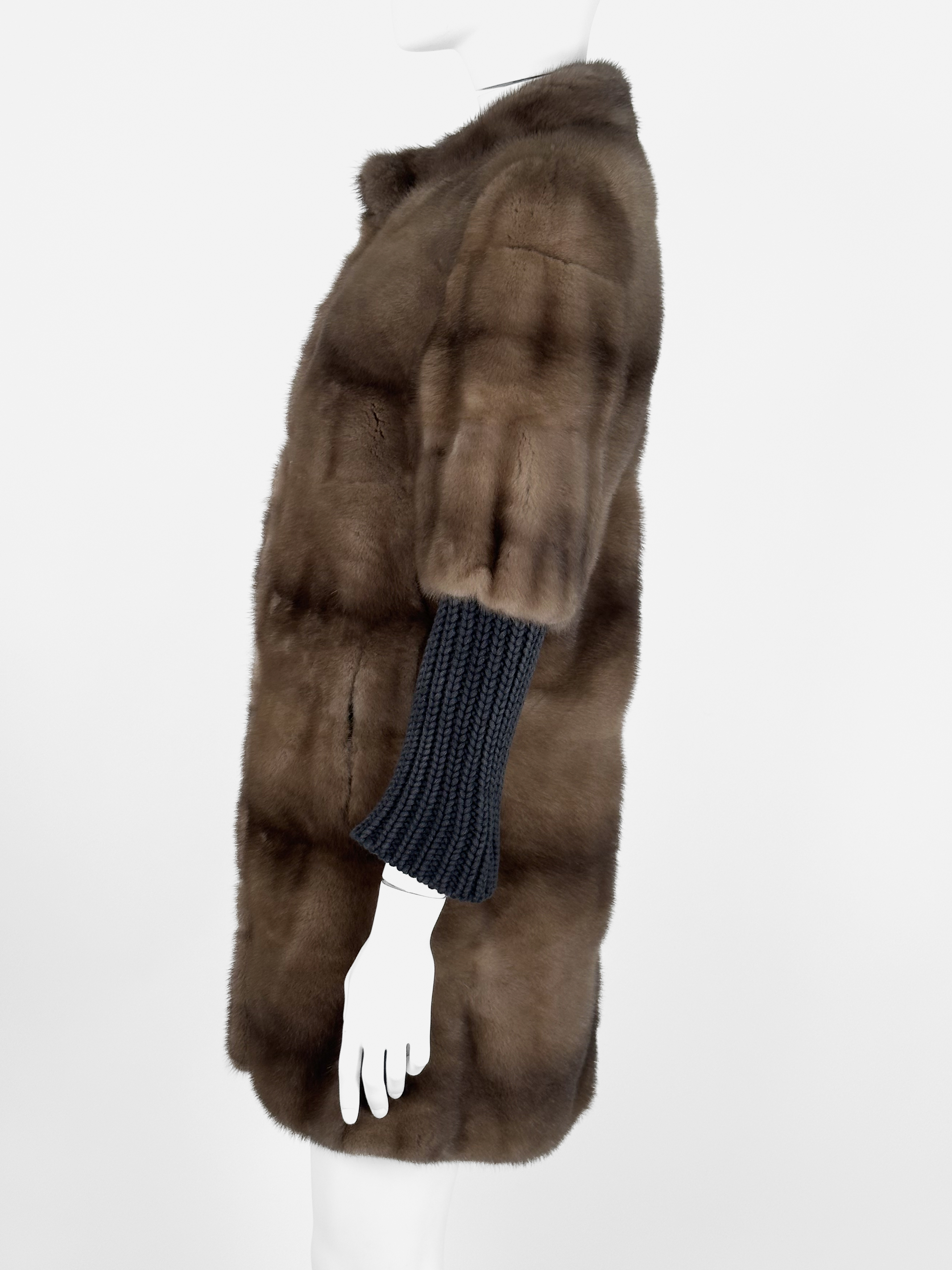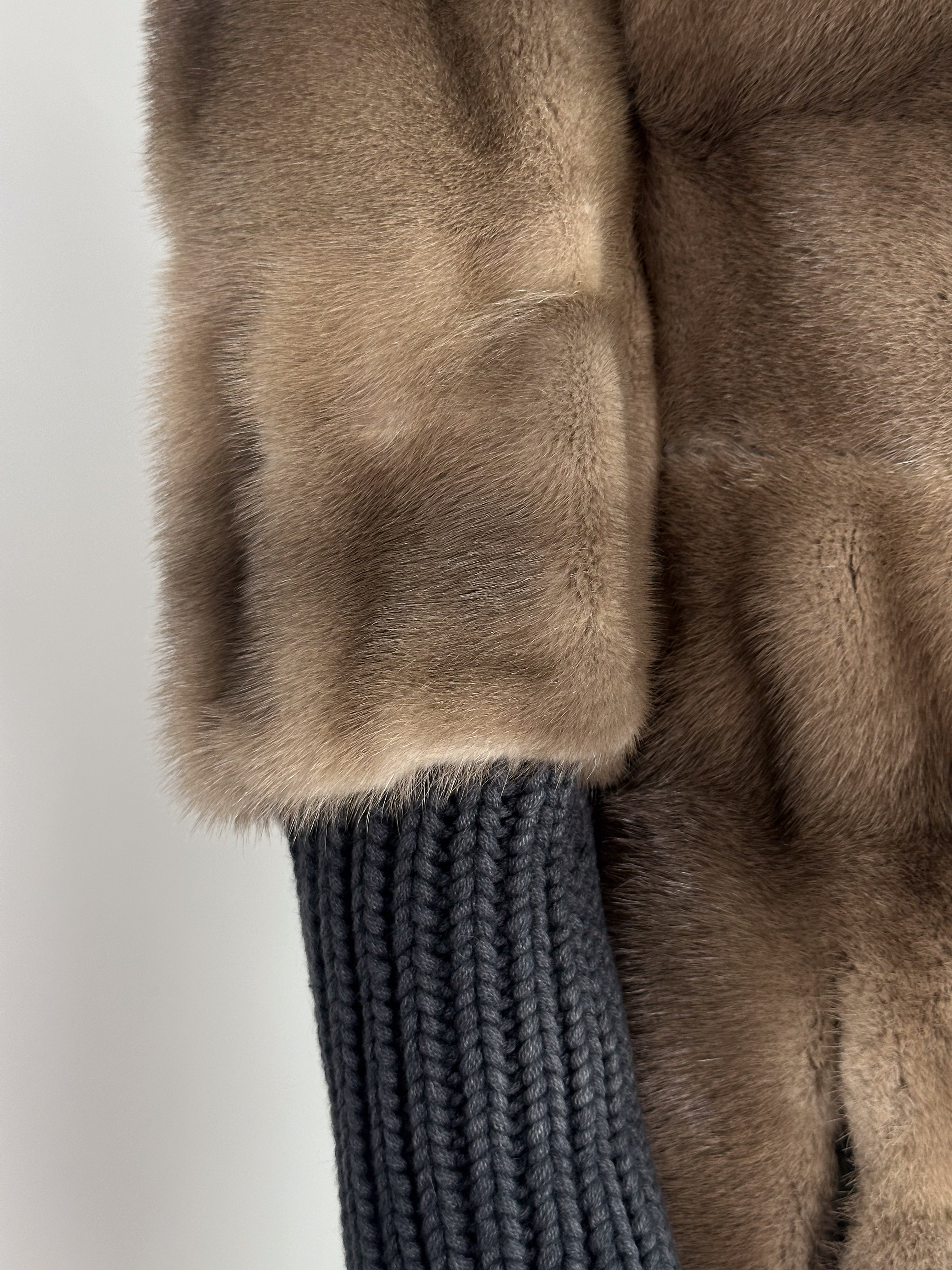 "Szarobeżowy płaszcz z norki zapinany na cztery zapięcia, rękawy wykończone elementem sweterkowym w kolorze szarym.
