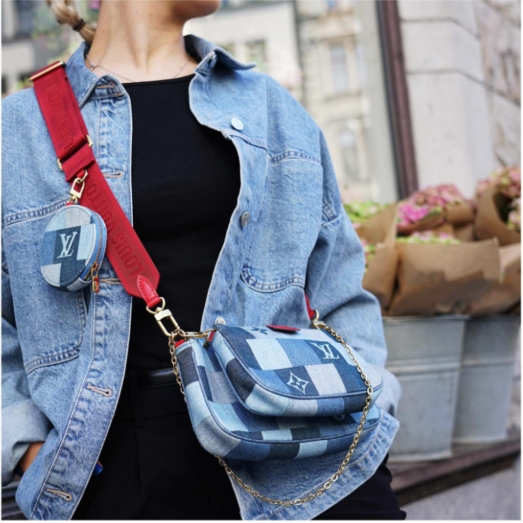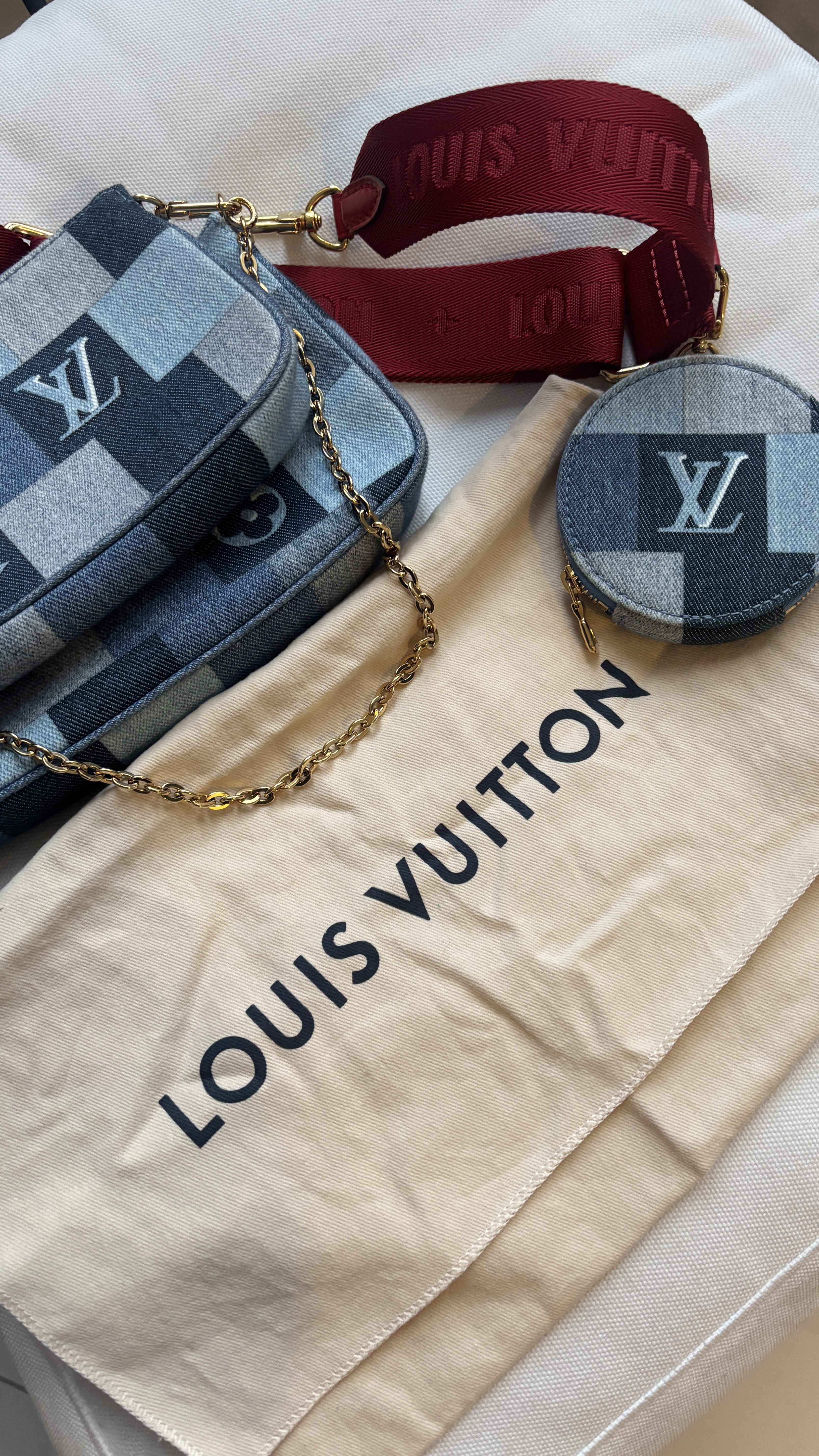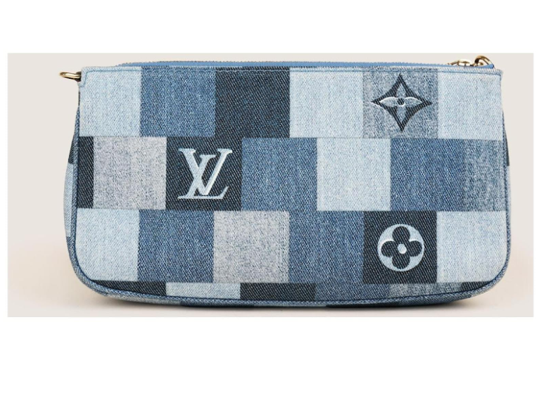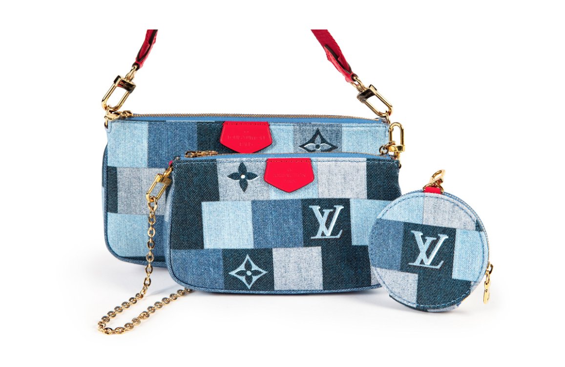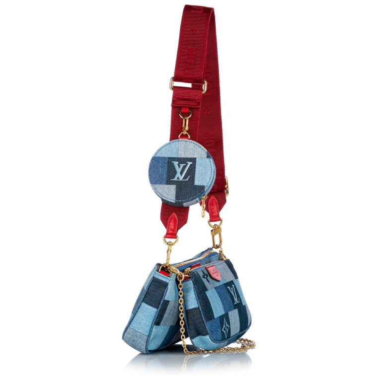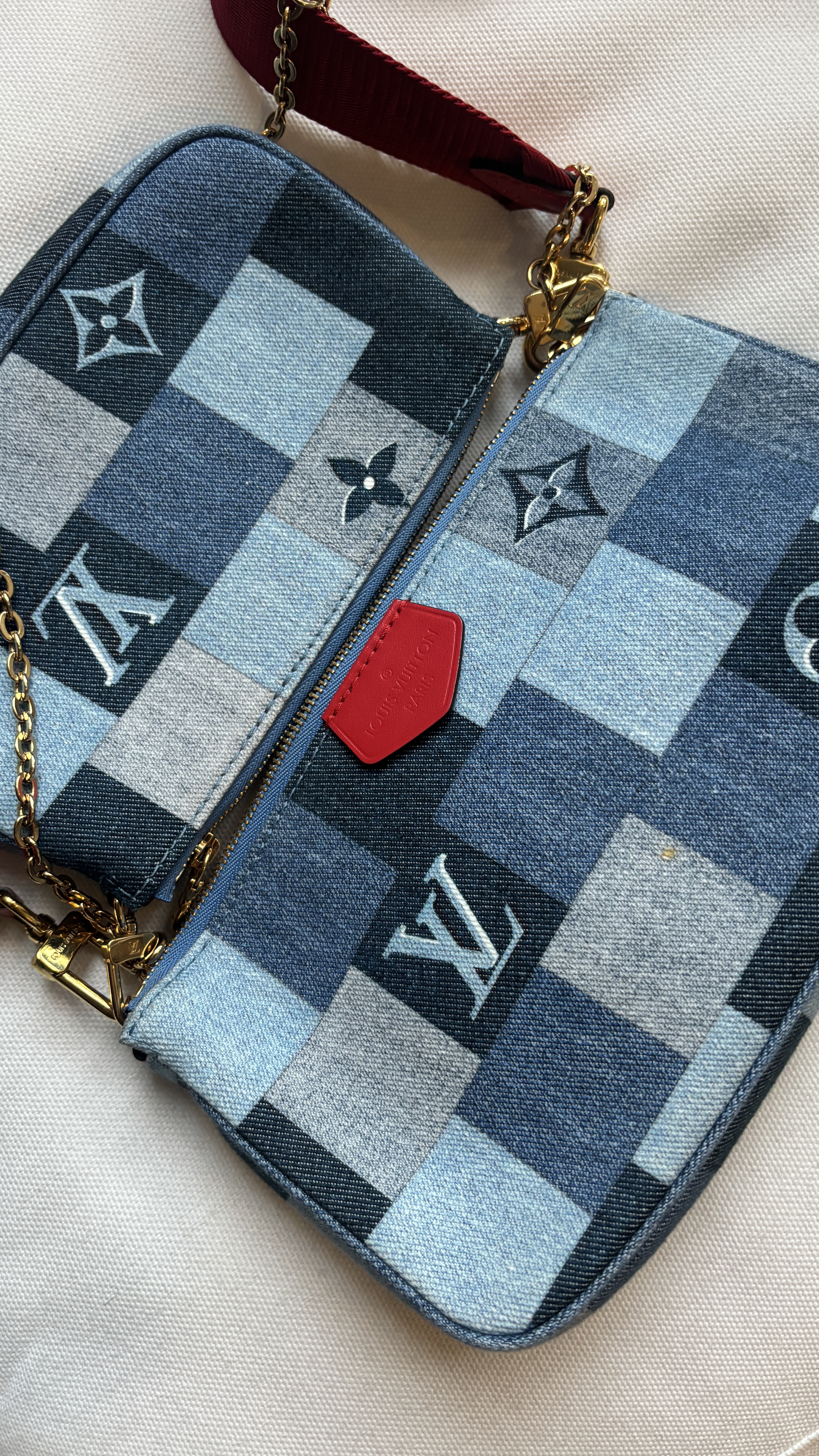 "Denim Damier Monogram Patchwork Multi Pochette, jeansowa torebka w róznych odcieniach niebieskiego, czerwony materiałowy pasek crossbody, złote okucia. Worek przeciwkurzowy w komplecie. Stan idealny. Kolekcja z 2020 r, limitowana, swtorzona z okazji Chińskiego Nowego roku. Potwierdzenie zakupu w komplecie."
