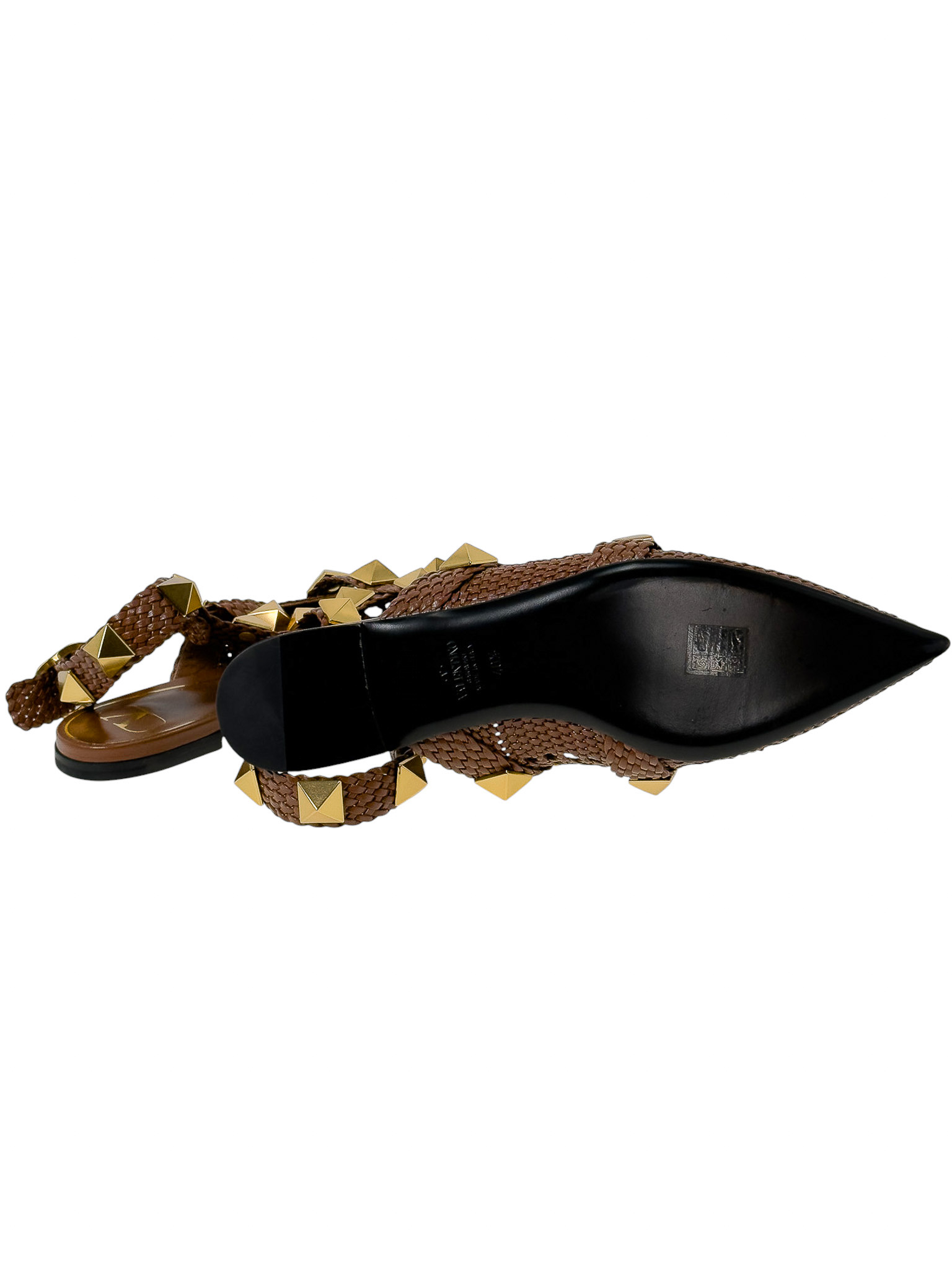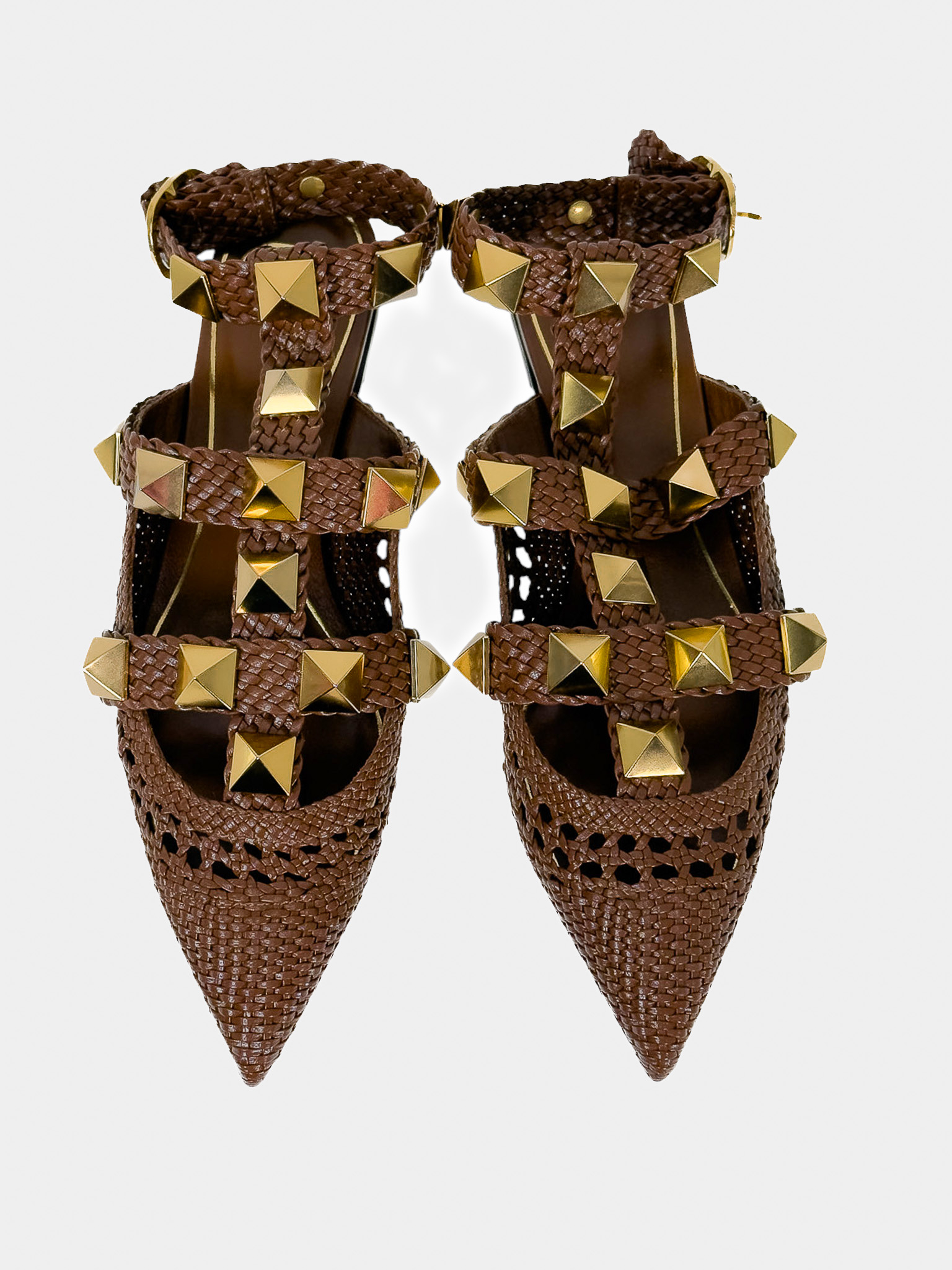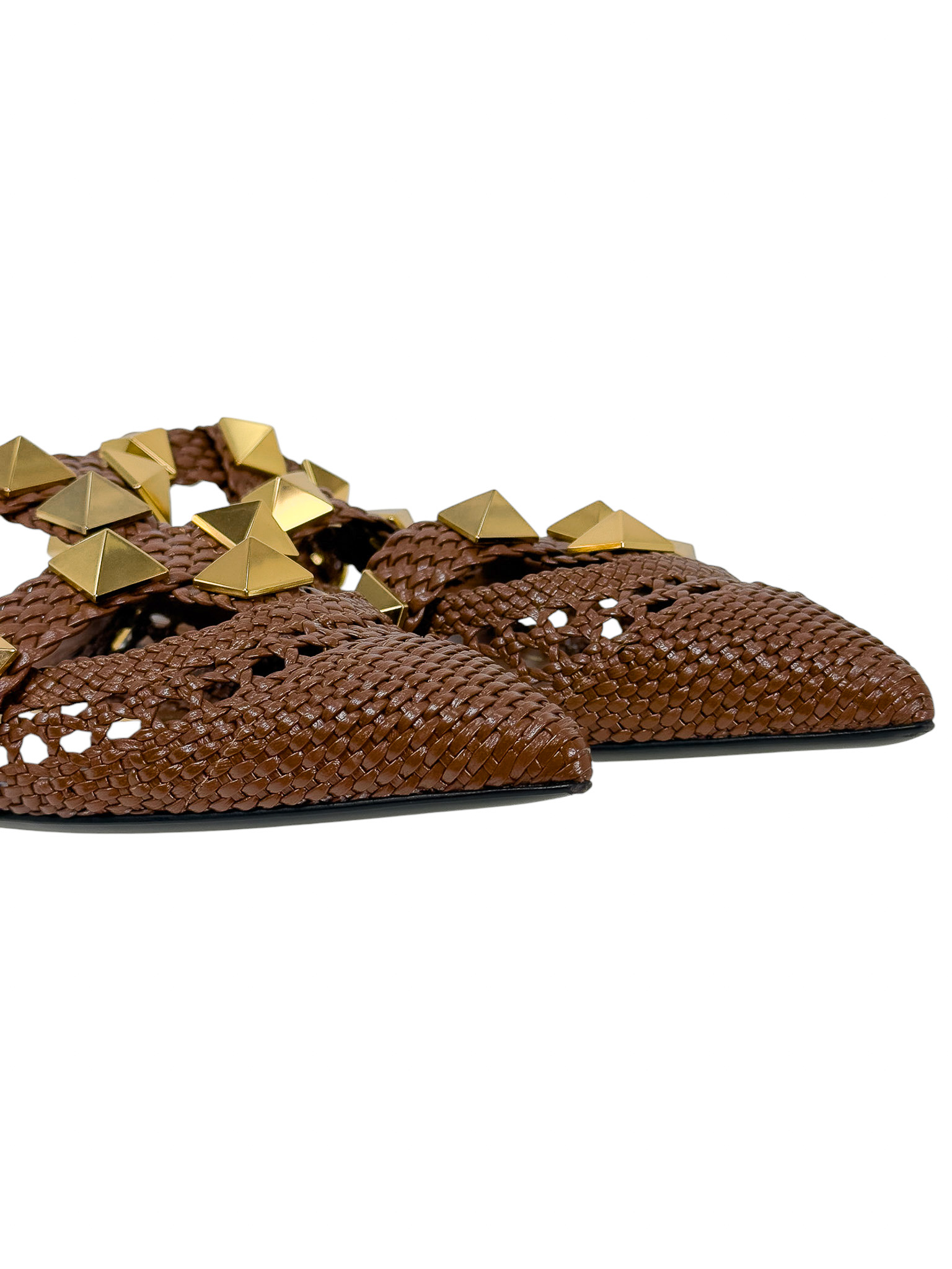 "Brązowe skórzane sandały wykonane z plecionej skóry, ozdobione dużymi złotymi ćwiekami, nosek w szpic, miejscami ażurowe, odkryta pięta, regulowany pasek wokół kostki, niski obcas. Stan idealny, minimalne przetarcia na podeszwie. Rozmiar 40,5."