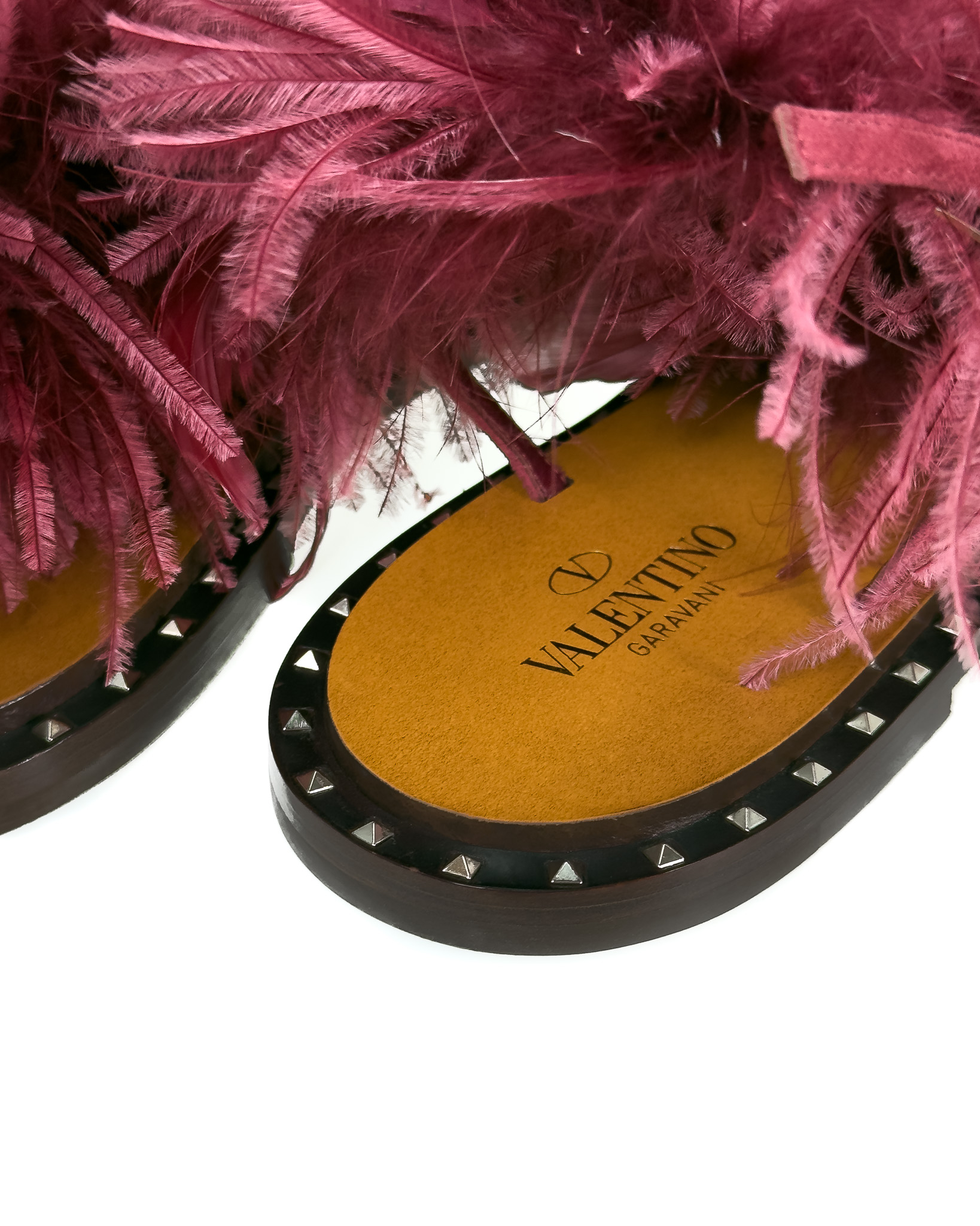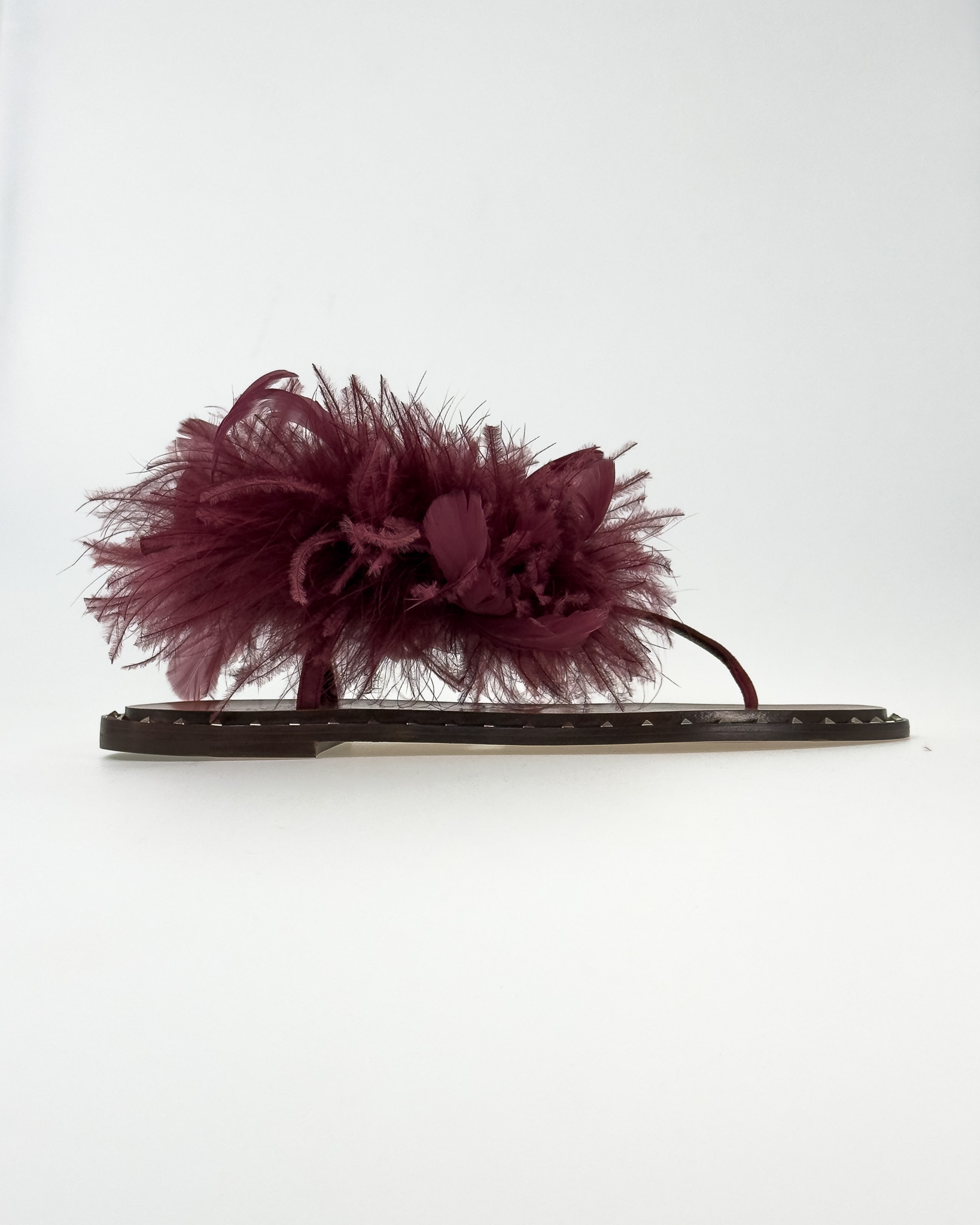 "Bordowe sandały ozdobione piórami na paskach oraz złotymi ćwiekami, typu japonki, odkryte palce oraz pięta, zapinane w bocznej części na sprzączkę, niski obcas, zaokrąglone noski, camelowa wkładka. Stan nowe. Rozmiar 40."