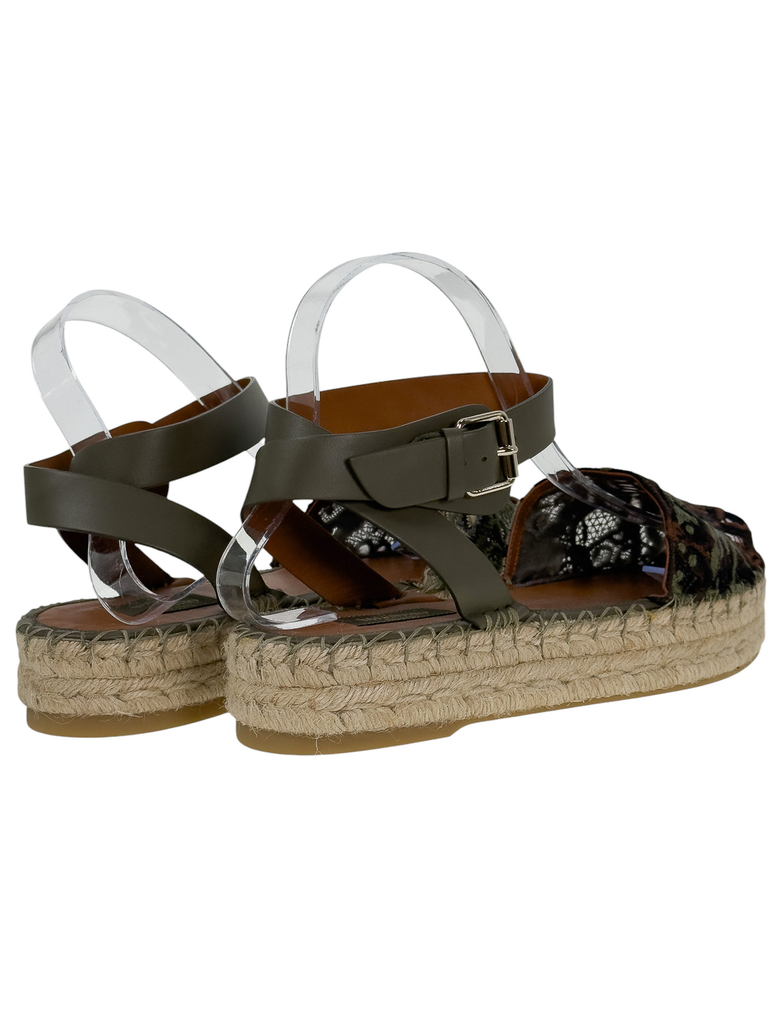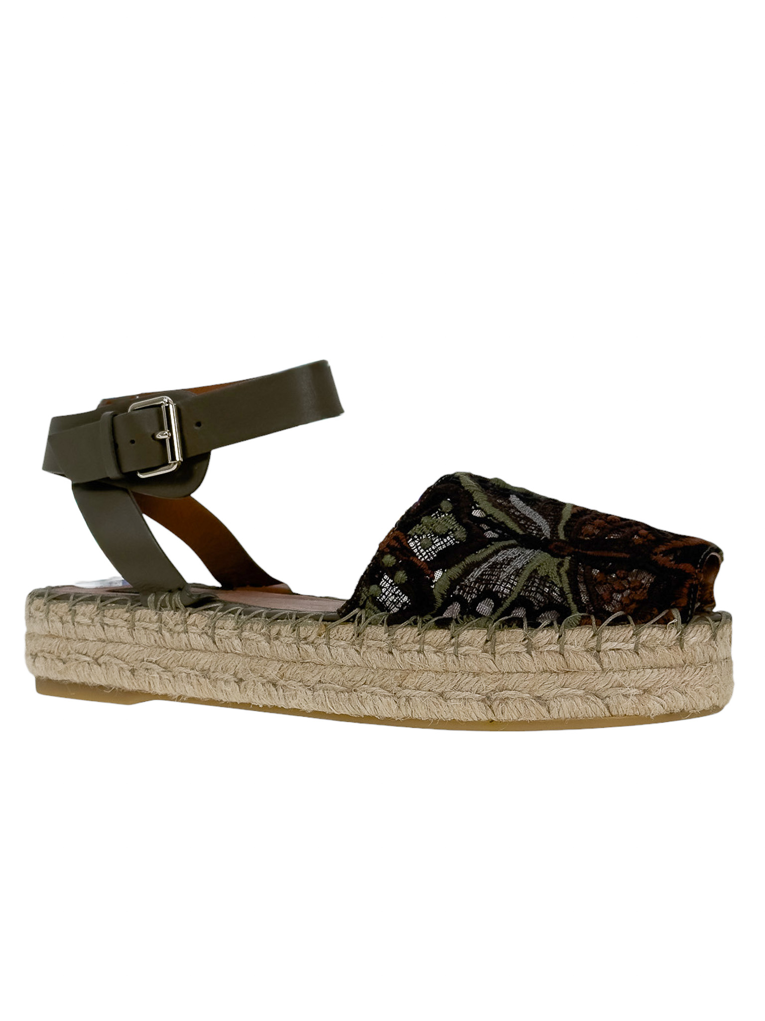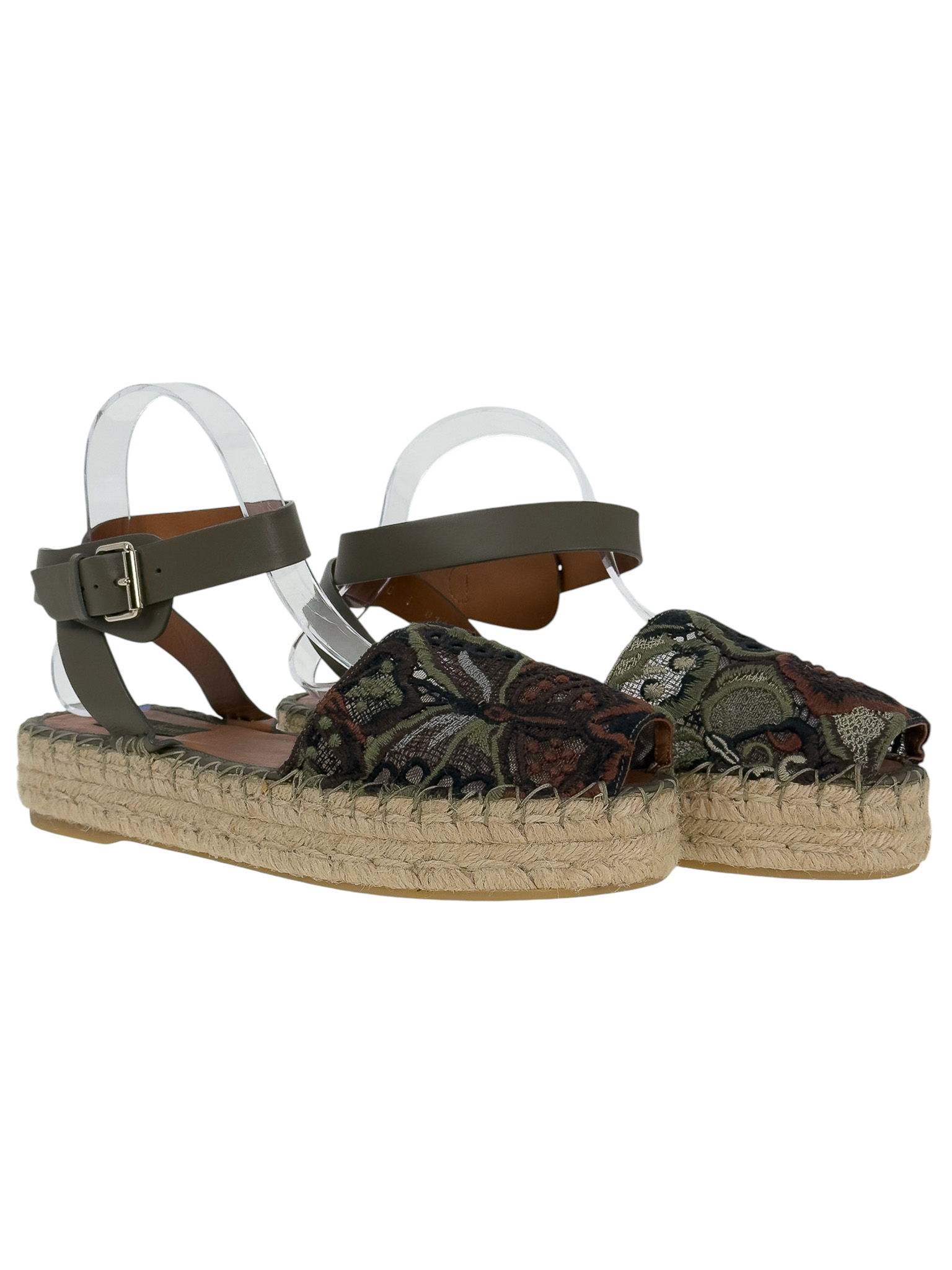 "Sandały w odcieniach khaki oraz brązu, na słomkowej platformie, brązowo-czarno-zielona wyszywana, miejscami transparentna grafika motyla w przedniej części, skórzany pasek zapinany wokół kostki, wykończony złotą sprzączką, migdałowe noski, wycięcie na palce przodzie, skórzana brązowa wkładka. Stan nowe. Rozmiar 40."