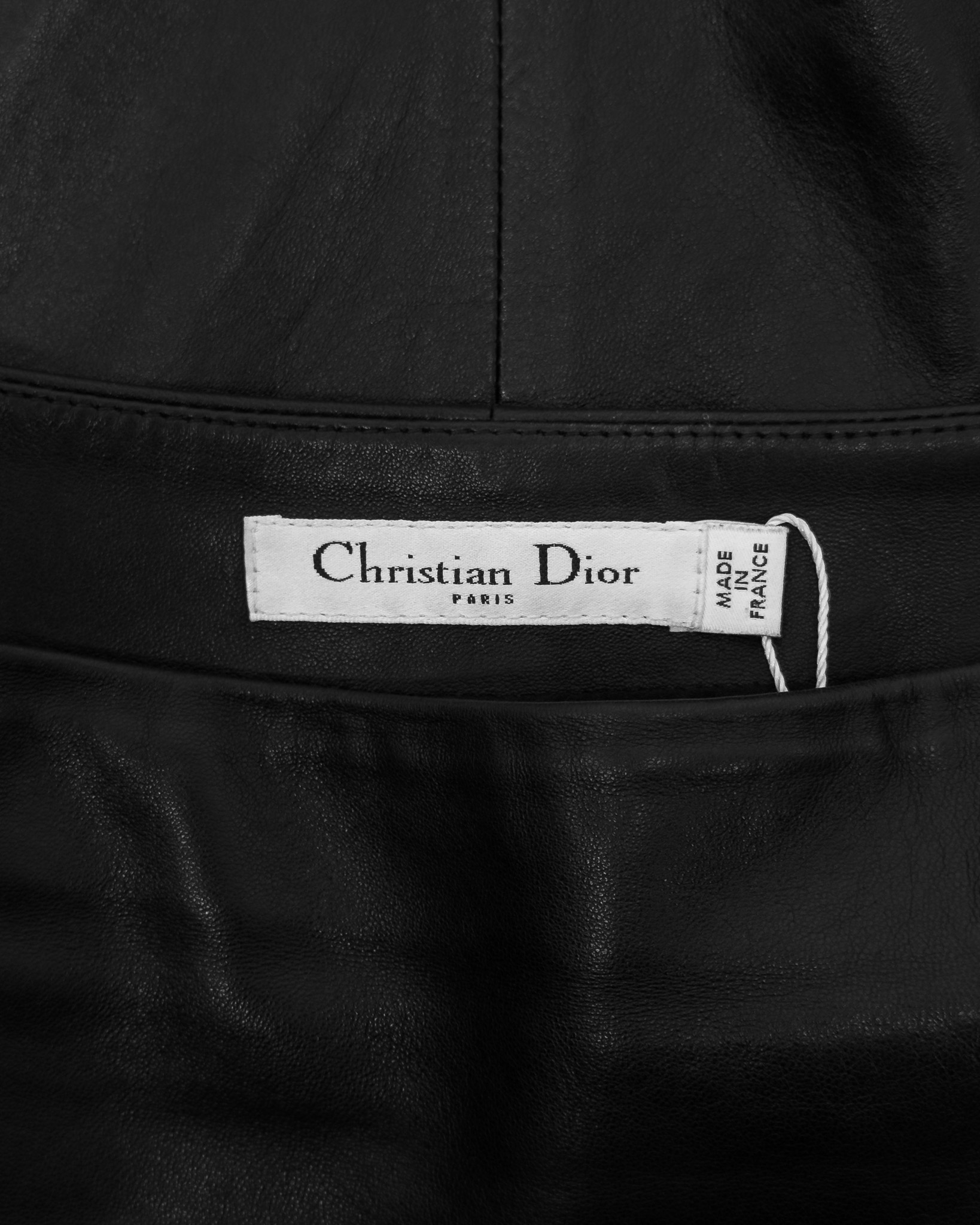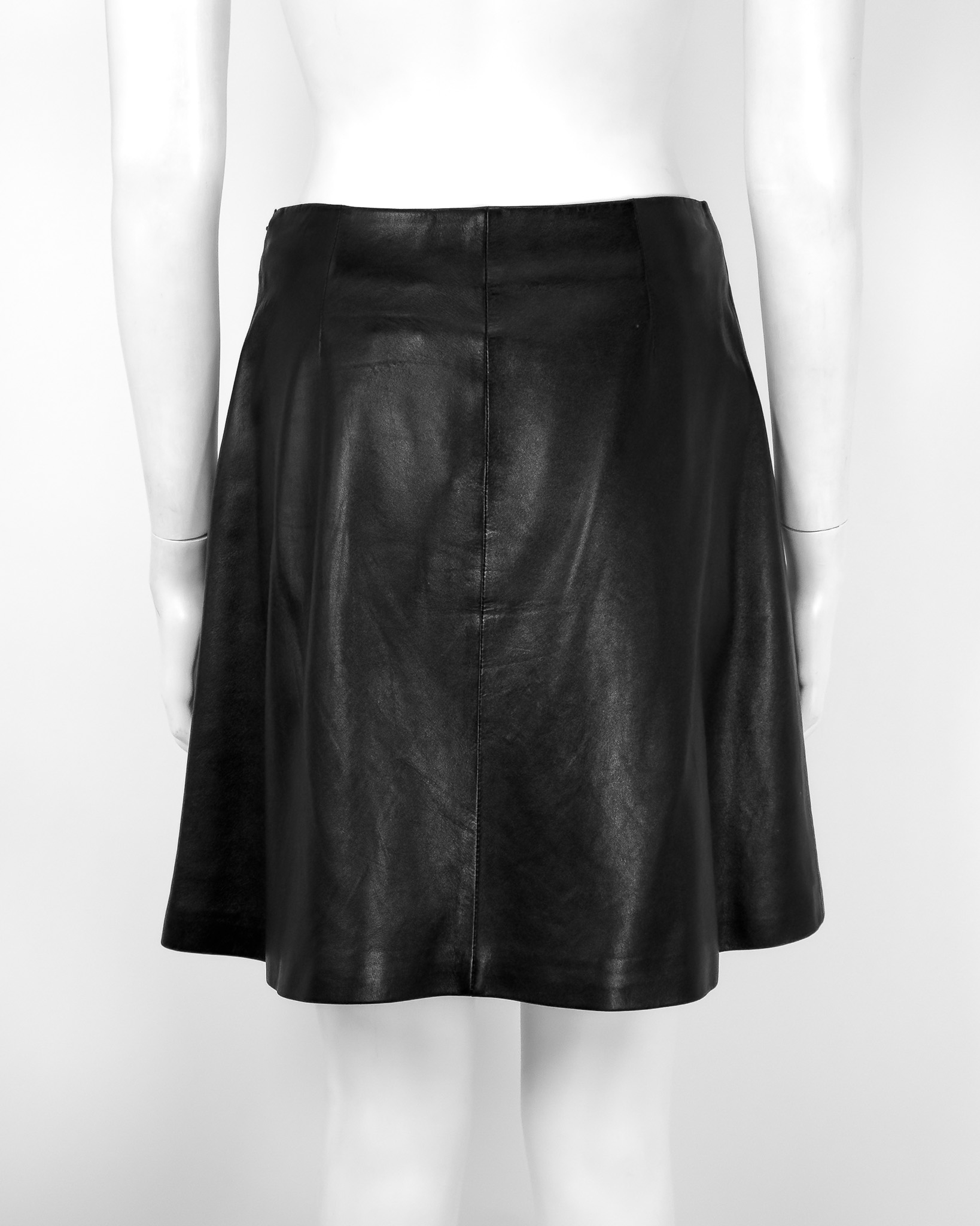 "Czarna skórzana rozkloszowana spódnica z rozcięciem ozdobionym plisowanym materiałem, długość przed kolano, zapinana w bocznej części na suwak. Wycięta metka ze składem. Wymiary: szerokość w pasie 35cm, długość całkowita 47cm."