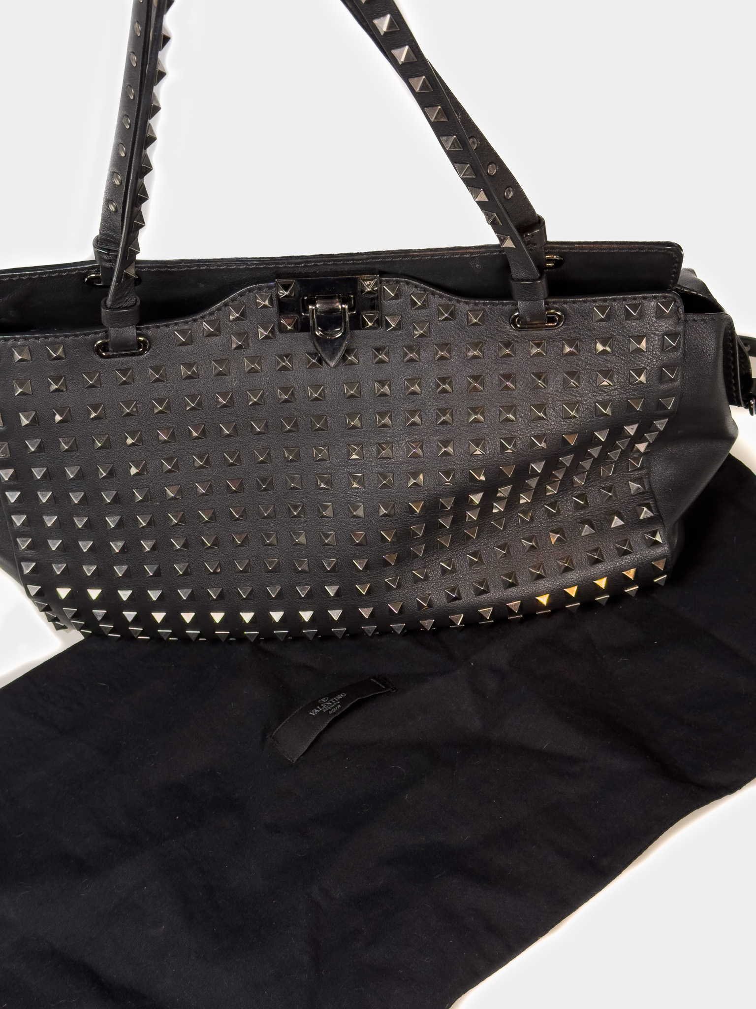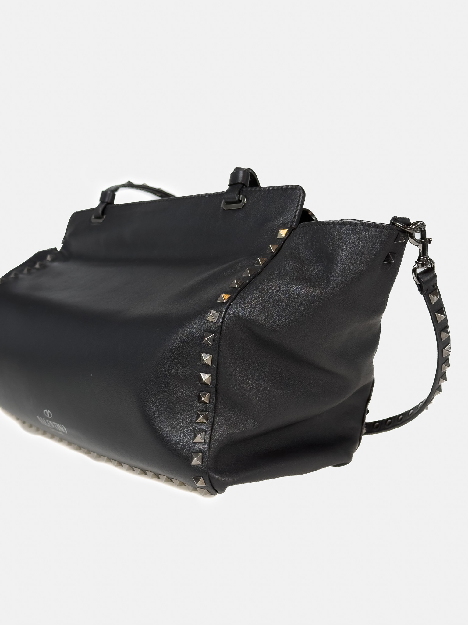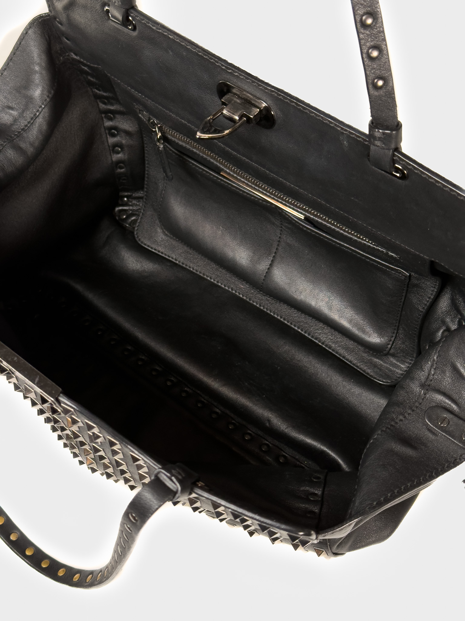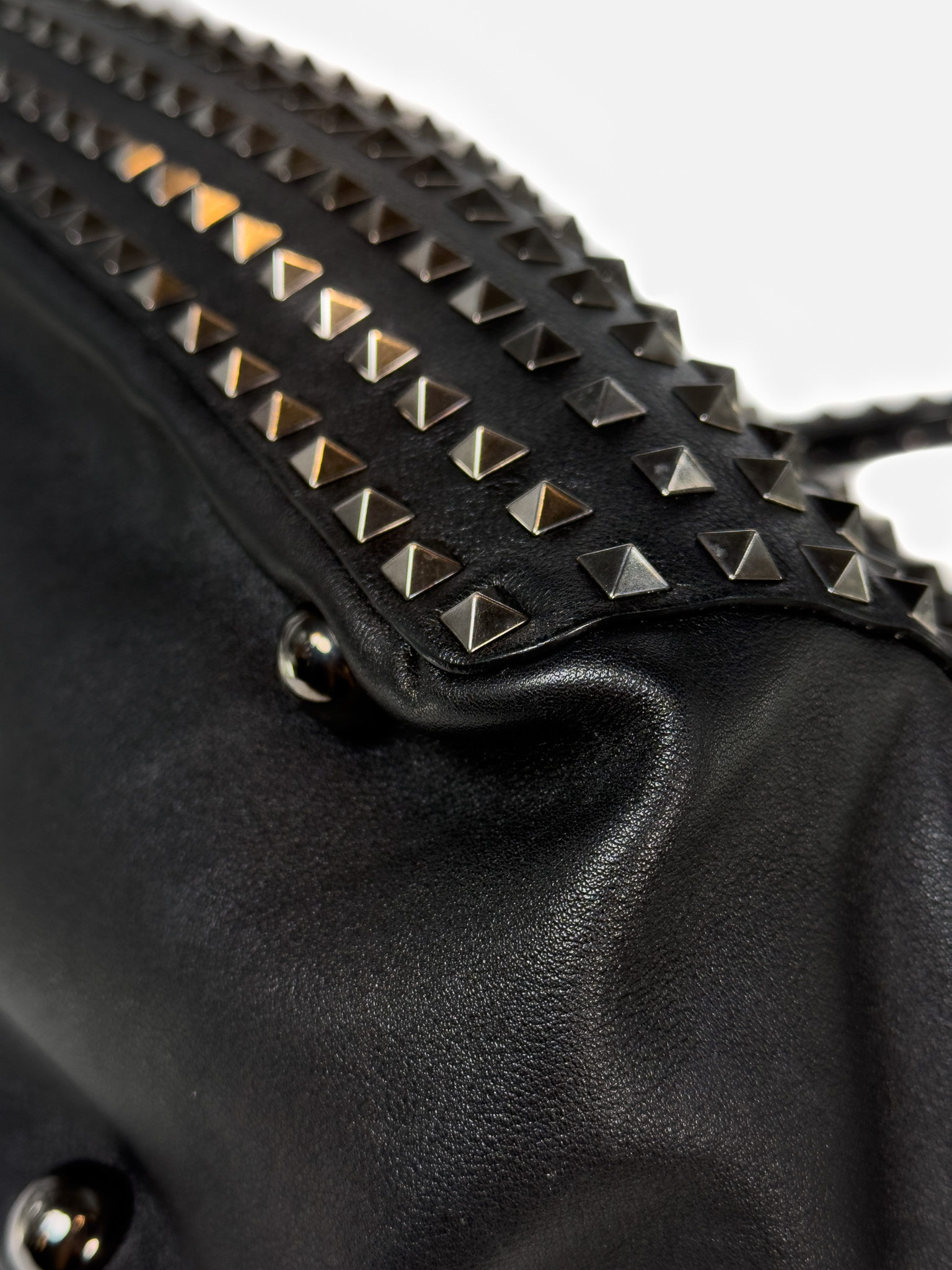 "Czarna, skórzana torebka ozdobiona ćwiekami, posiada pasek i rączki, metalowe okucia. Worek przeciwkurzowy w komplecie. Stan bardzo dobry, okucia posiadają zarysowania (przy zapięciu oraz w podstawie. Wymiary: szerokość 33cm, wysokość 21cm, głębokość 12cm."