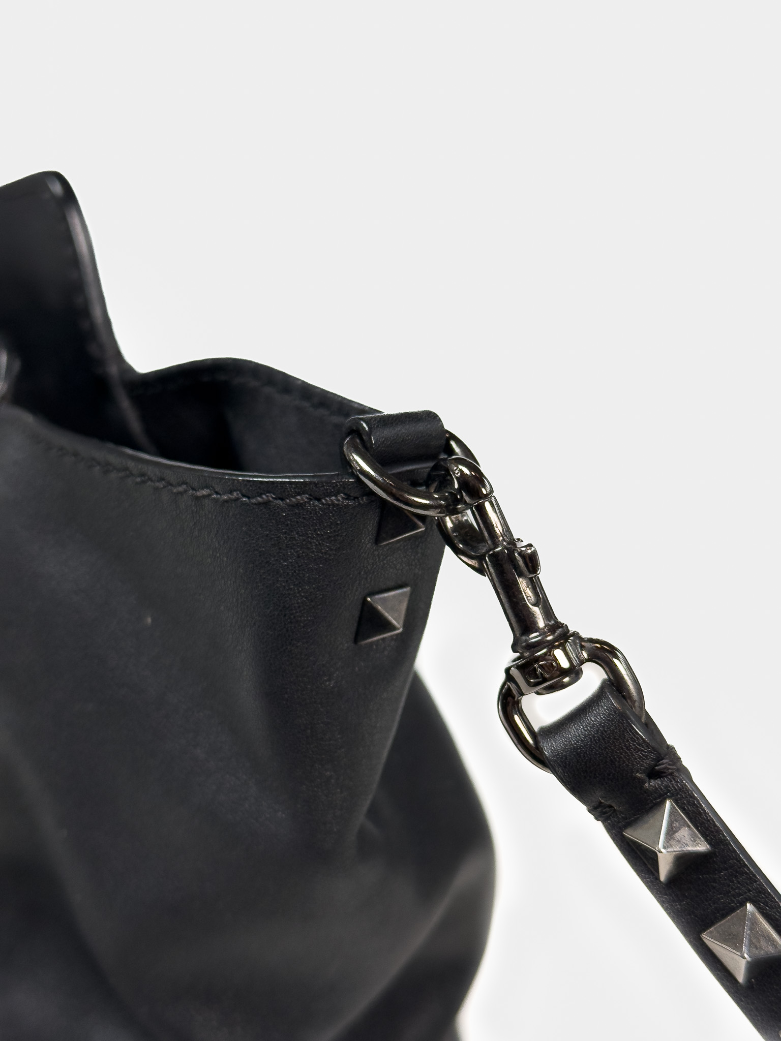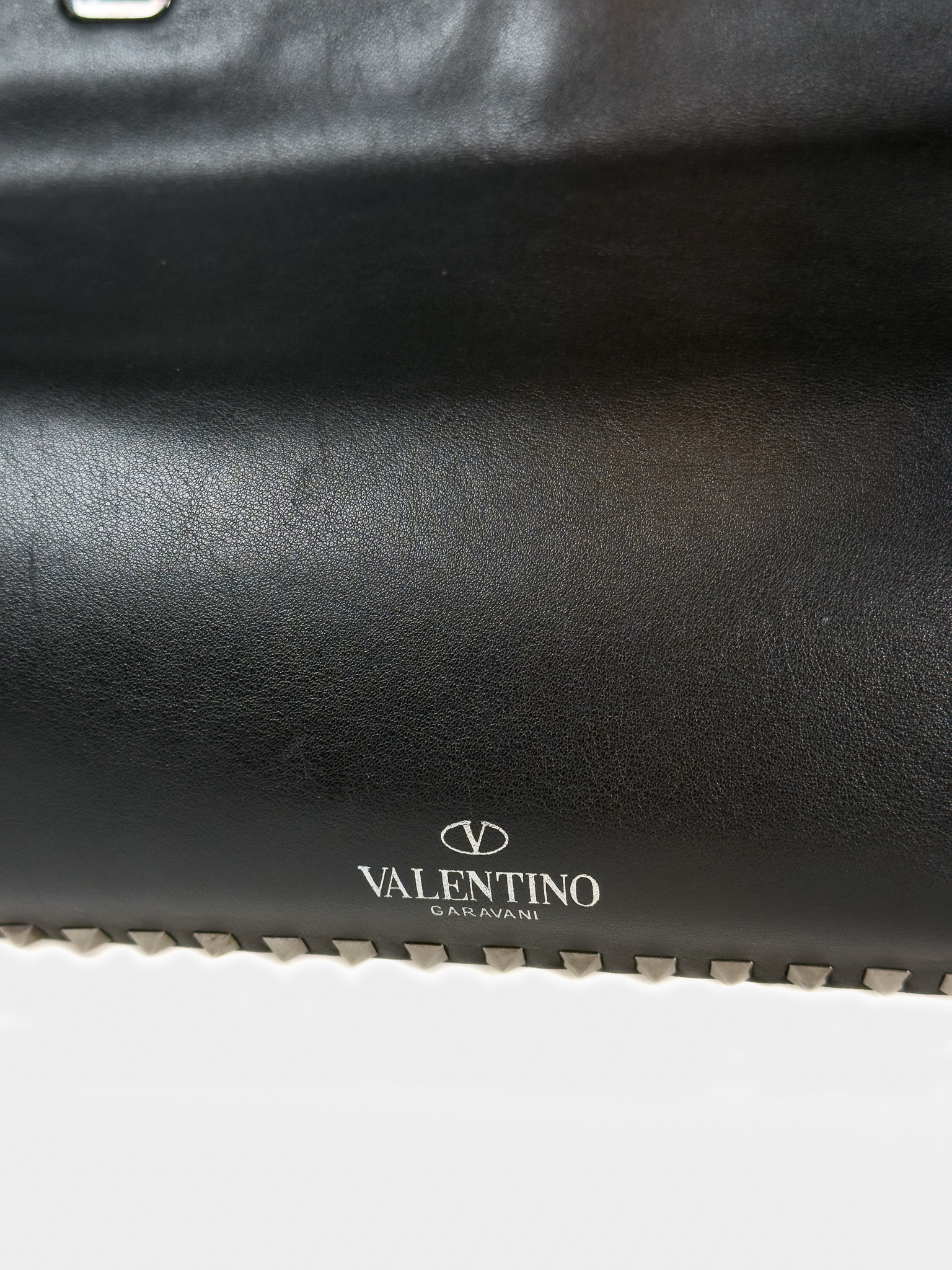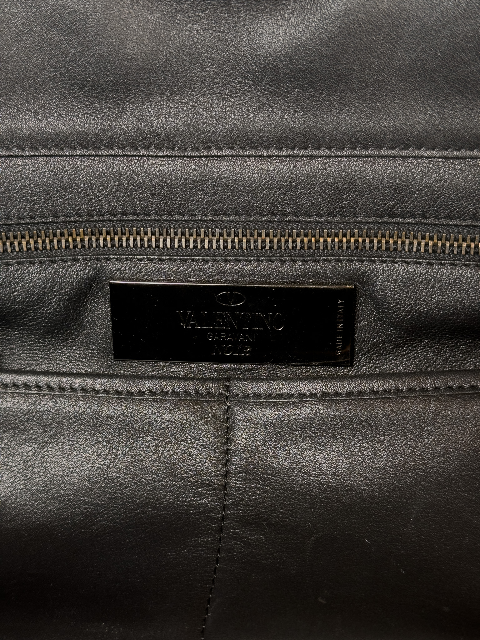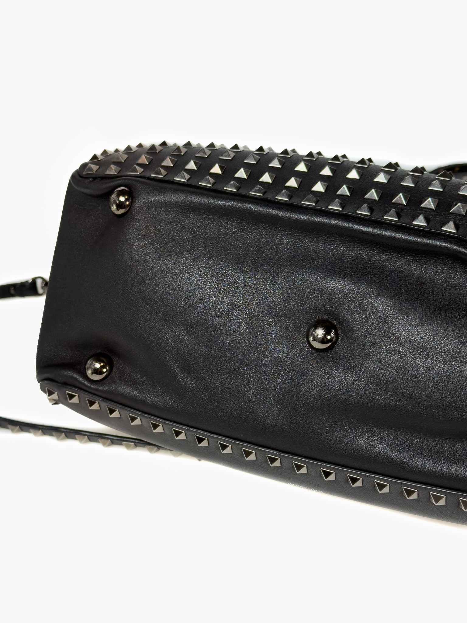 "Czarna, skórzana torebka ozdobiona ćwiekami, posiada pasek i rączki, metalowe okucia. Worek przeciwkurzowy w komplecie. Stan bardzo dobry, okucia posiadają zarysowania (przy zapięciu oraz w podstawie. Wymiary: szerokość 33cm, wysokość 21cm, głębokość 12cm."