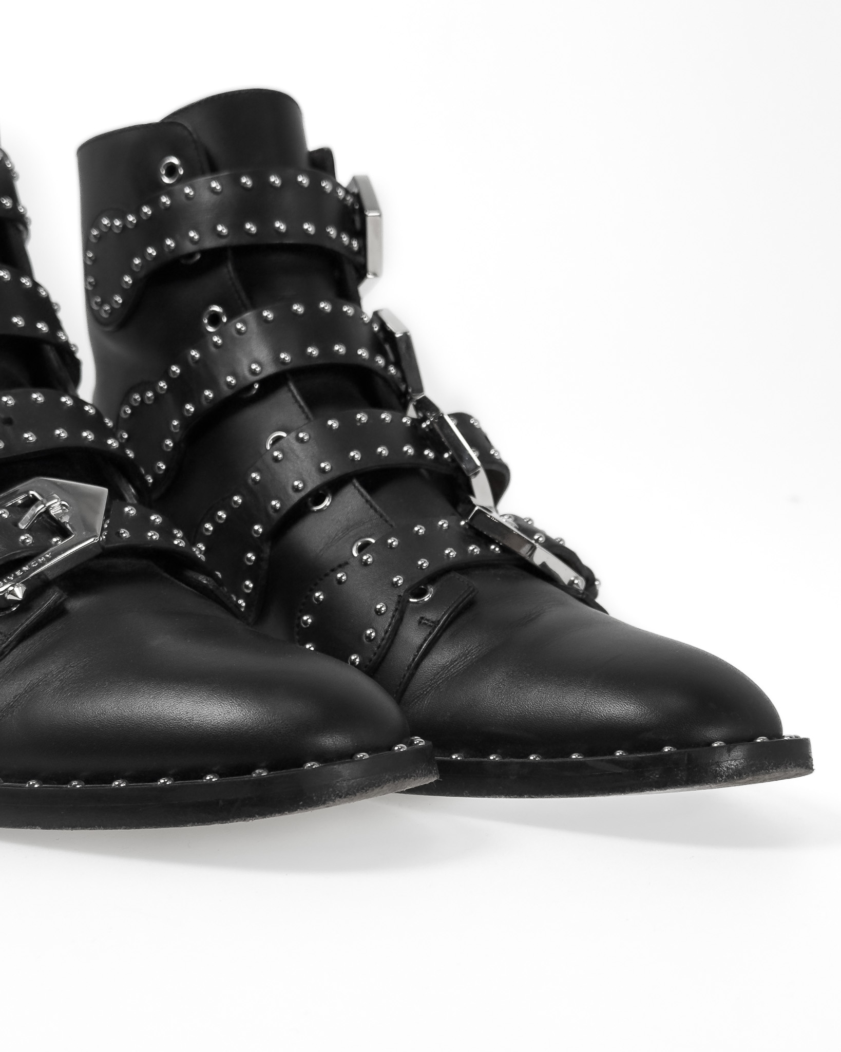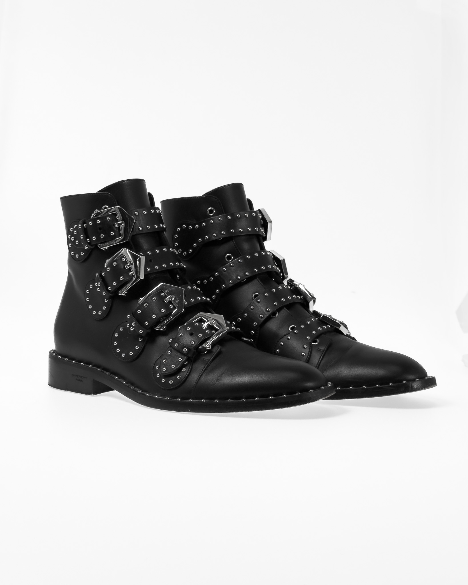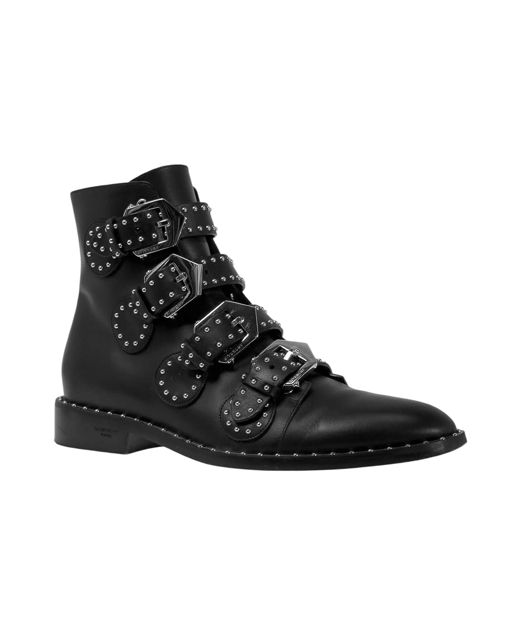"Skórzane czarne botki ze srebrnymi dżetami, zapinane na cztery paski z logowanymi sprzączkami, niski obcas, brązowe wnętrze, w zestawie z pudełkiem. Stan bardzo dobry, posiadają ślady użytkowania na podeszwie. Rozmiar 38."