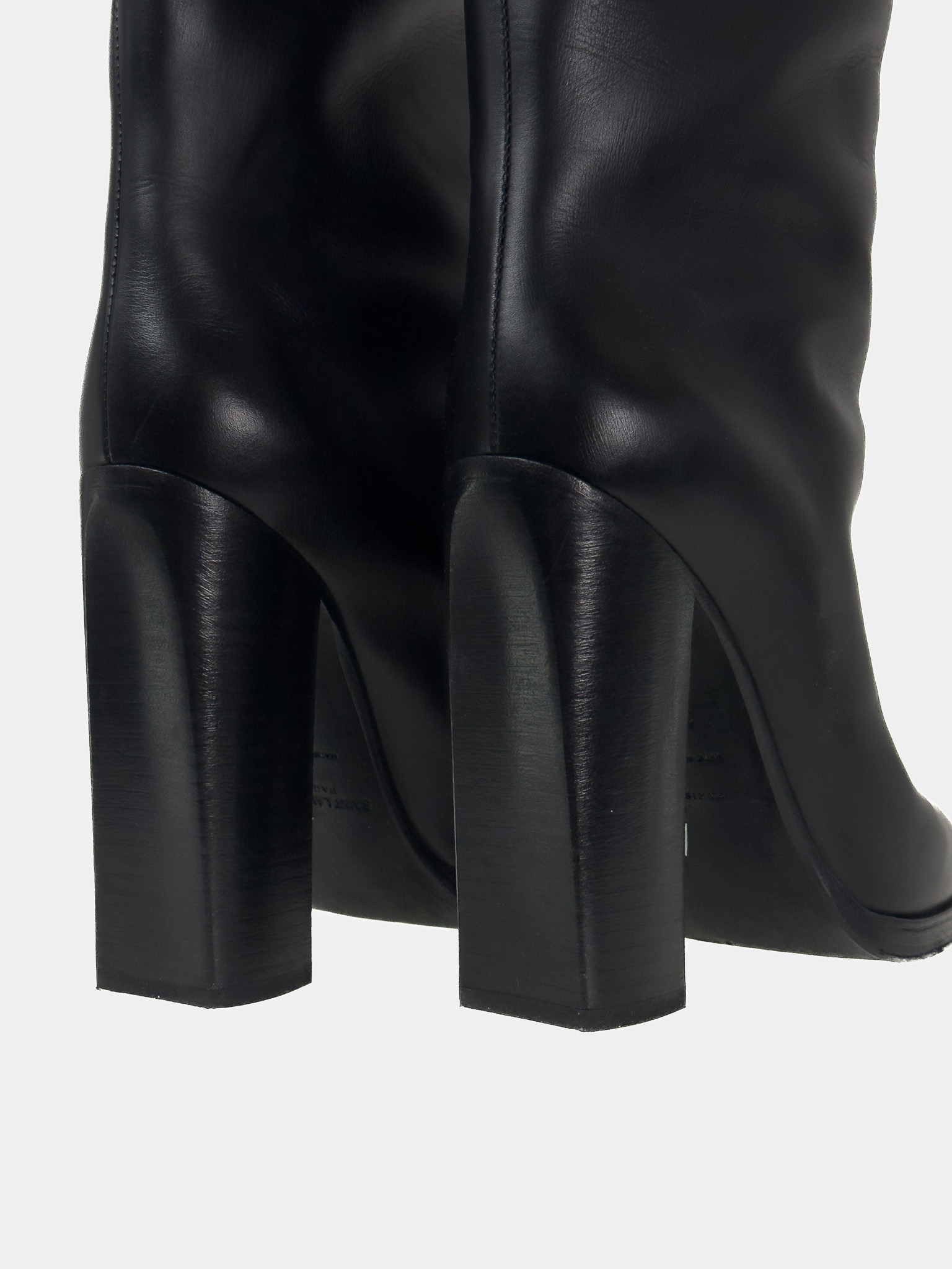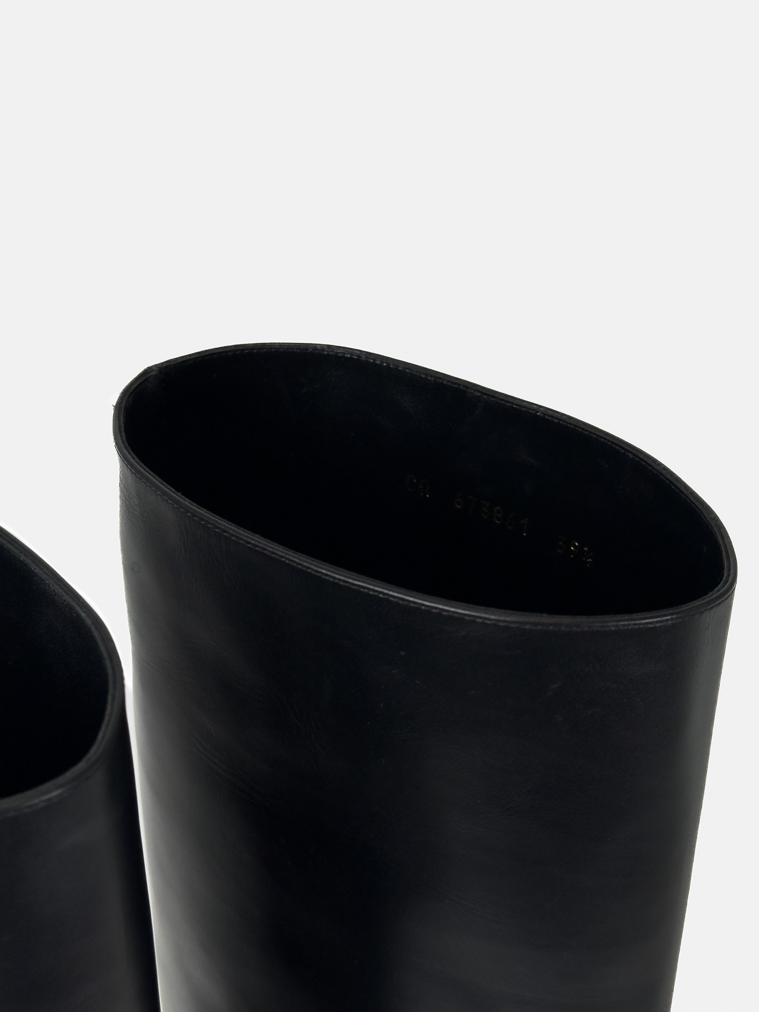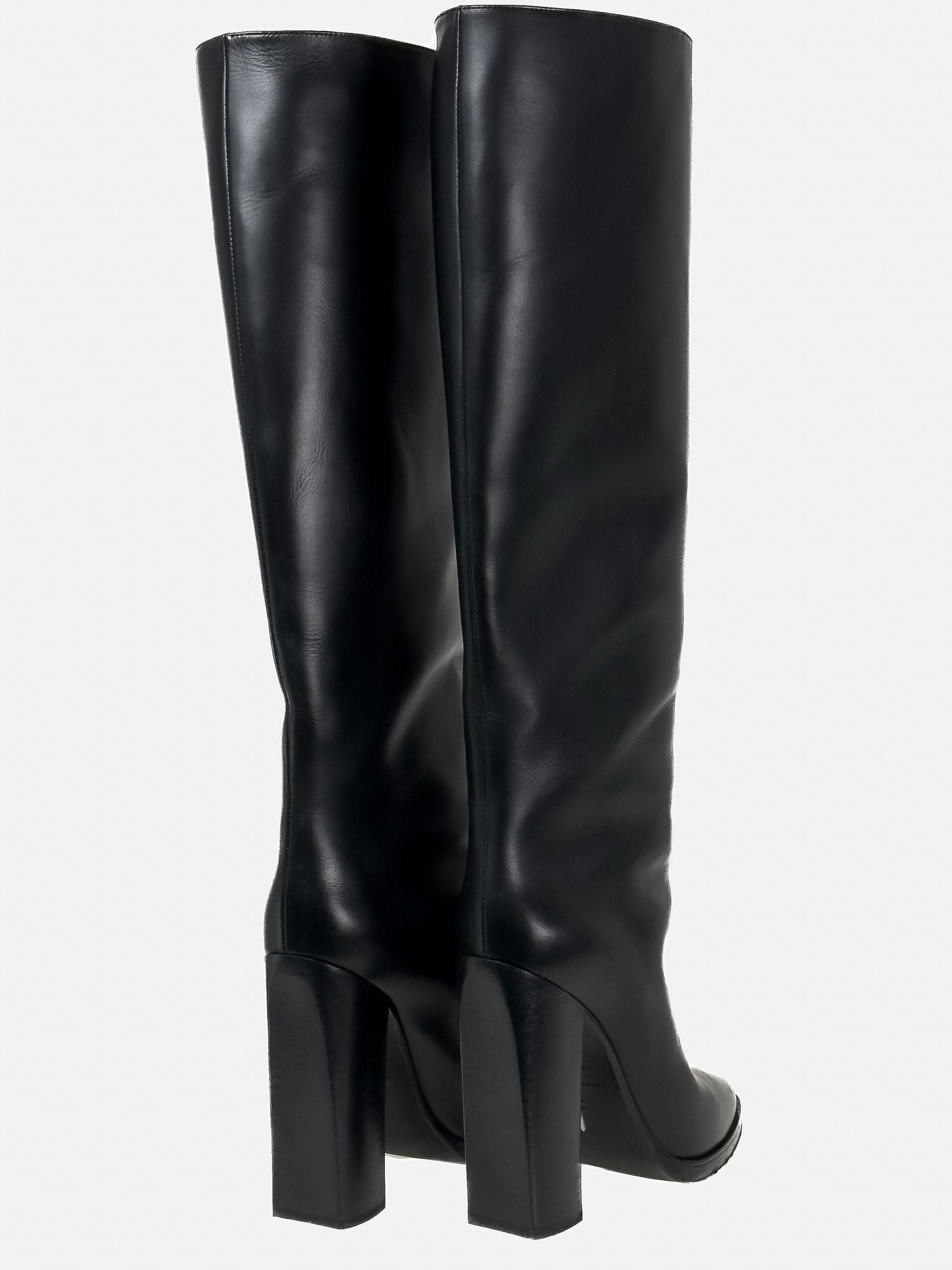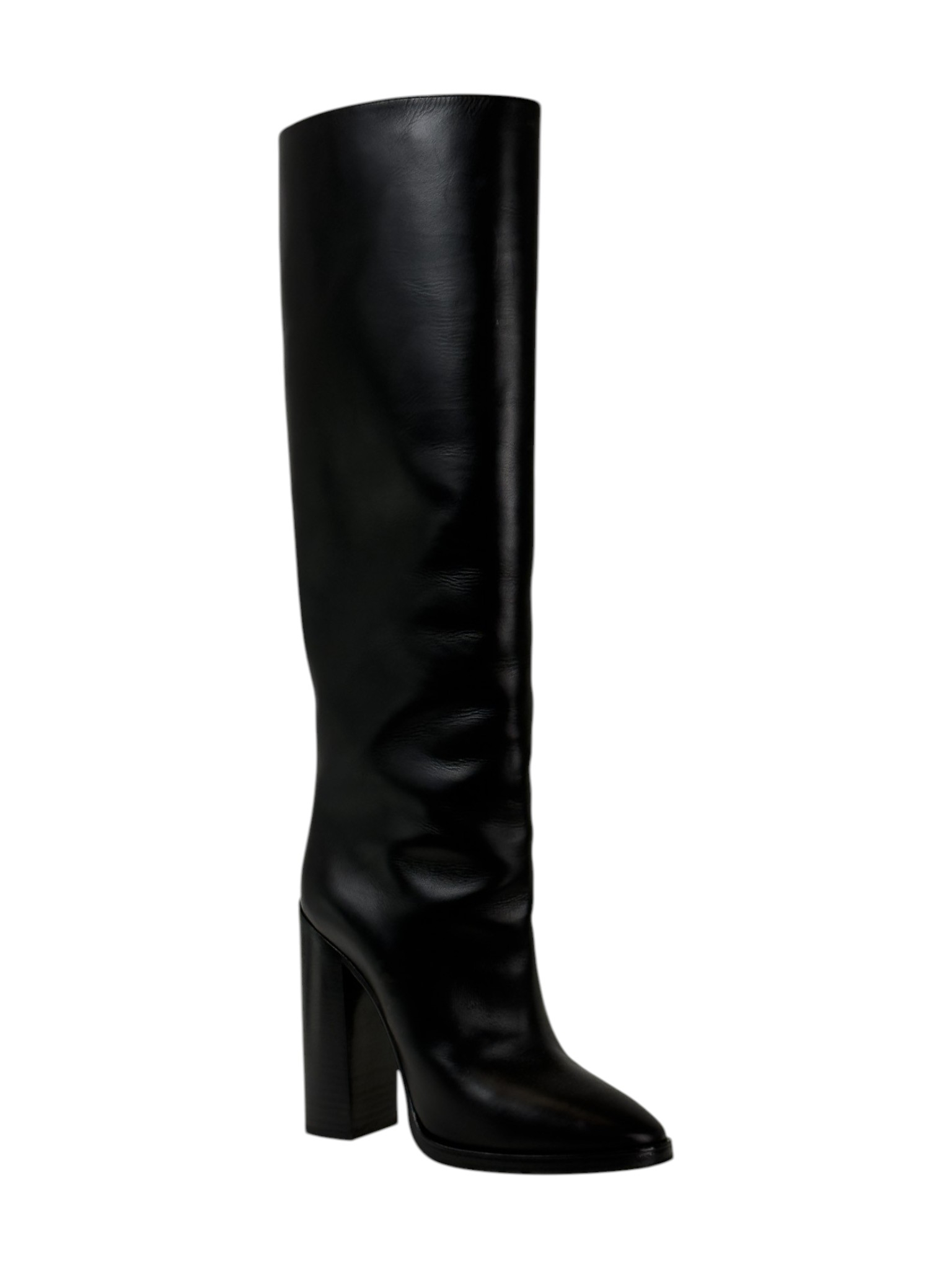 "Czarne skórzane kozaki, obcas słupek, migdałowe noski, wsuwane. Stan bardzo dobry. Rozmiar 39,5."
