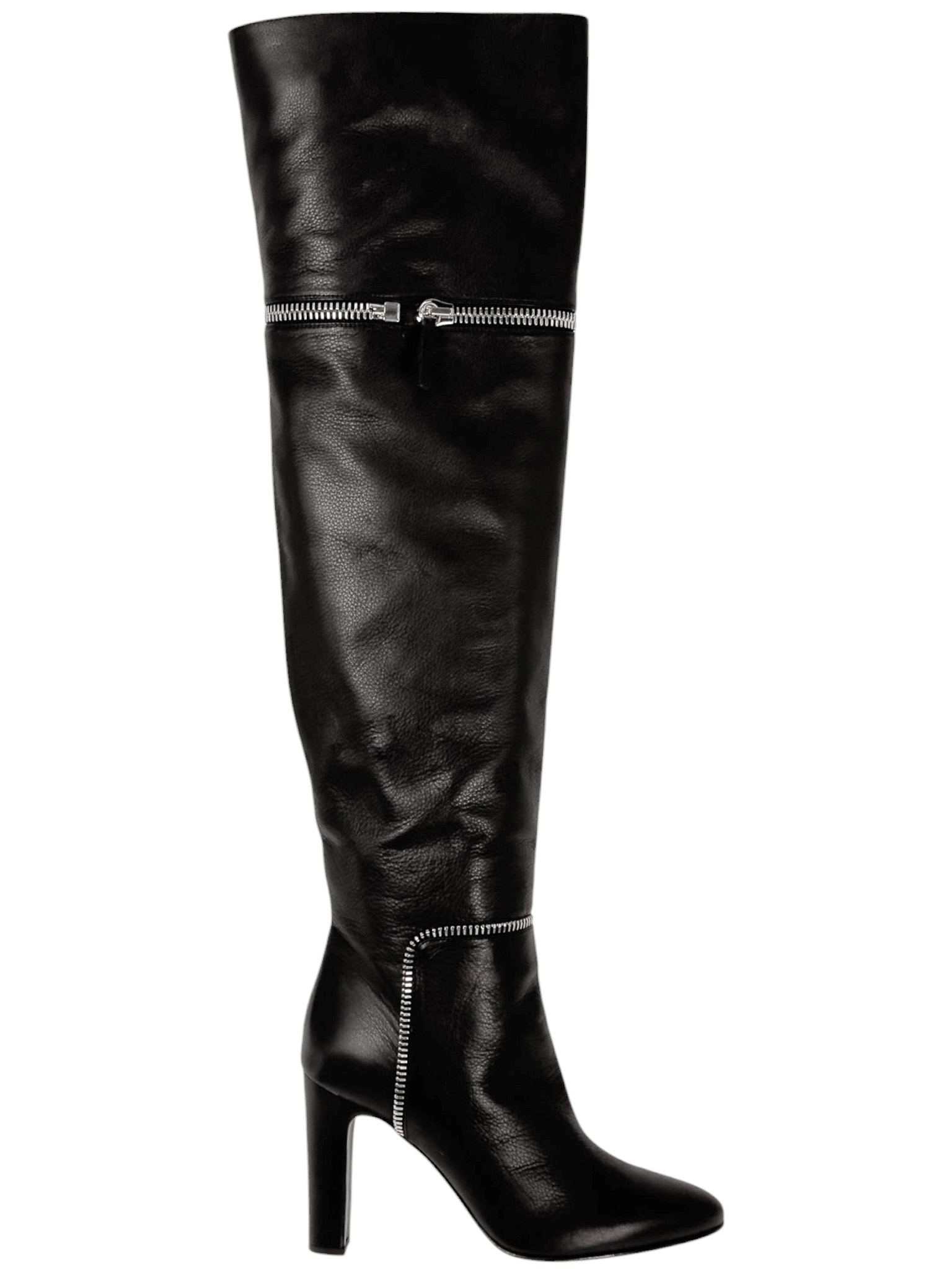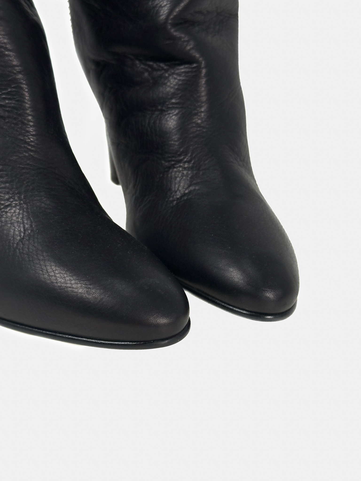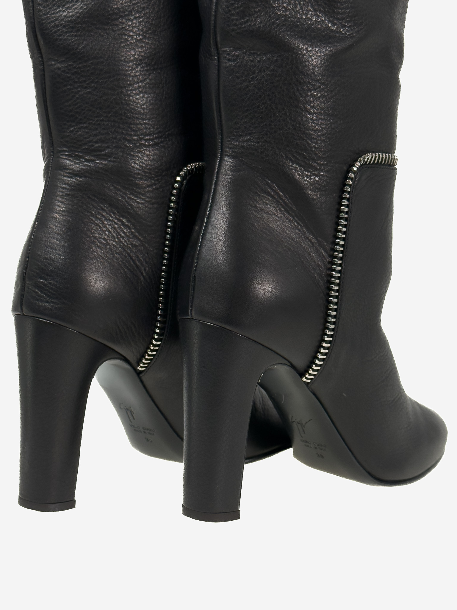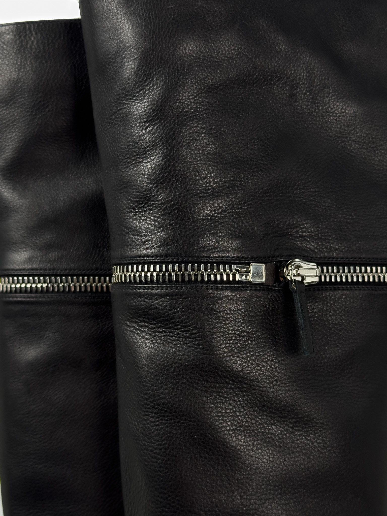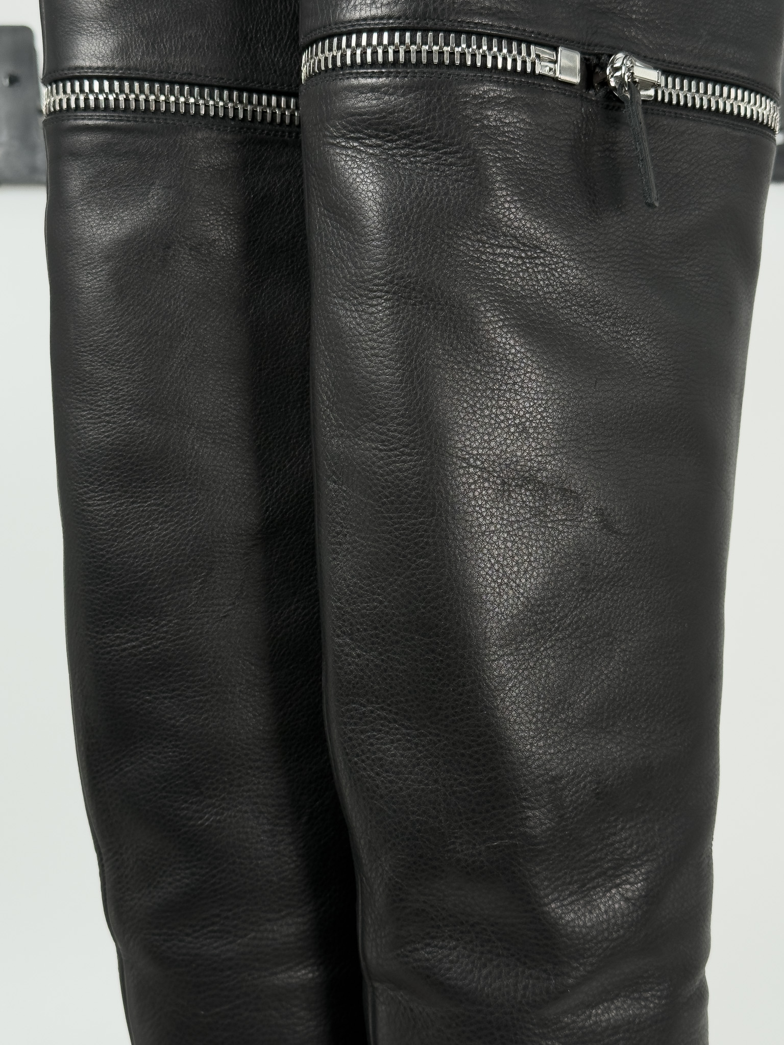 "Czarne skórzane kozaki, miękka skóra, cholewka o długości za kolano, ozdobione srebrnymi suwakami, migdałowe noski, obcas słupek, wsuwane, w zestawie z workiem przeciwkurzowym. Stan bardzo dobry. Rozmiar 38."