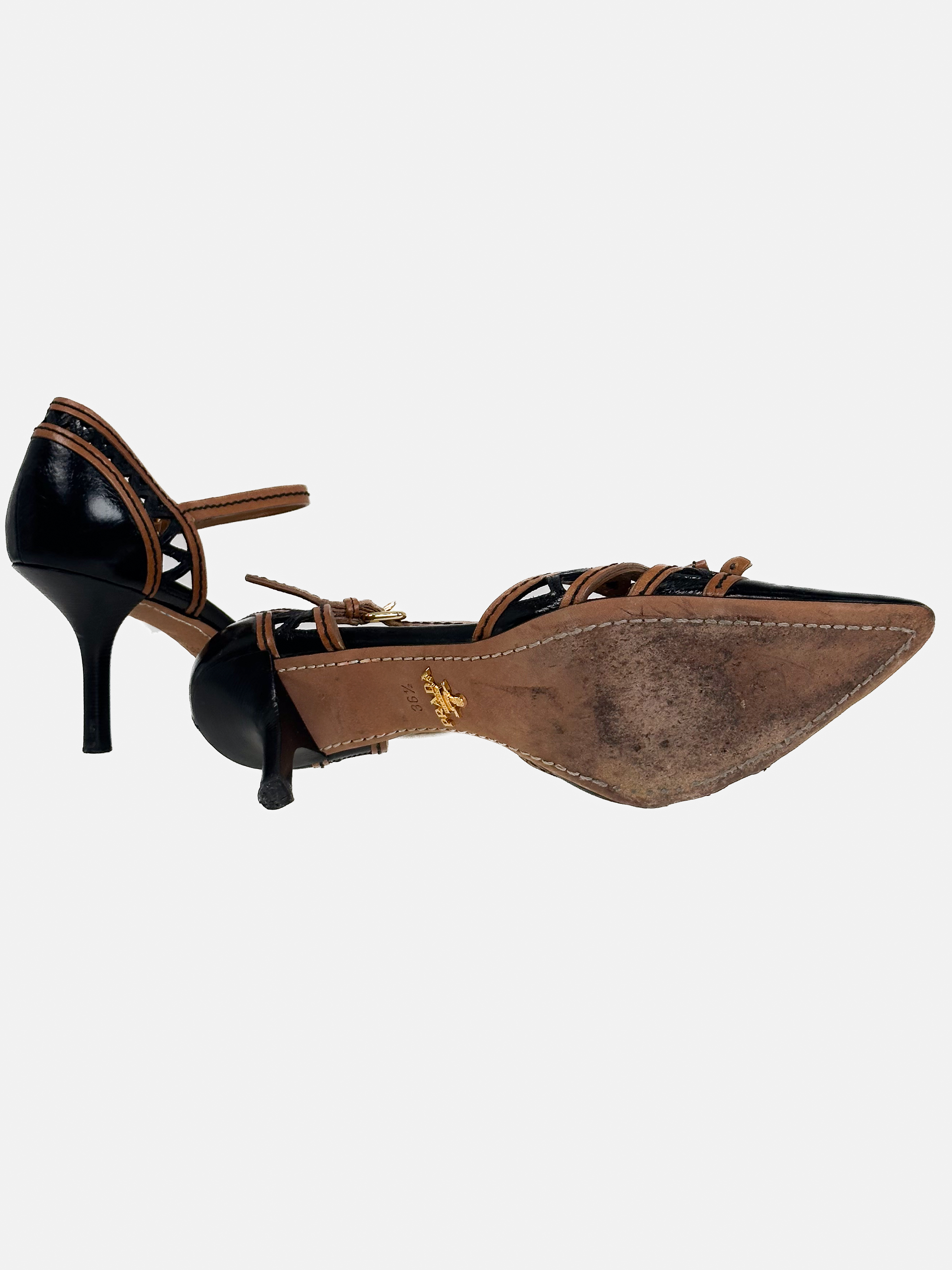 "Czarne skórzane szpilki w stylu vintage z camelowym wykończeniem, wkładką i kokardką na czubku, zapięcie wokół kostki ze złotą klamerką, rozmiar 36,5, w zestawie z pudełkiem, używane."