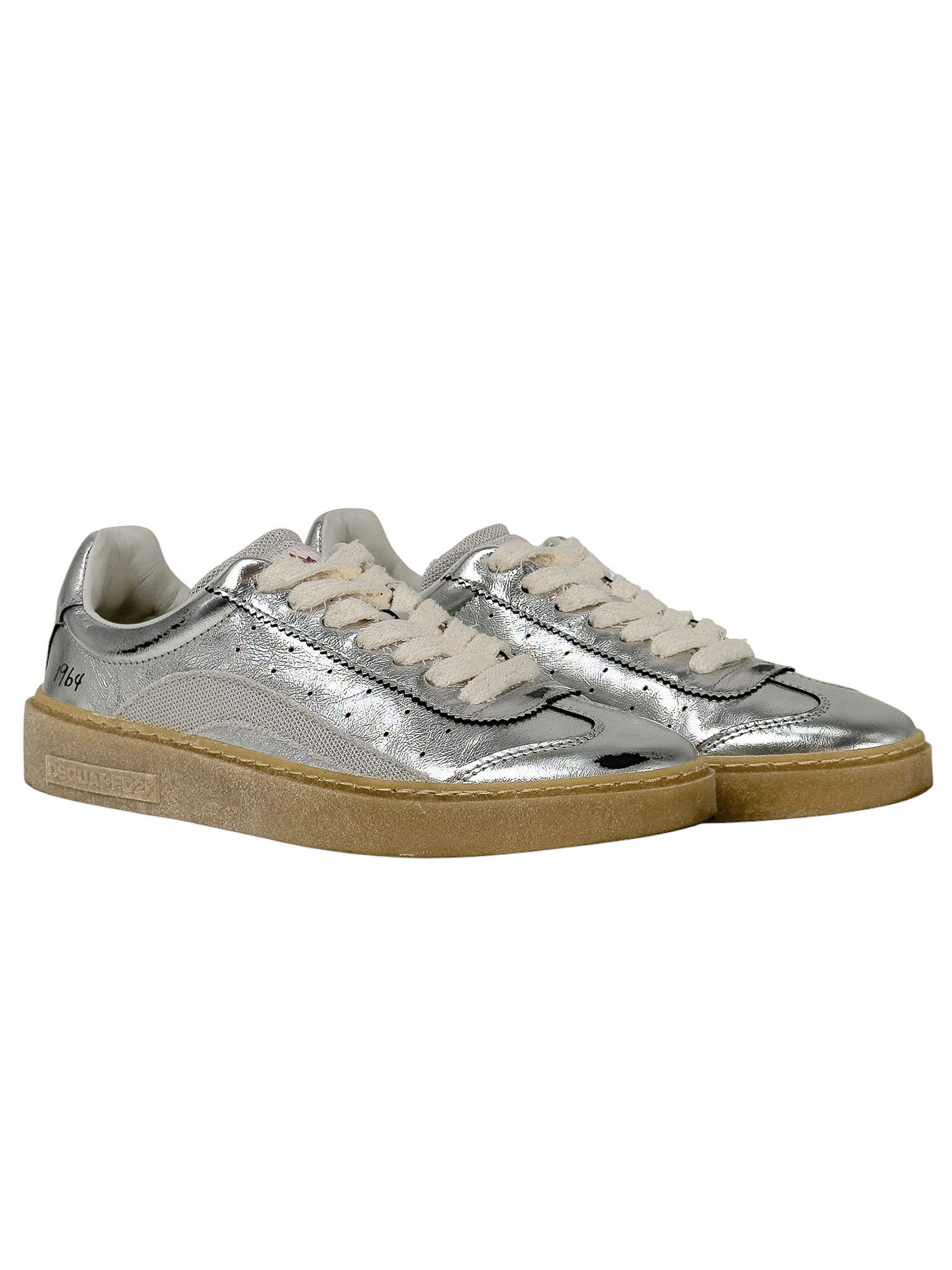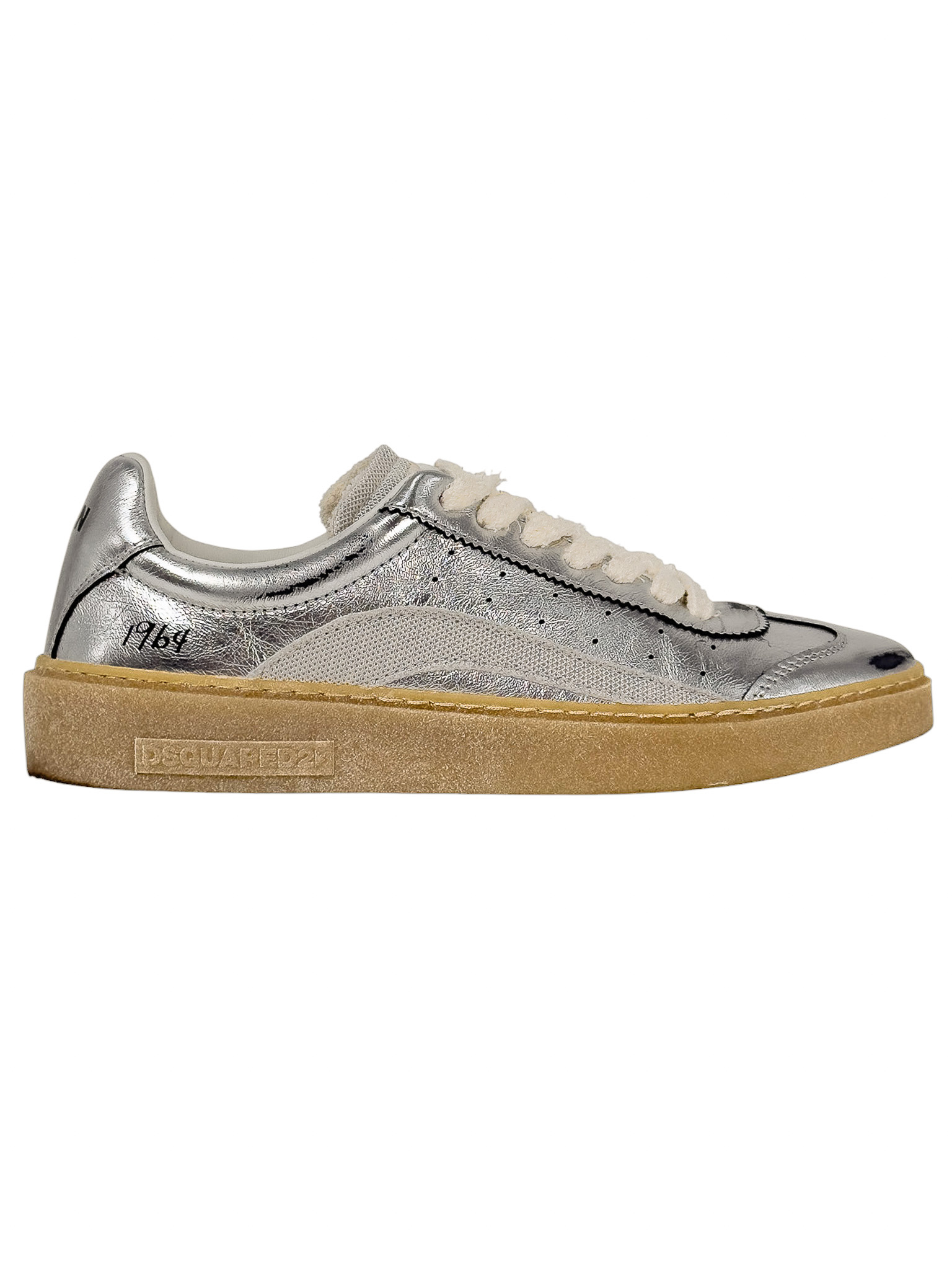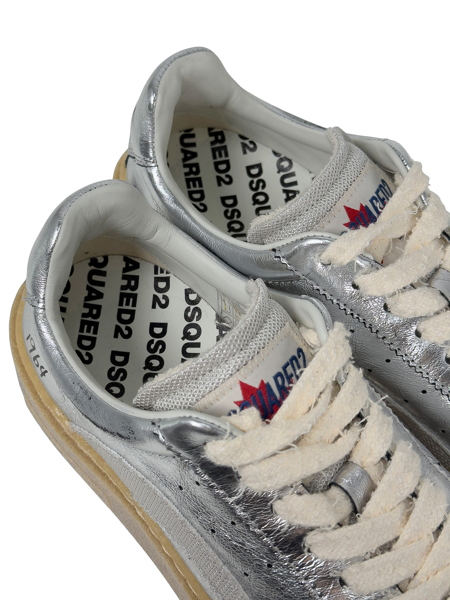 "Srebrne skórzane sneakersy, motyw przetarć, sznurowane beżowe postrzępione sznurówki, gumowa podeszwa z logo marki, zaokrąglone noski. Stan jak nowe. Rozmiar 39."