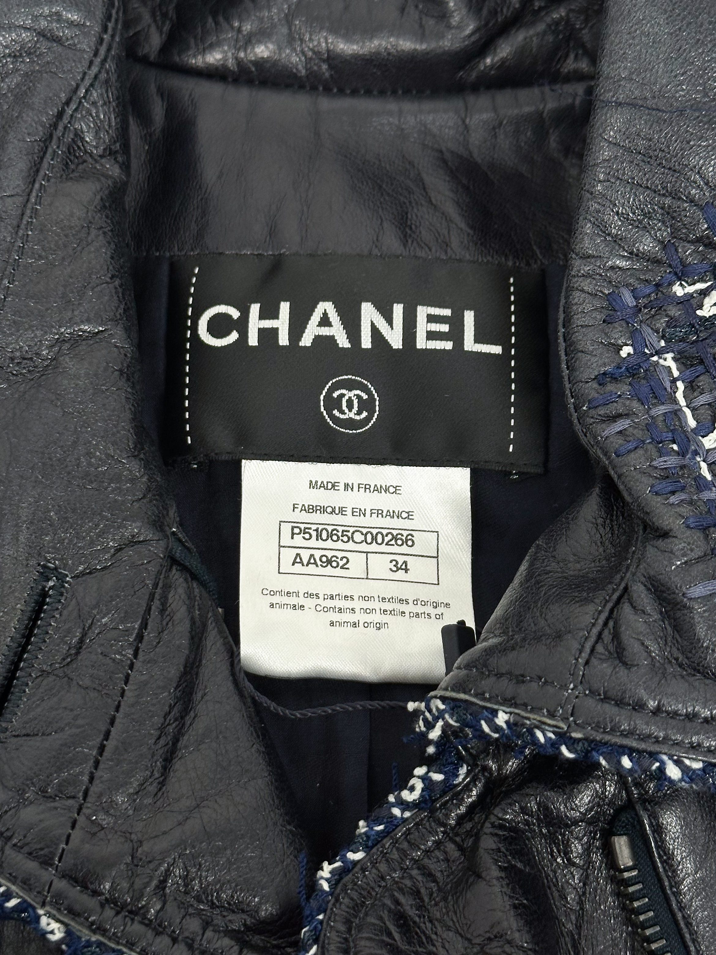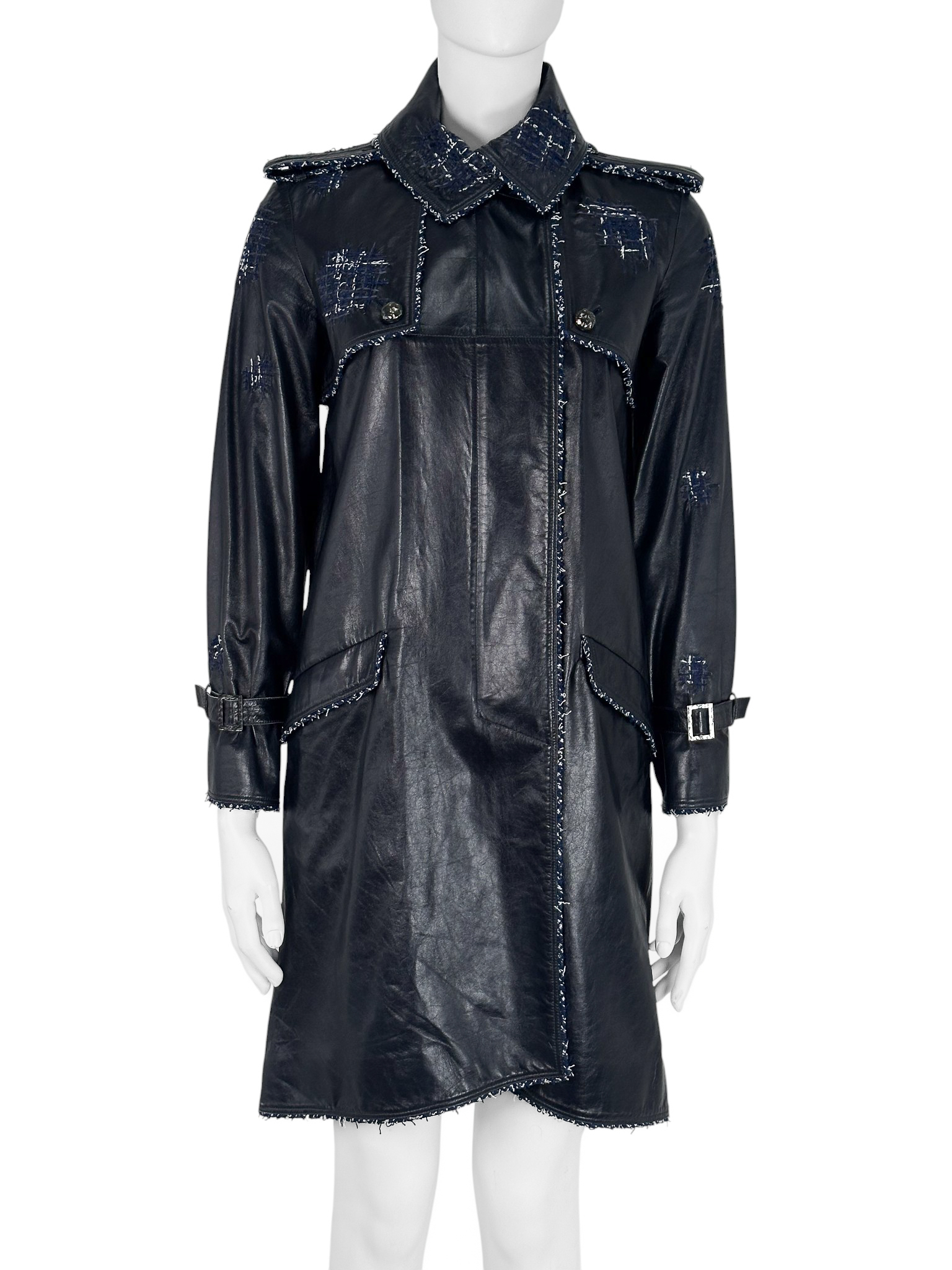 "Granatowy skórzany płaszcz z tweedowym biało-granatowym wykończeniem, srebrne guziki, zapinany na suwak, patki na ramionach. Rozmiar 34. Skład: 100% skóra."