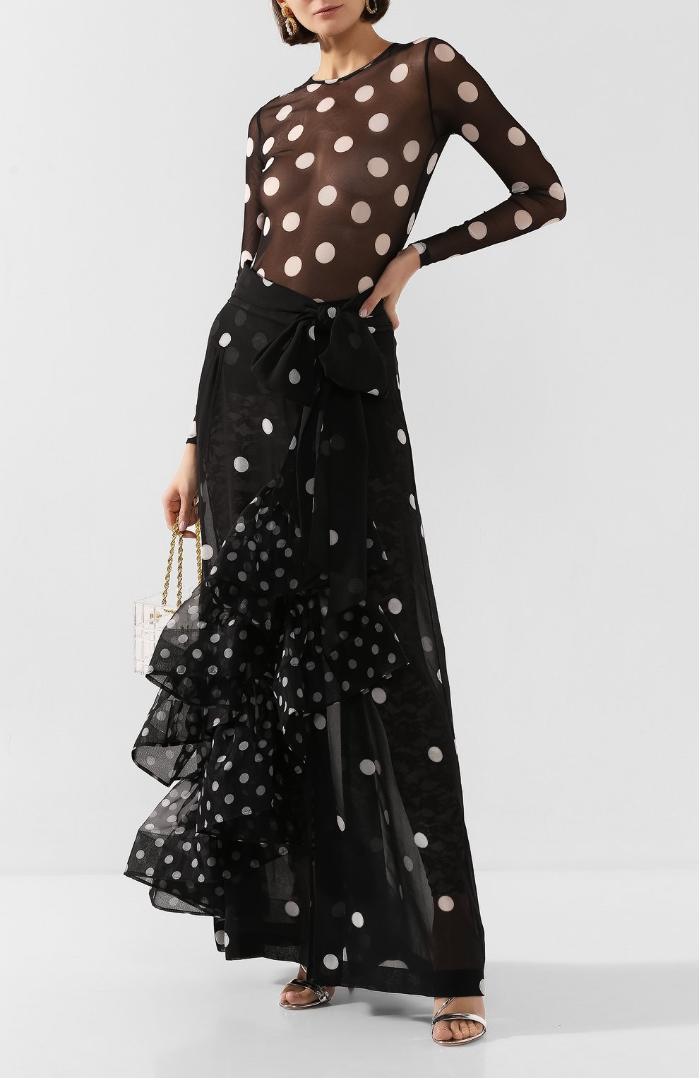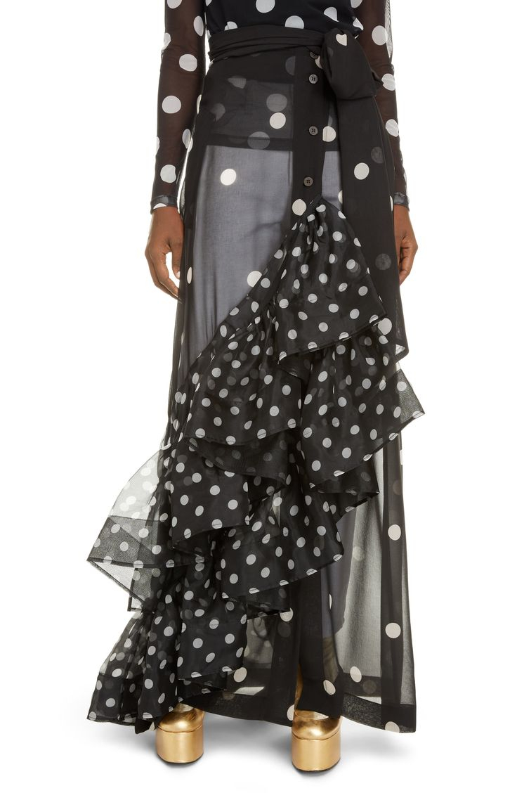 "Czarna spódnica w białe grochy, asymetryczna, długość maxi, ozdobiona falbaną wykończoną tiulem, miejscami transparentna, zapinana oraz wiązana w pasie. Stan bardzo dobry, w zestawie z metką. Rozmiar z metki 38. Skład: 100% poliester. Wymiary: szerokość w pasie 36cm, długość całkowita 120cm."