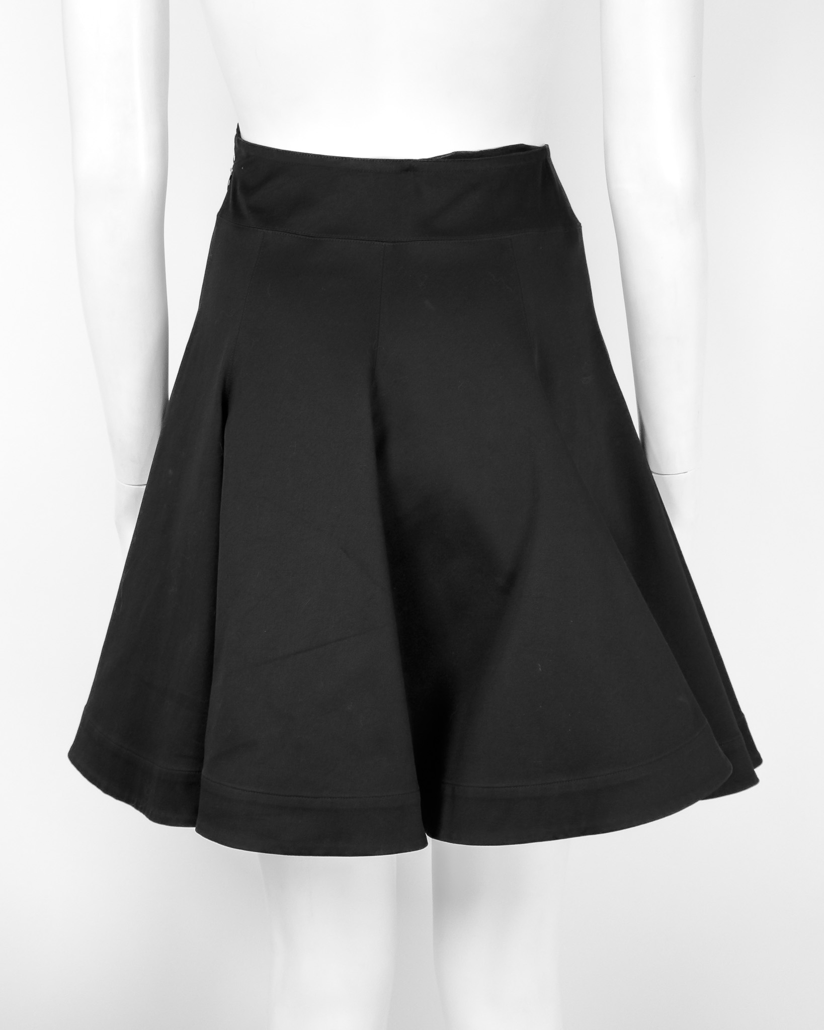 "Czarna spódnica z wysokim stanem, rozkloszowana, zapinana w bocznej części na kryty suwak oraz haftkę, długość przed kolano. Stan bardzo dobry. Rozmiar z metki FR 36. Wymiary: szerokość w pasie 29 cm, długość całkowita 50 cm."