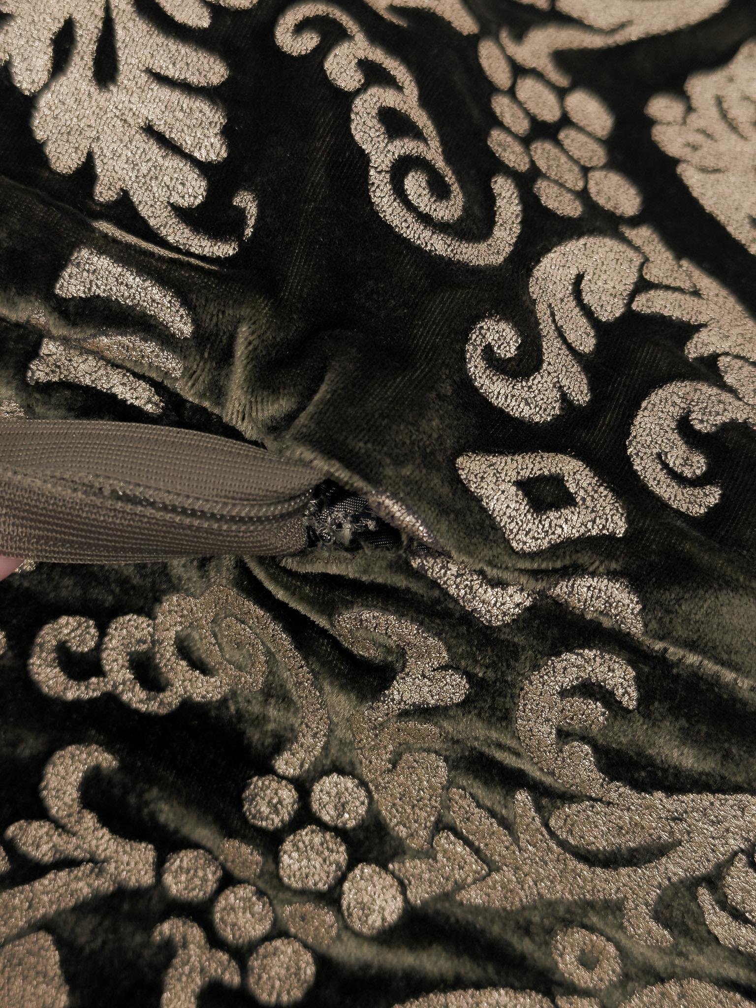 "Aksamitna spódnica w kolorze khaki ozdobiona złotym wzorem, zapinana na suwak ora haftkę, długość do kolan, ołówkowy krój, rozcięcie w tylnej części, logowana podszewka. Stan bardzo dobry, rozprucie przy suwaku. Rozmiar z metki IT 40. Skład: 16% jedwab, 82% wiskoza; podszewka: 100% kupro. Wymiary: szerokość w pasie 37,5cm, długość całkowita 59cm."