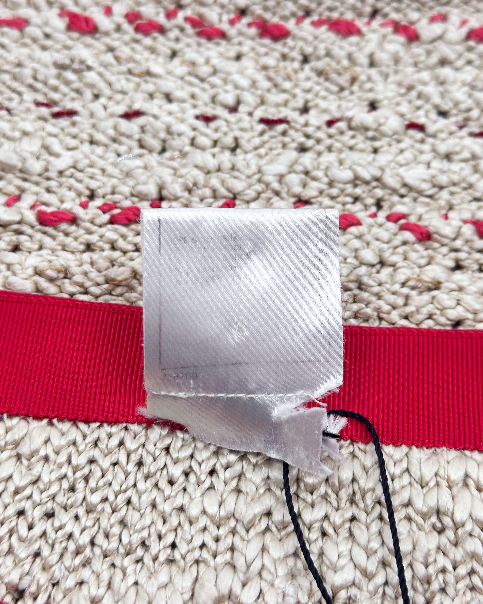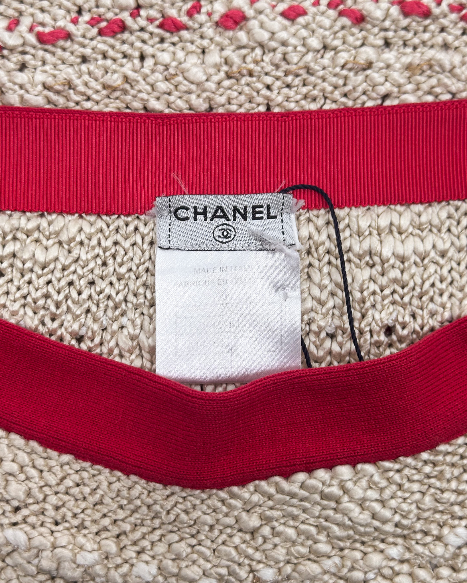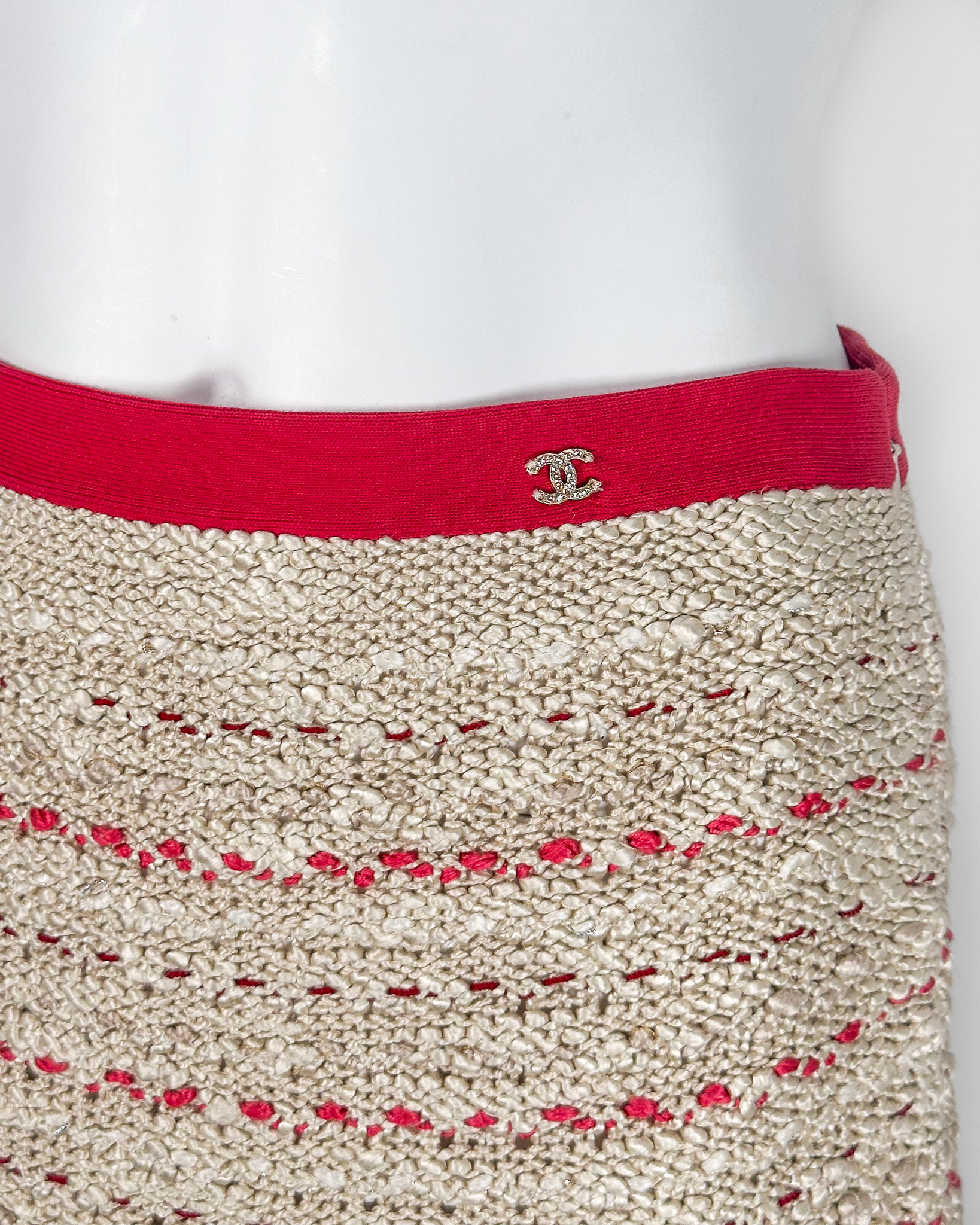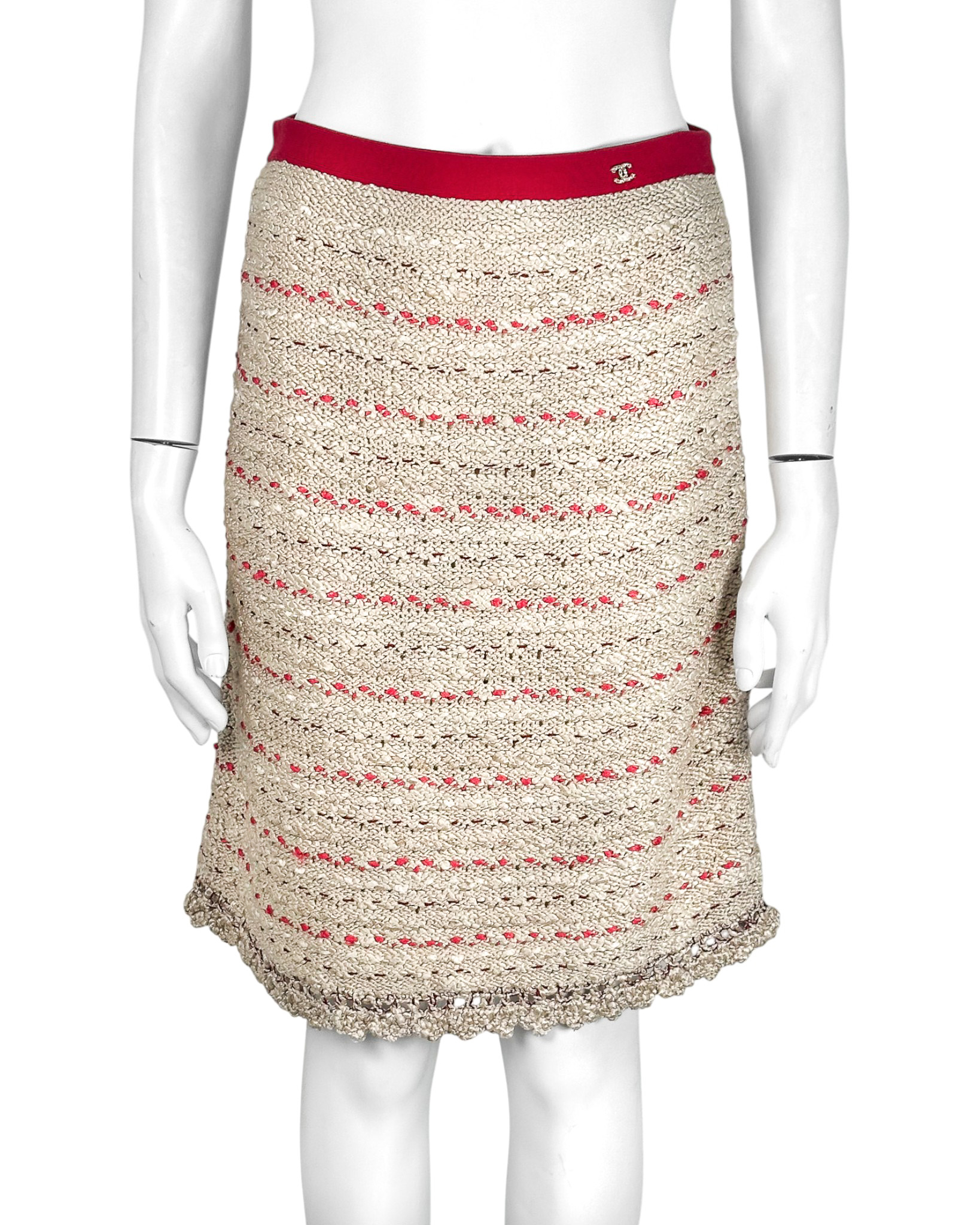 "Beżowa tweedowa spódnica ołowkowa przeplatana różowymi nitkami, na górze różowy pas z biżuteryjnym logo marki wysadzanym kryształkami, dół spódnicy wykończony ozdobnym ażurowym splotem, przecięta metka, rozmiar 36"