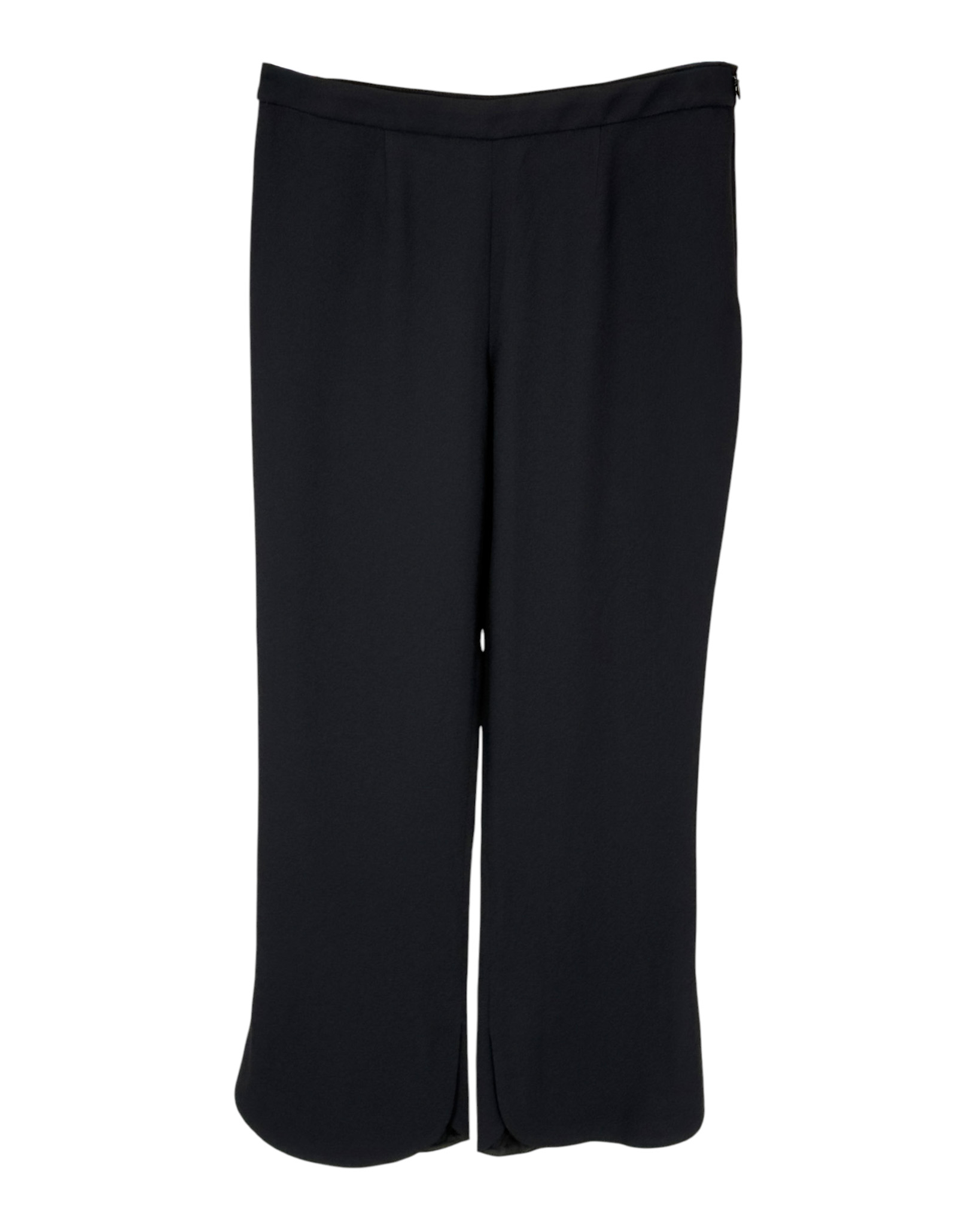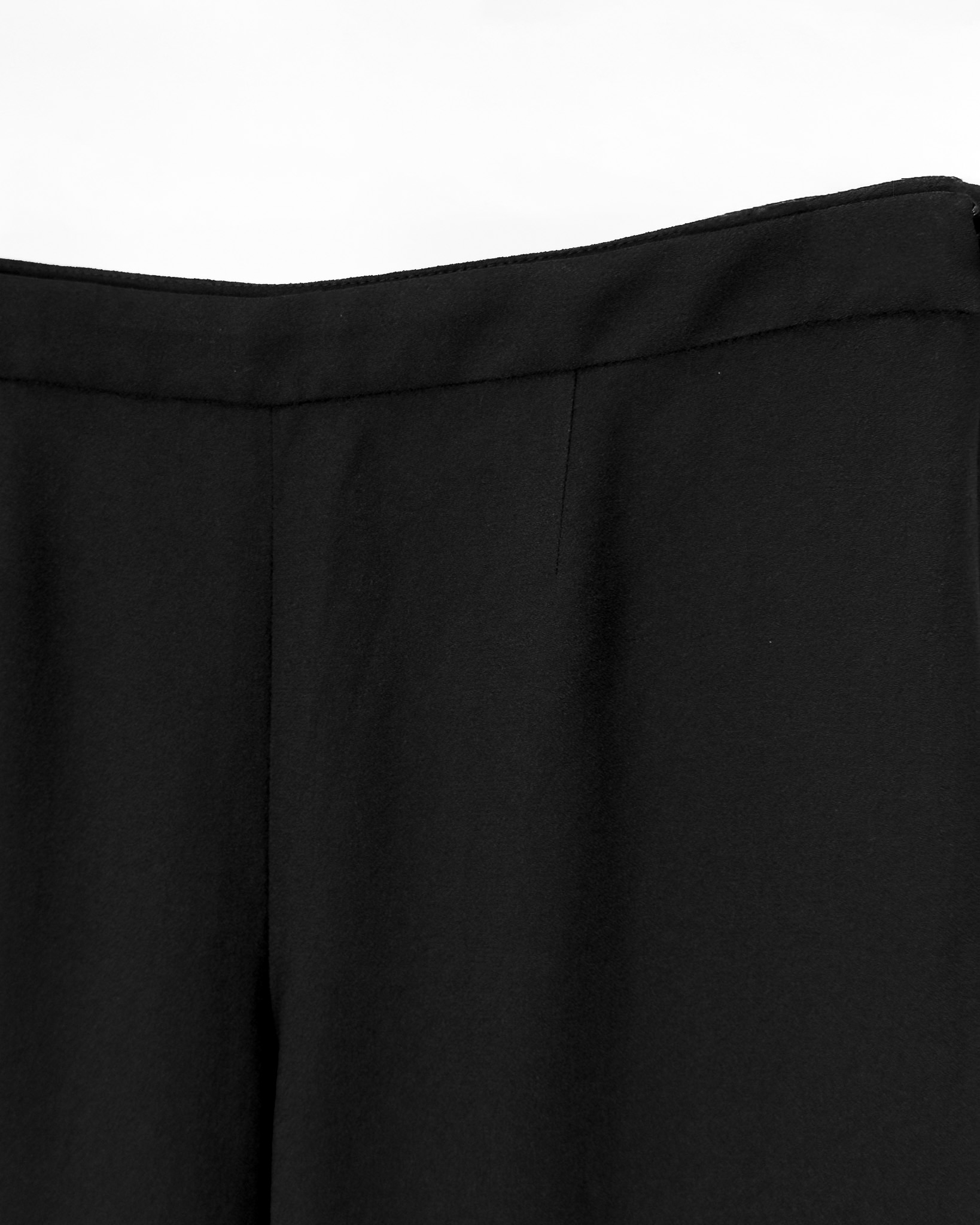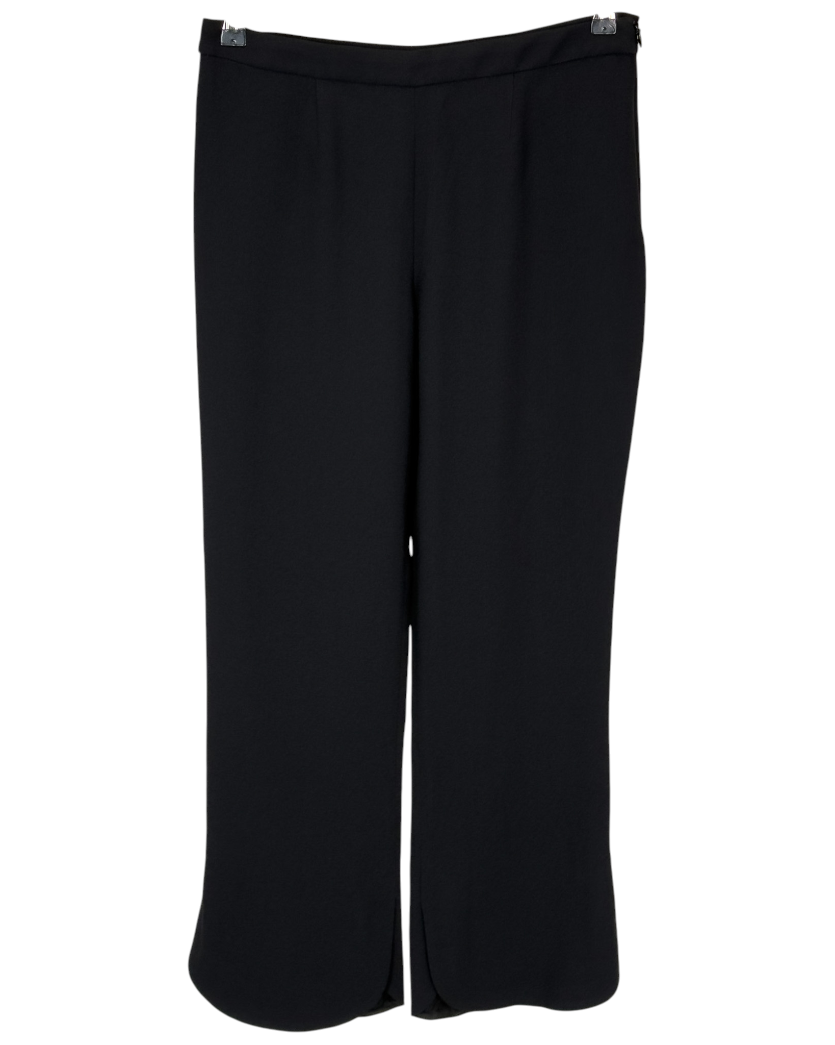 "Czarne spodnie, wysoki stan, zapinane w bocznej części na kryty suwak oraz haftkę, nogawka o długości 7/8 zaokrąglone na wykończeniu z delikatnymi rozcięciami. Stan bardzo dobry. Rozmiar z metki IT 42. Skład: 57% acetat, 43% wiskoza. Wymiary: szerokość w pasie 39cm, długość nogawki mierzona od zewnętrznej strony 95cm."