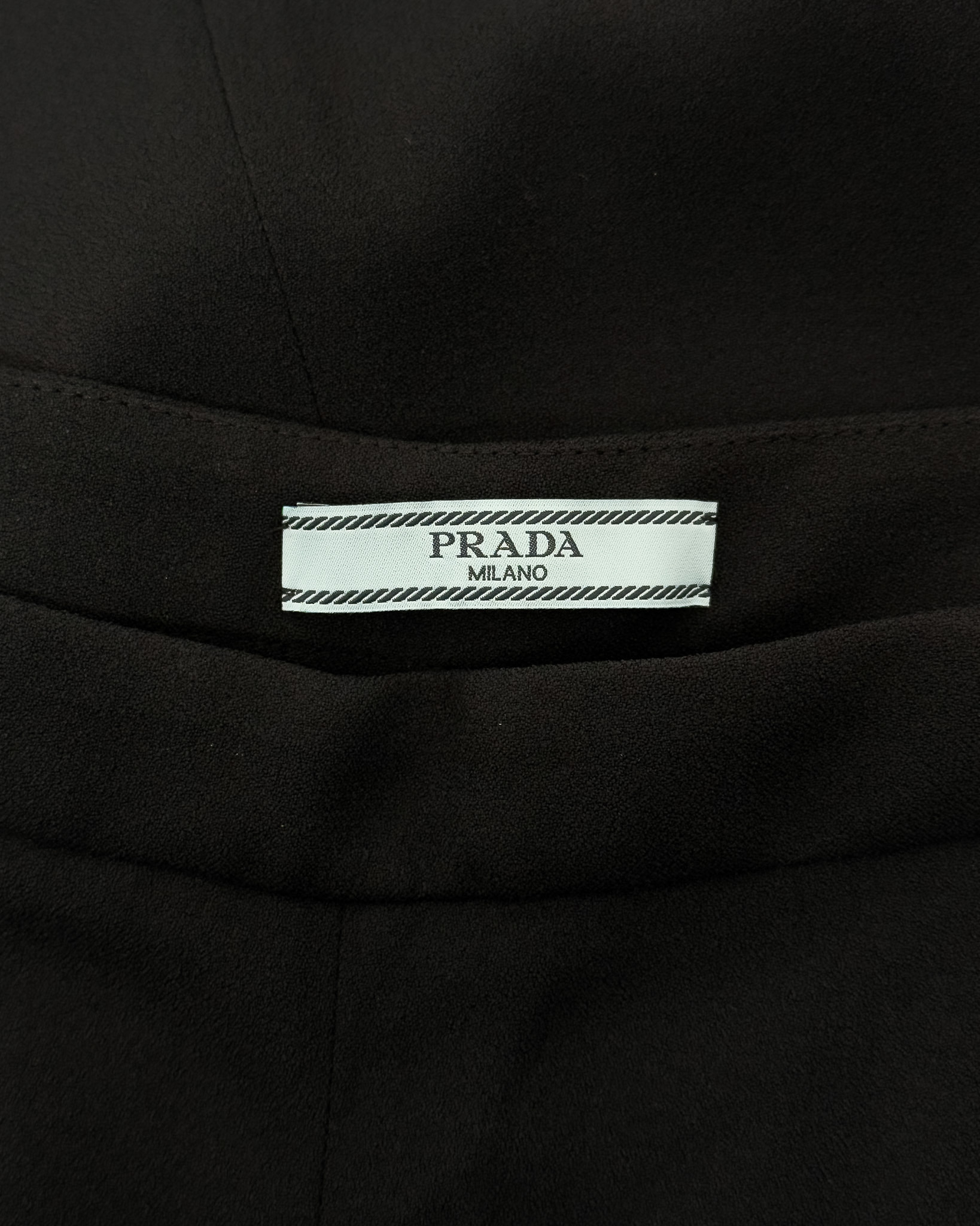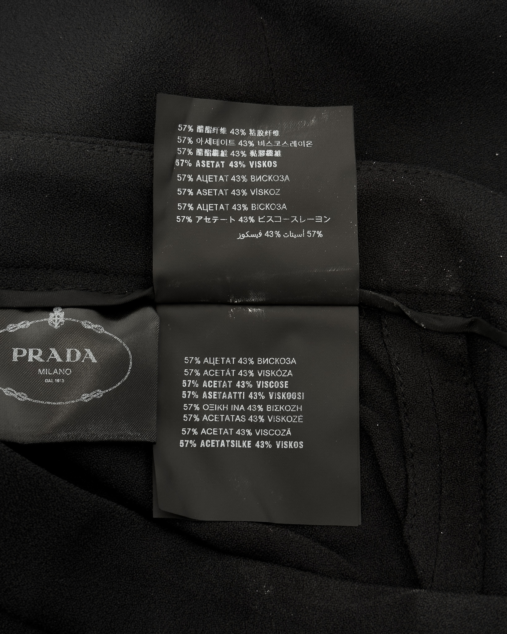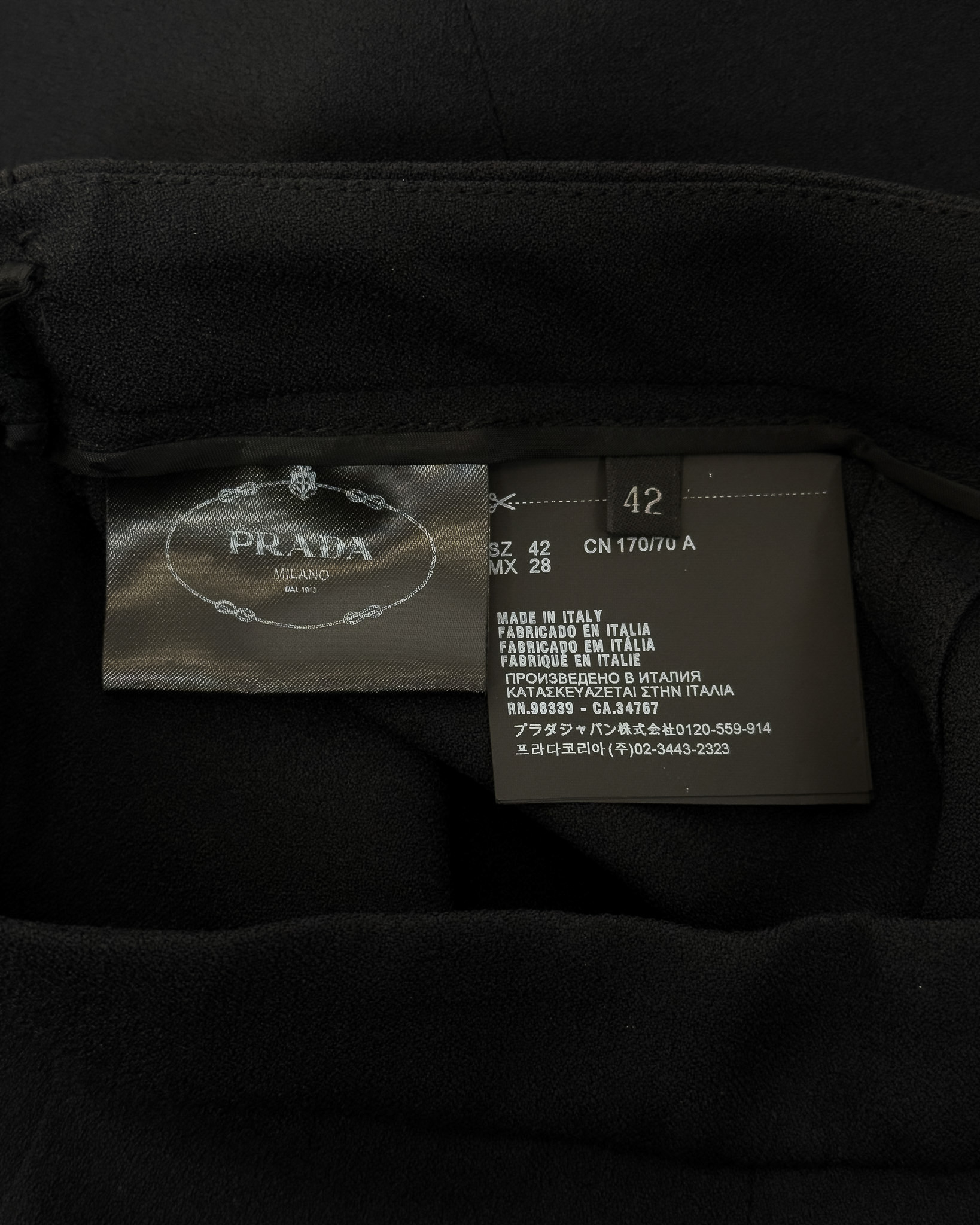 "Czarne spodnie, wysoki stan, zapinane w bocznej części na kryty suwak oraz haftkę, nogawka o długości 7/8 zaokrąglone na wykończeniu z delikatnymi rozcięciami. Stan bardzo dobry. Rozmiar z metki IT 42. Skład: 57% acetat, 43% wiskoza. Wymiary: szerokość w pasie 39cm, długość nogawki mierzona od zewnętrznej strony 95cm."