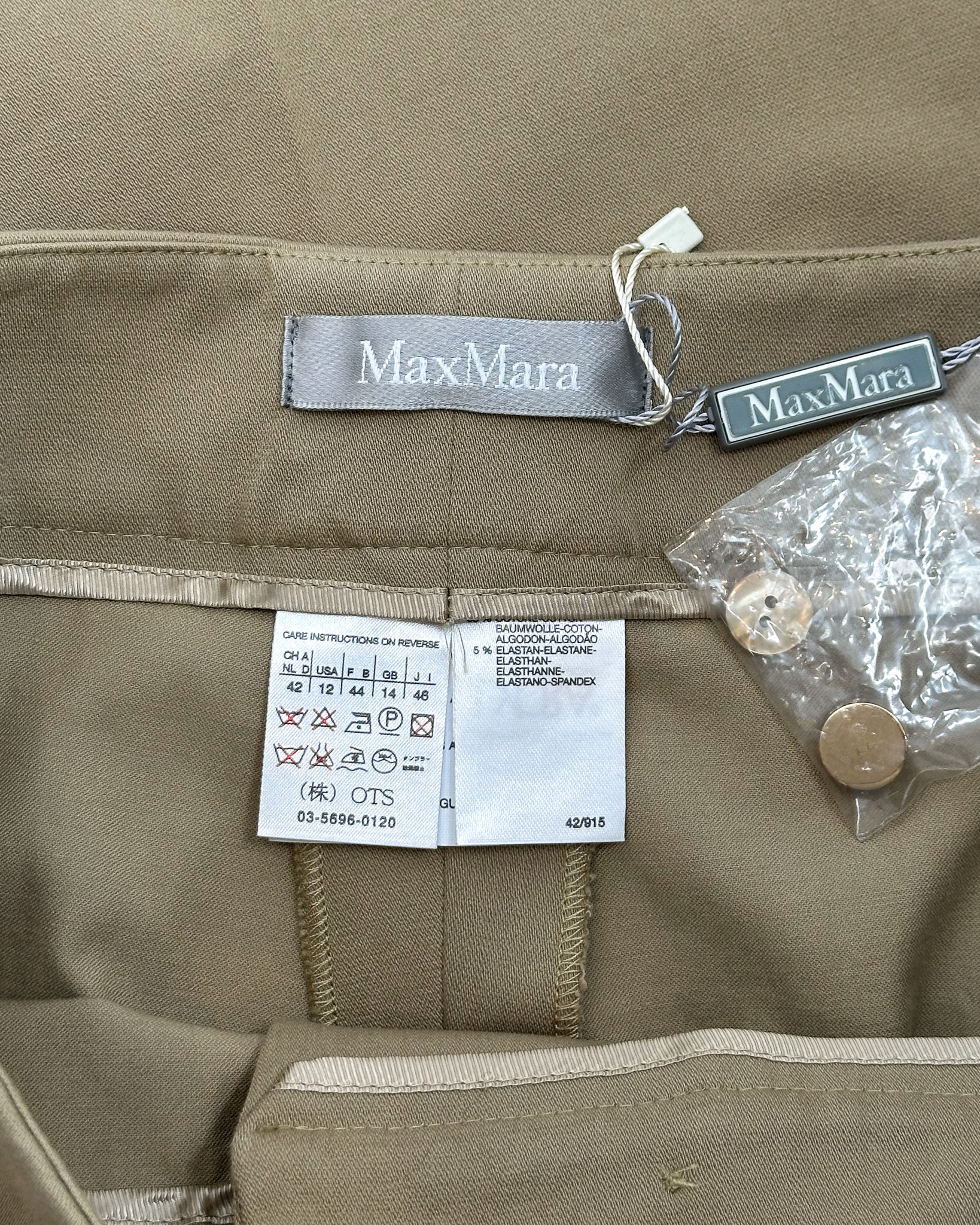"Khaki spodnie w kant, delikatnie rozszerzane, po bokach złote klamerki, zapinane na dwa złote guziki. Rozmiar 42, wymiary: Szerokość 40cm, długość 107cm. Skład 95% bawełna, 5% elastan, z metką."