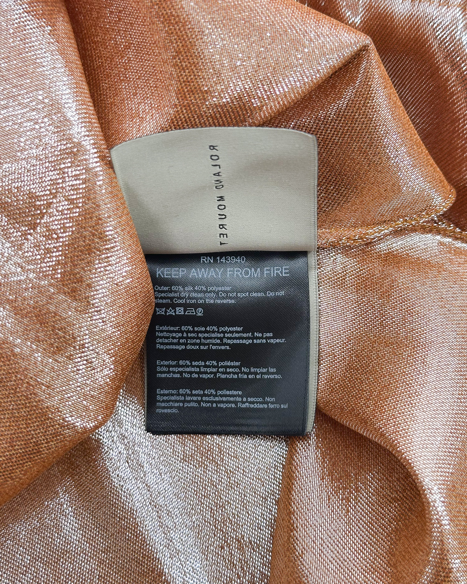 "Pomarańczowo-srebrna połyskująca jedwabna koszula, półtransparentna, dłuższy krój, taliowana, wiązana przy dekolcie, na rękawach i w pasie, głęboki dekolt w serek, stójka, bardzo długie rękawy, szersze i rozcięte mankiety, zakończona delikatną falbaną. Rozmiar z metki IT 42. Skład: 60% jedwab, 40% poliester."