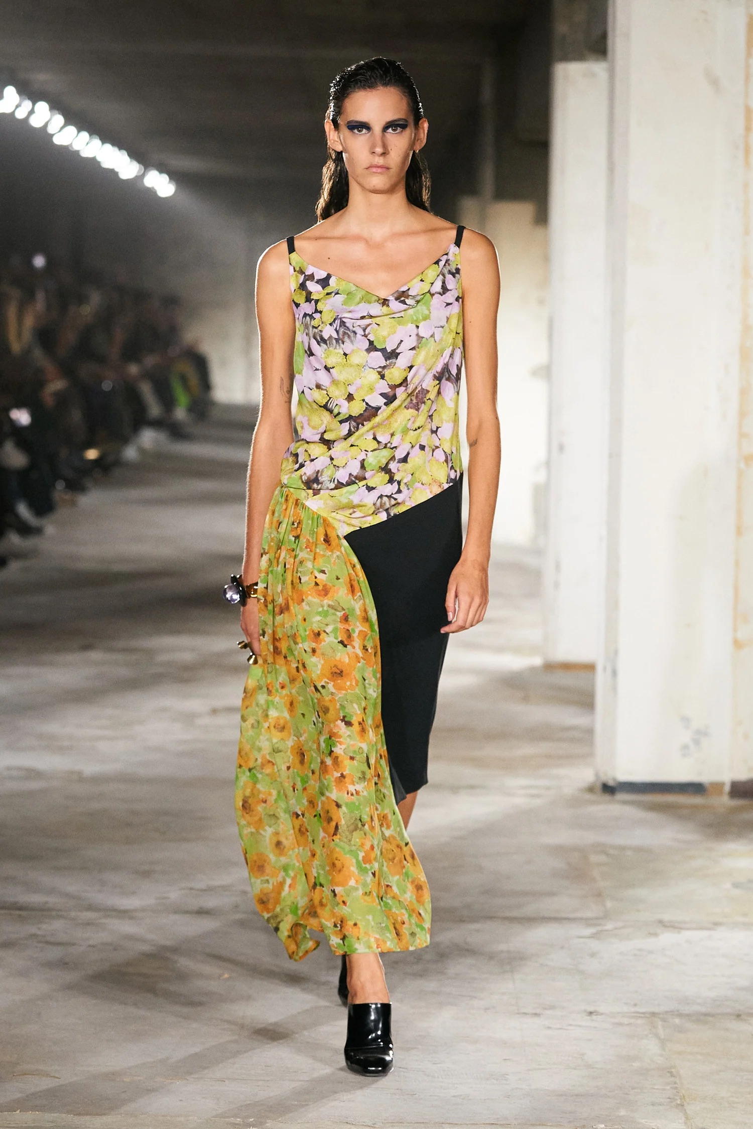 "Czarno - kwiatowa sukienka z domieszką jedwabiu w składzie, asymetryczna, na ramiączkach, zapinana na suwak, długość midi, lejący dekolt. Stan bardzo dobry. Rozmiar z metki EU 42. Skład: 51% jedwab, 30% poliester, 19% wiskoza. Wymiary: szerokość mierzona od pachy do pachy 50cm, długość całkowita 112cm.Kolekcja spring summer 2023"