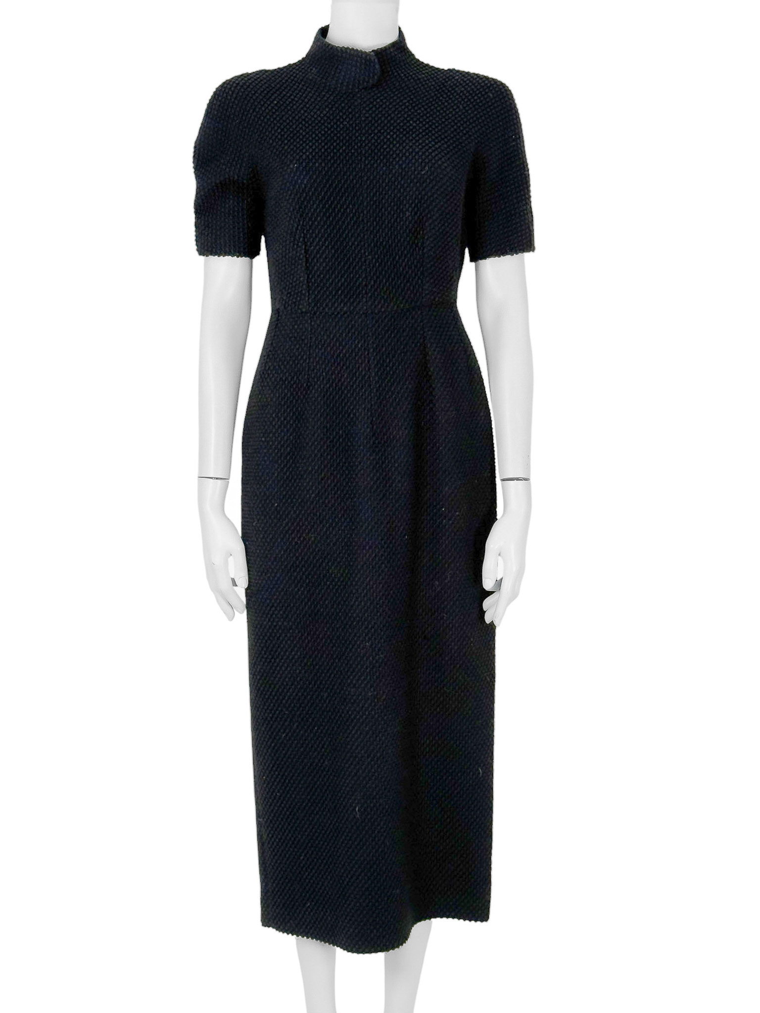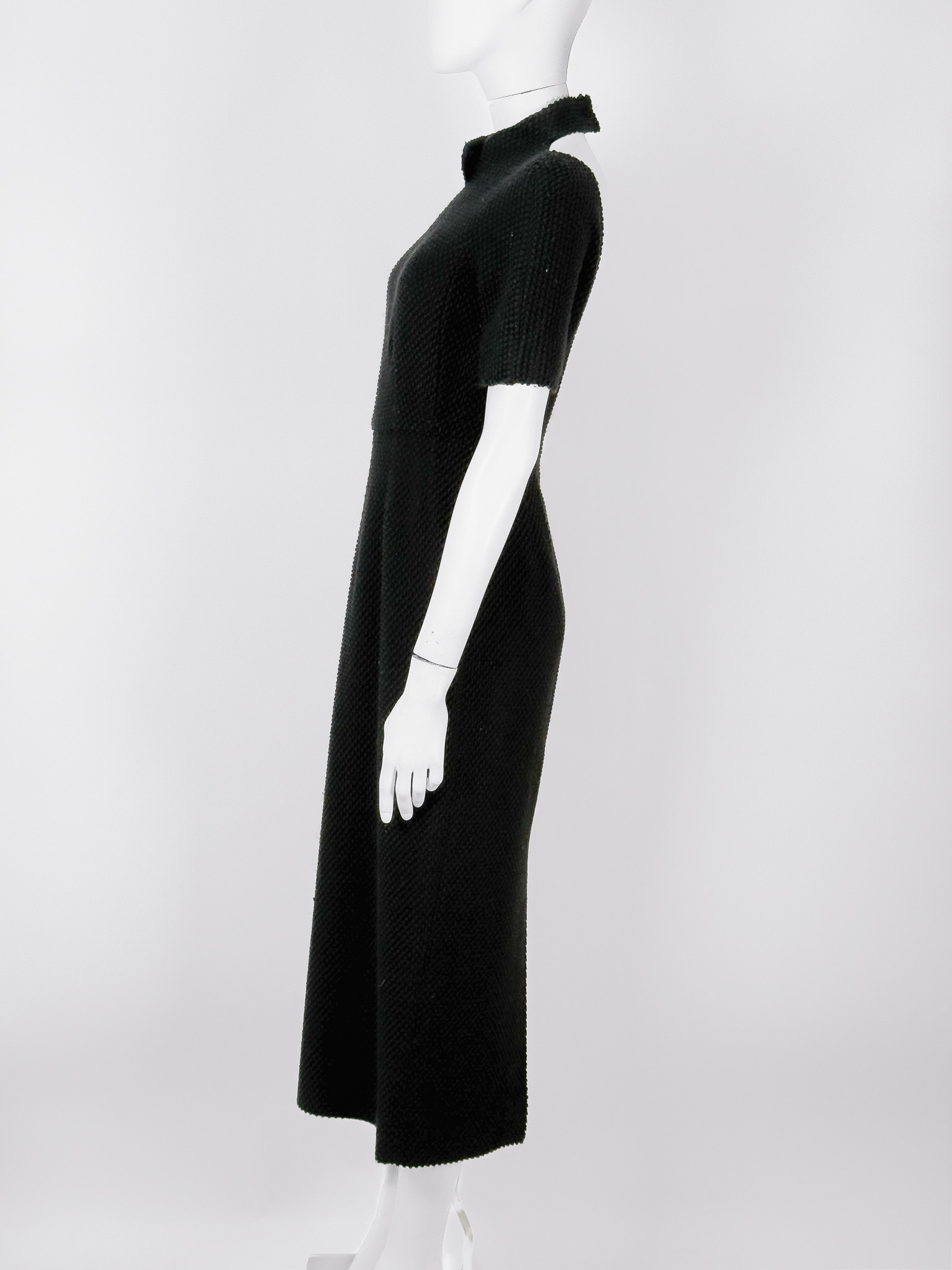 "Czarna taliowana sukienka ozdobiona delikatnym dzierganym wzorem, krótki rękaw, wycięcie na plecach, zapinana na suwak oraz zatrzask i dwie haftki, krótki rękaw, stójka, długość maxi, rozcięcie w tylnej części. Stan bardzo dobry. Rozmiar z metki 12. Skład: 49% acetat, 28% bawełna, 17% wełna, 7% wiskoza. Wymiary: szerokość mierzona od pachy do pachy 46cm, długość całkowita 127cm."