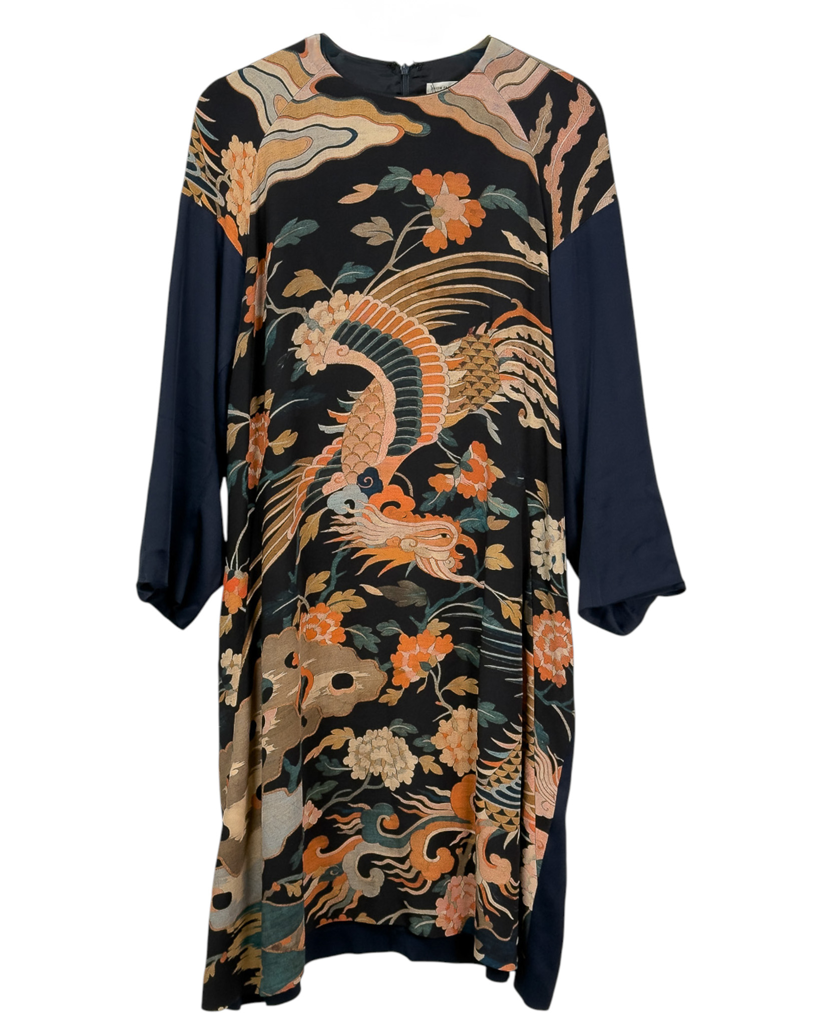 "Granatowa jedwabna sukienka ozdobiona wielobarwnym wzorem w odcieniach różu, pomarańczu oraz beżu, długość za kolano, prosty krój, obniżona linia ramion, długi rękaw, zaokrąglony dekolt, zapinana w tylnej części na suwak oraz haftkę, podszewka. Stan bardzo dobry. Rozmiar z metki 40. Skład: 100% jedwab. Wymiary: szerokość mierzona od pachy do pachy 63cm, długość całkowita 96cm."