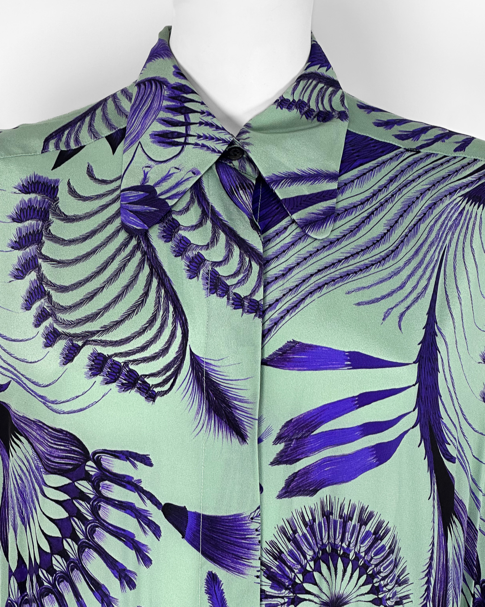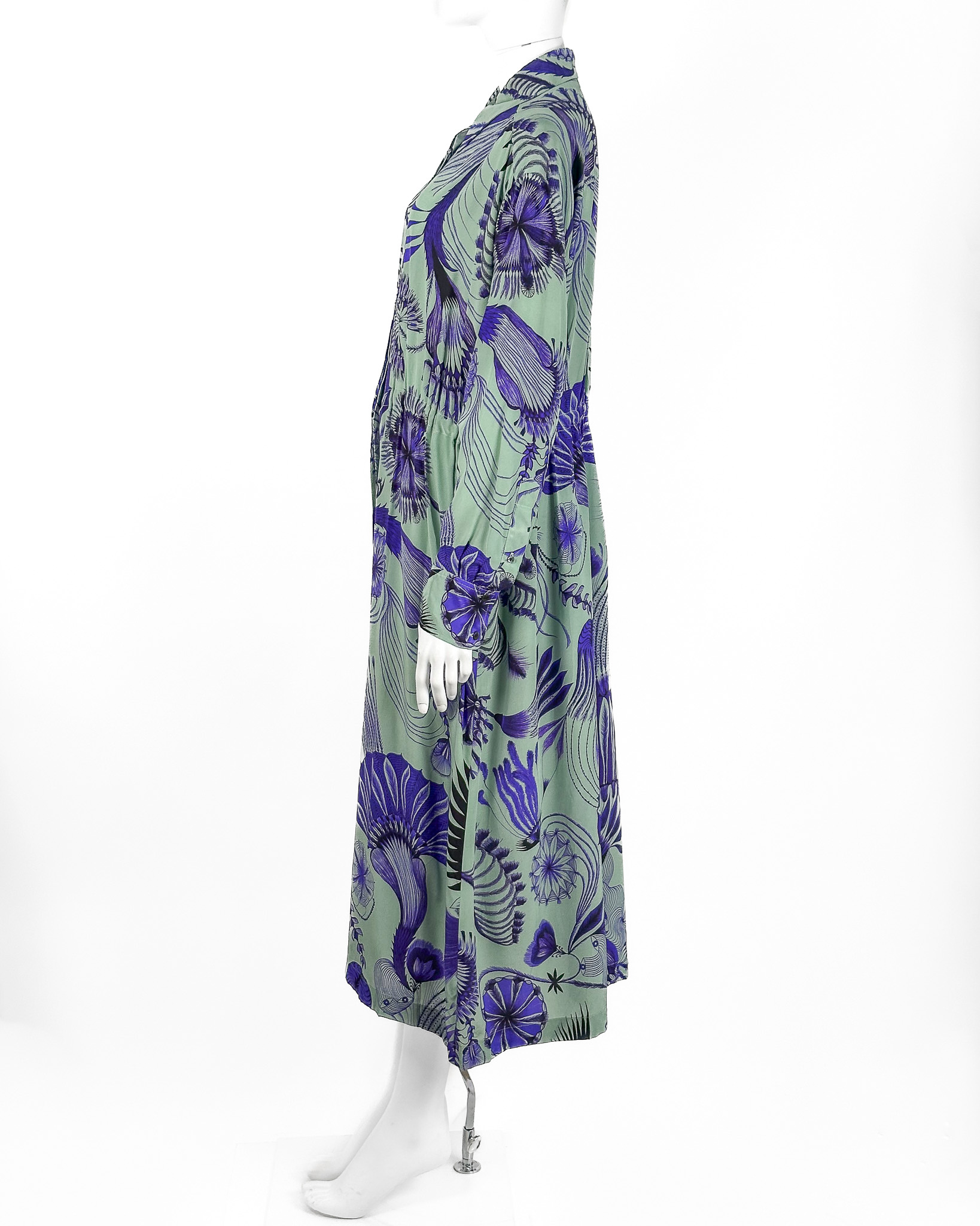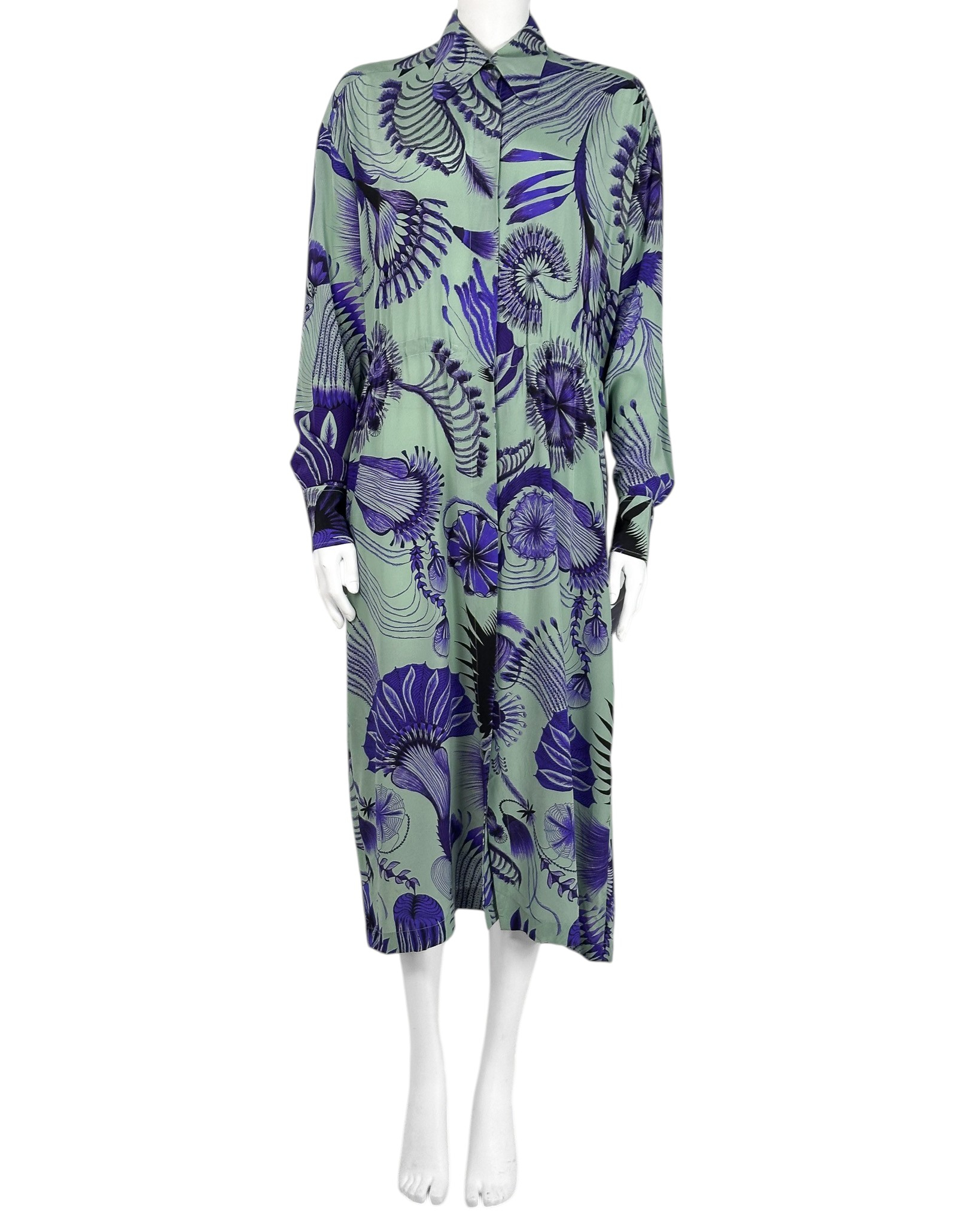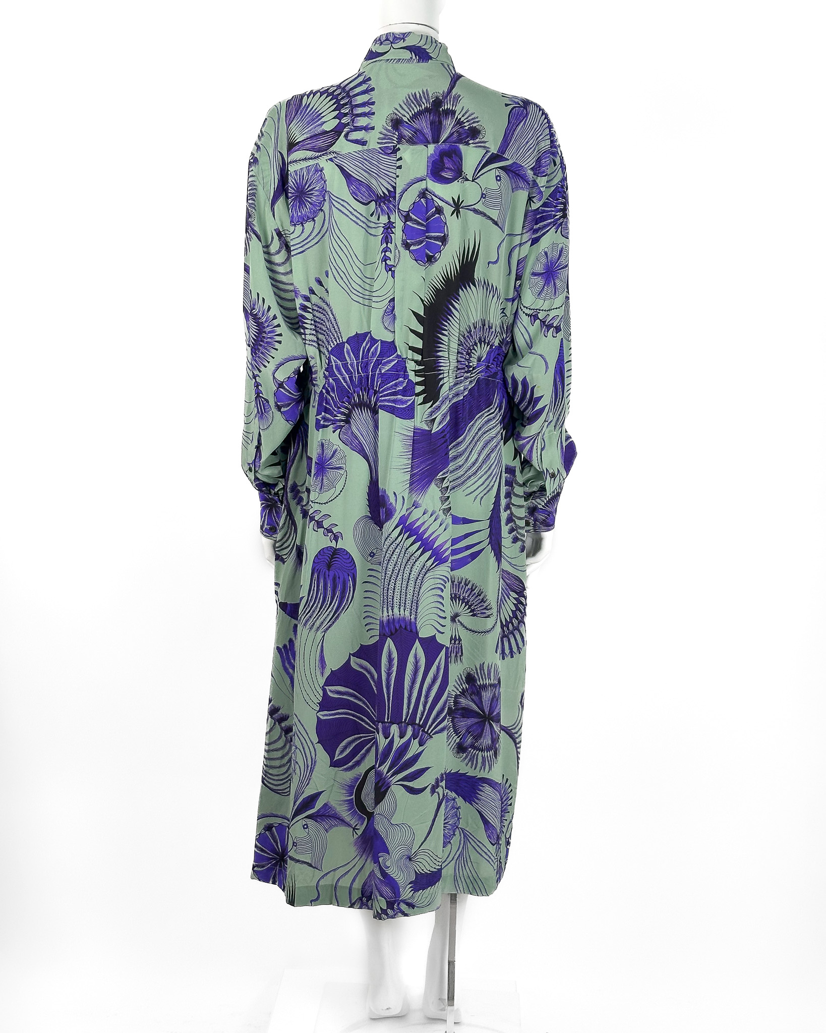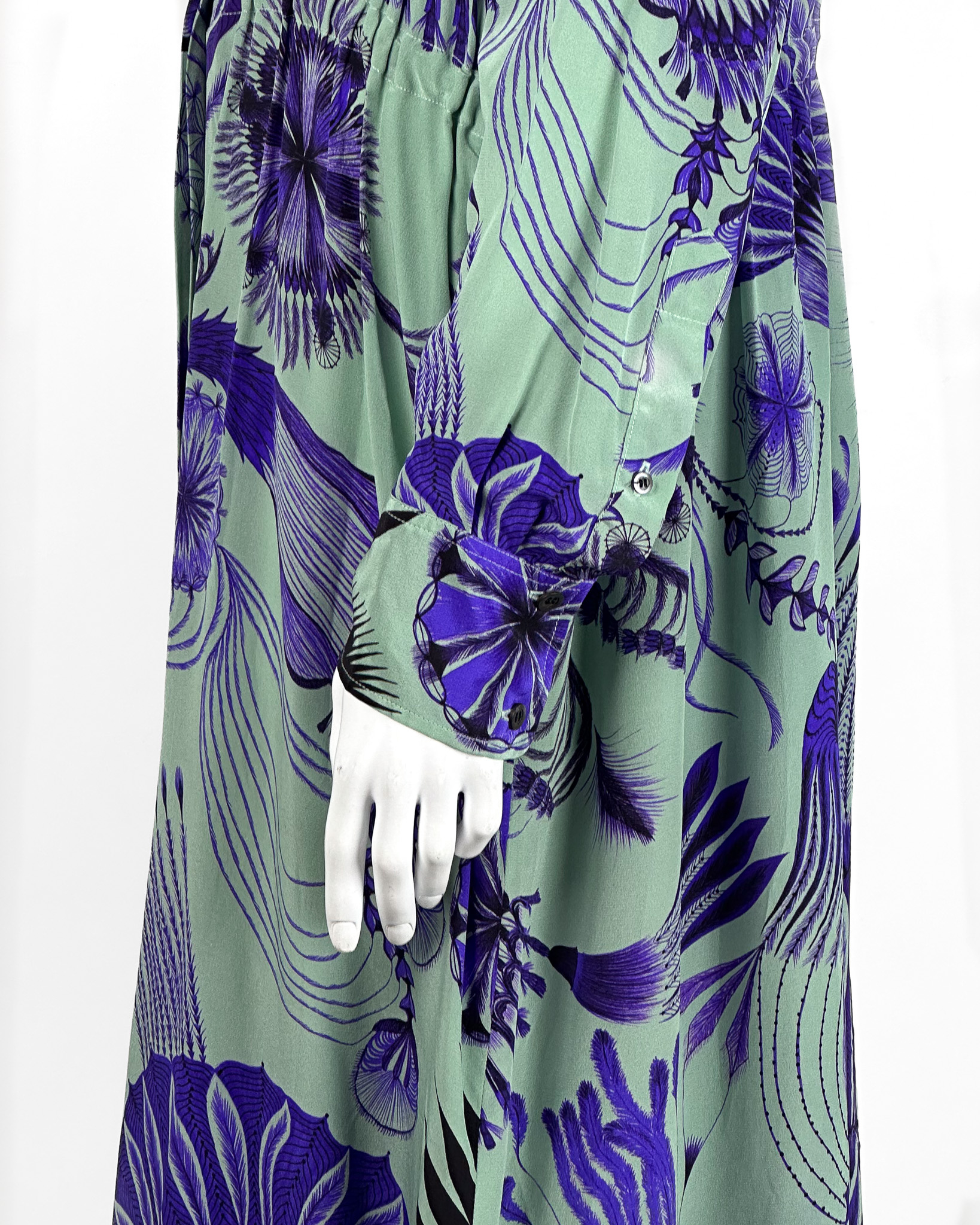 "Sukienka koszulowa o długości midi w kolorze mięty, ozdobiona duęym botanicznym printem w odcieniach granatu. Posiada klasyczny kołnierzyk, jest zapinana na kryte guziki, wszyta gumka w talii, która delikatnie podkreśla sylwetkę. Rozmiar z metki 36."