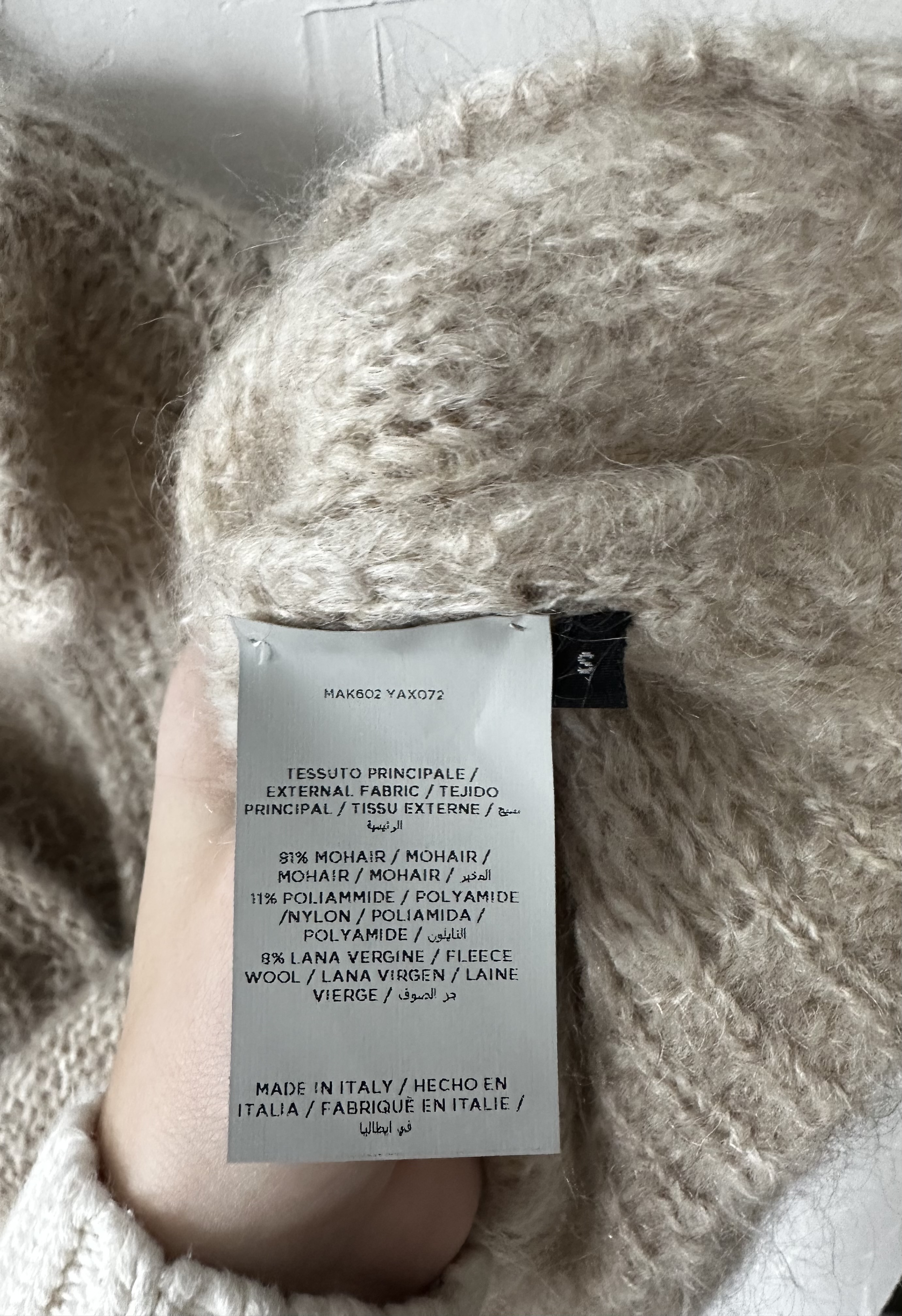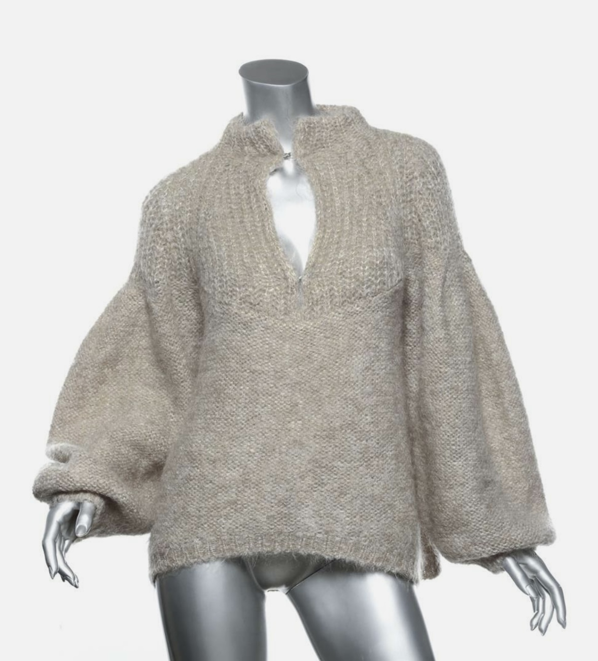Wykonanie 91% moher, dzięki czemu jest lekki ale również bardzo ciepły. Zapinany pod szyją na dwie haftki, krój rękawów to opadające bufki"