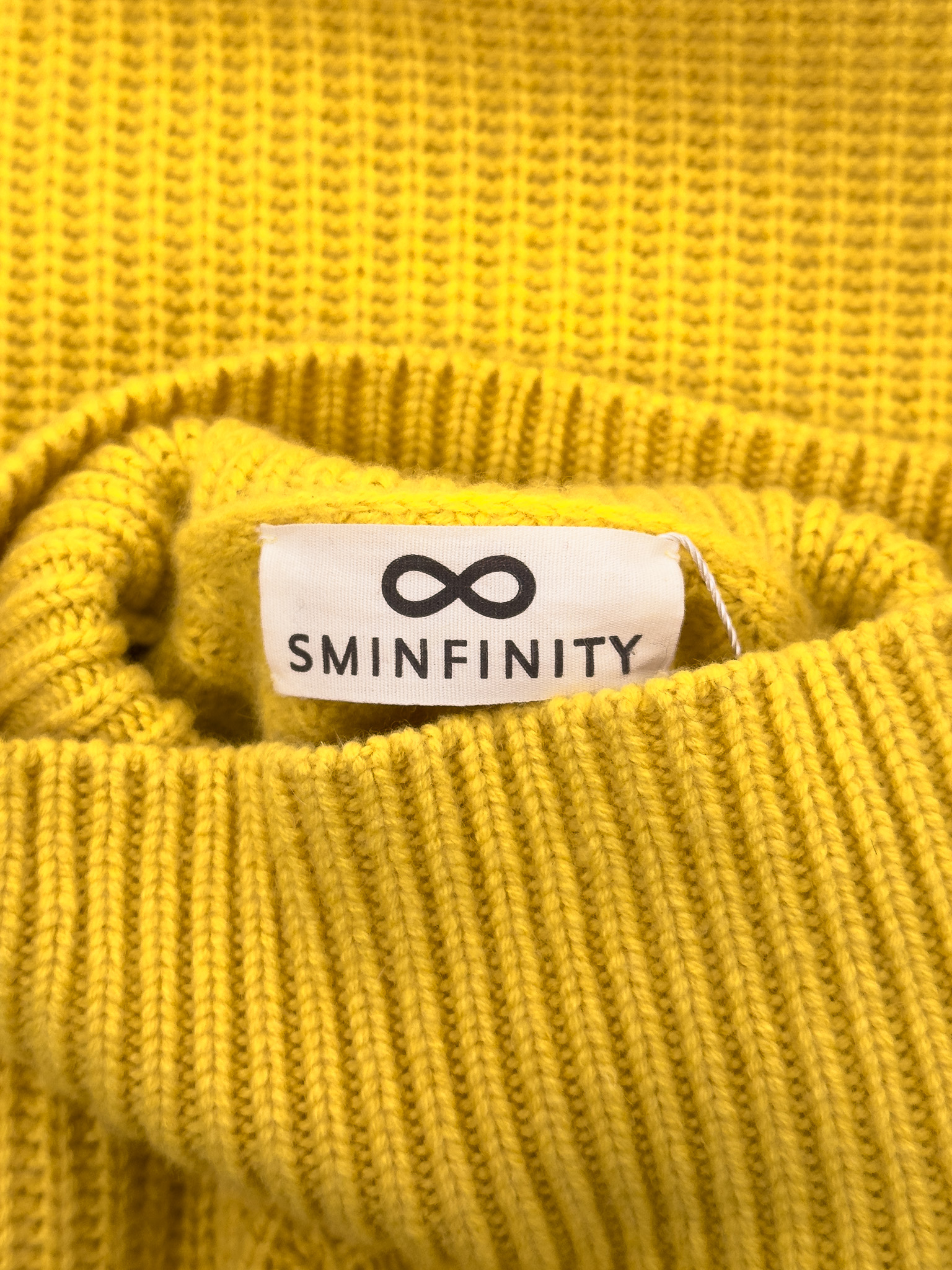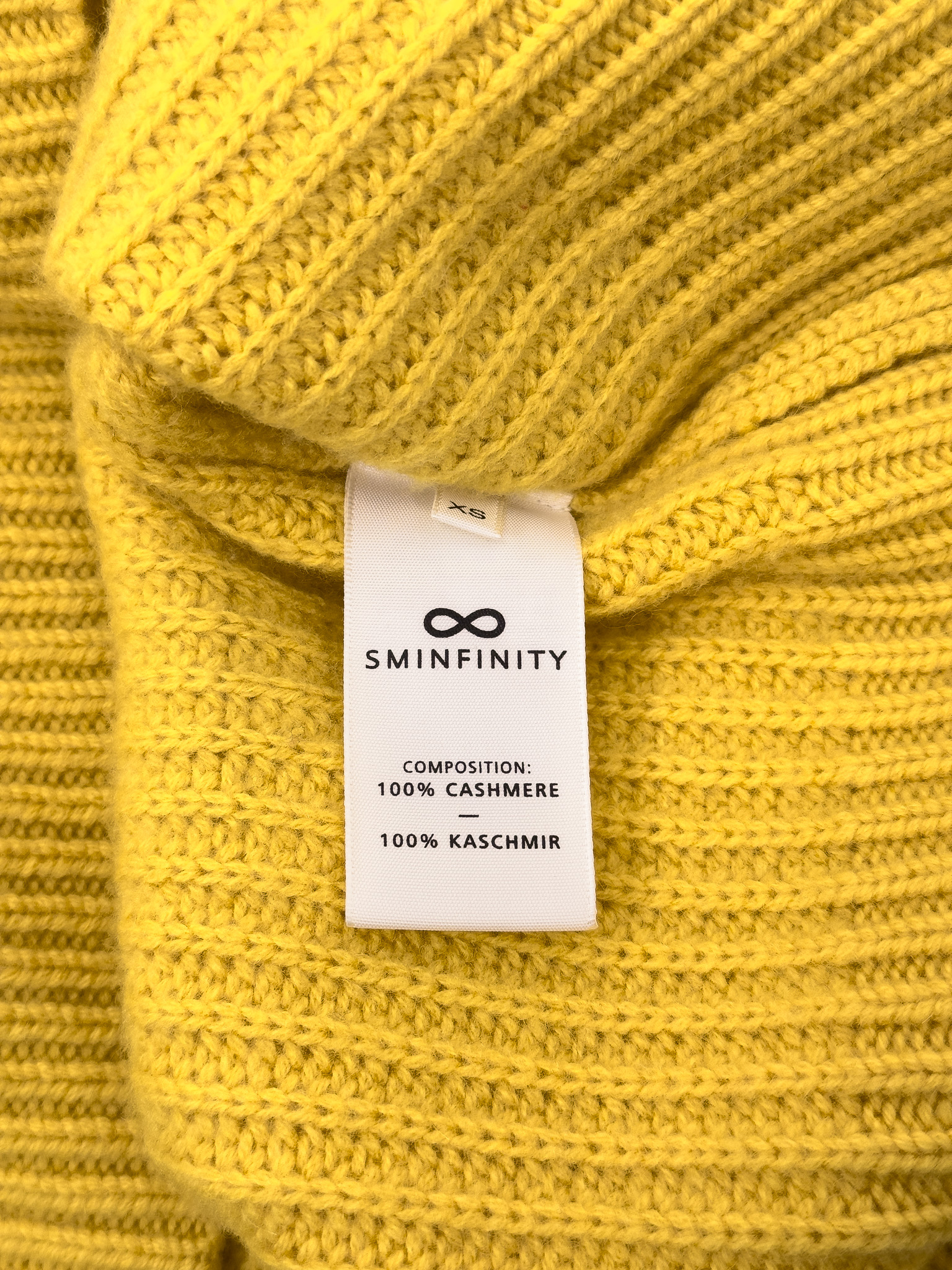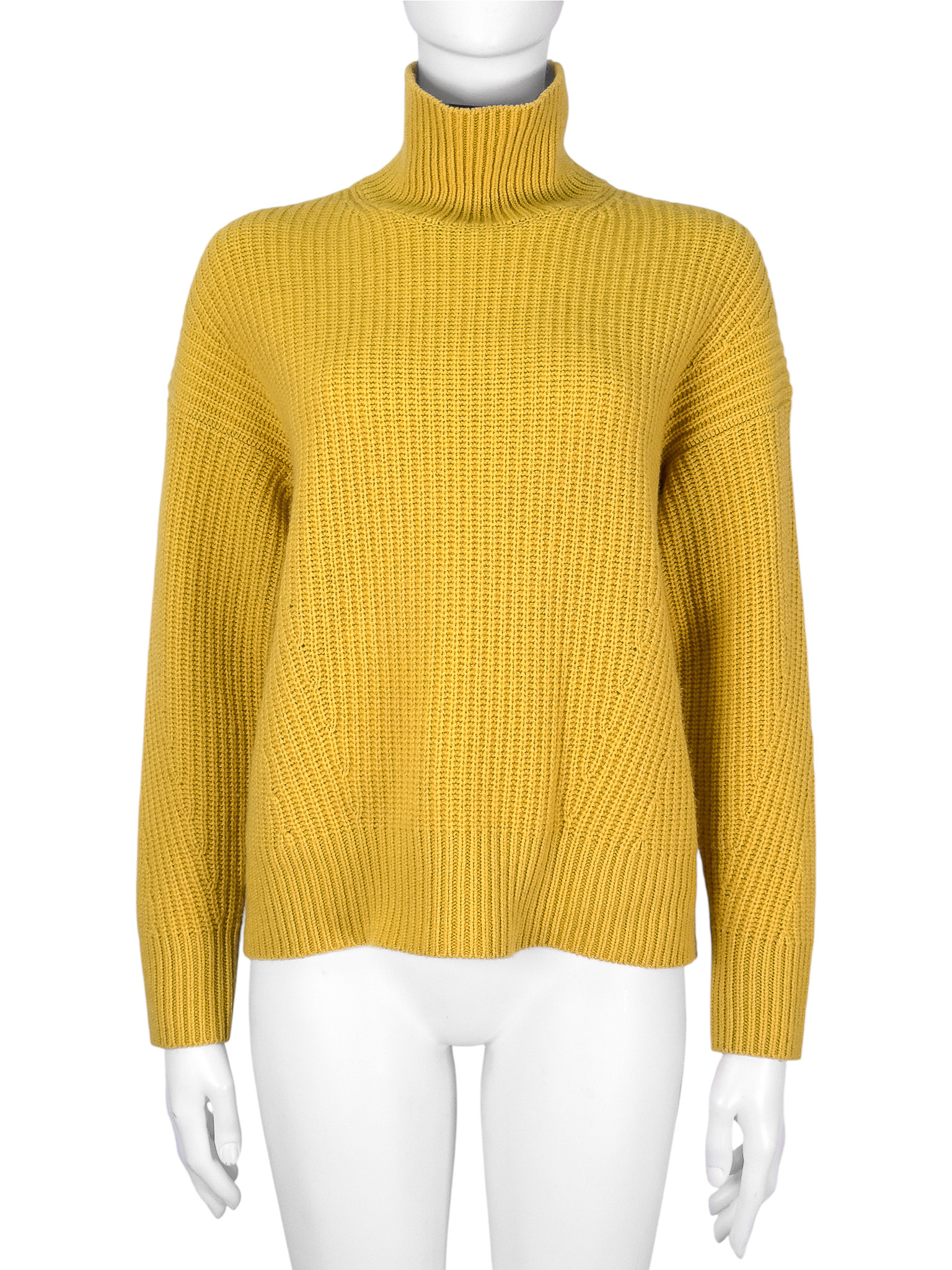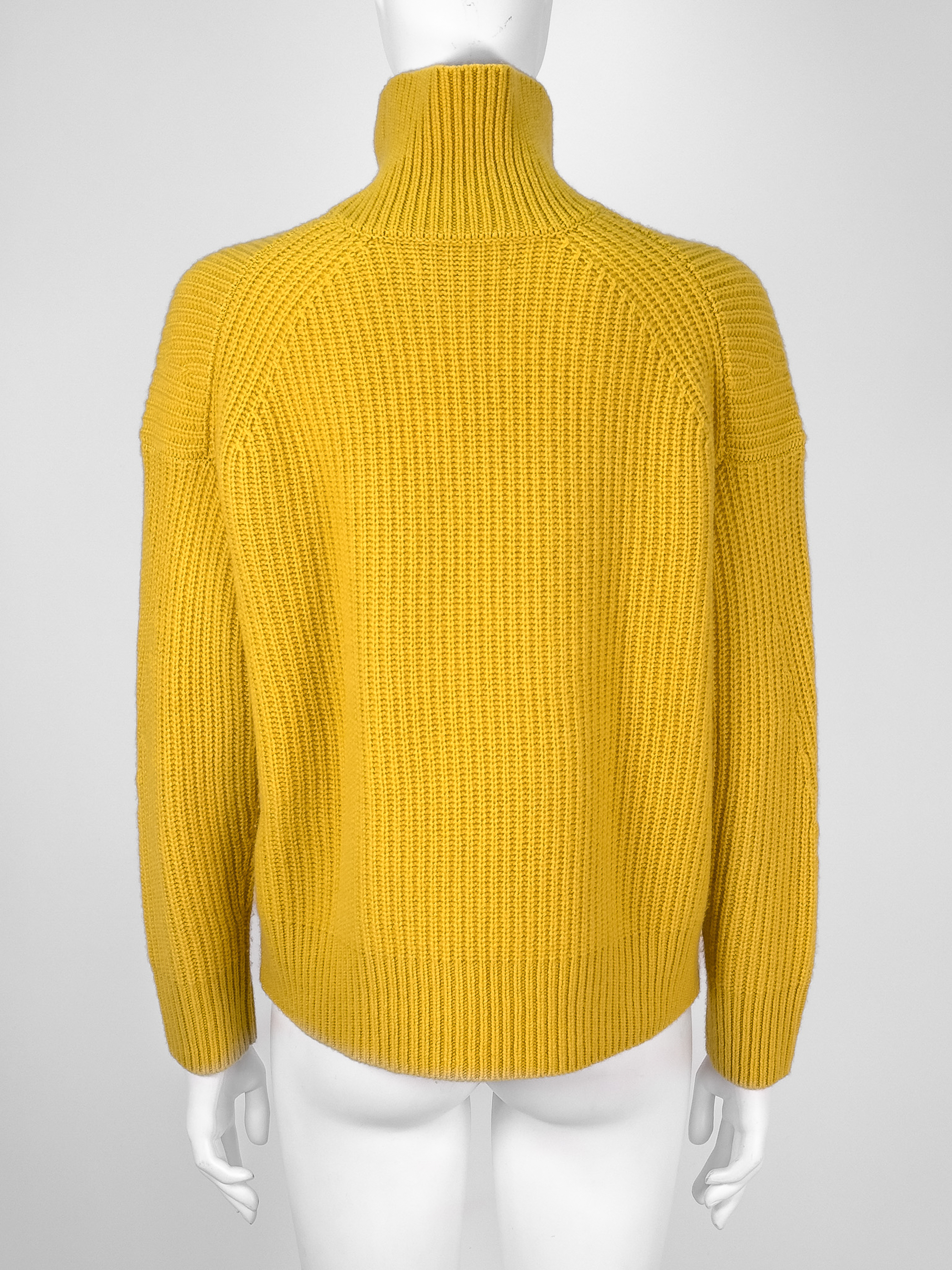 "Kaszmirowy musztardowy klasyczny golf, prążkowany, wykończony ściągaczem. Rozmiar z metki XS. Skład: 100% kaszmir. Wymiary: szerokość mierzona od pachy do pachy 57cm, długość całkowita 59,5cm."