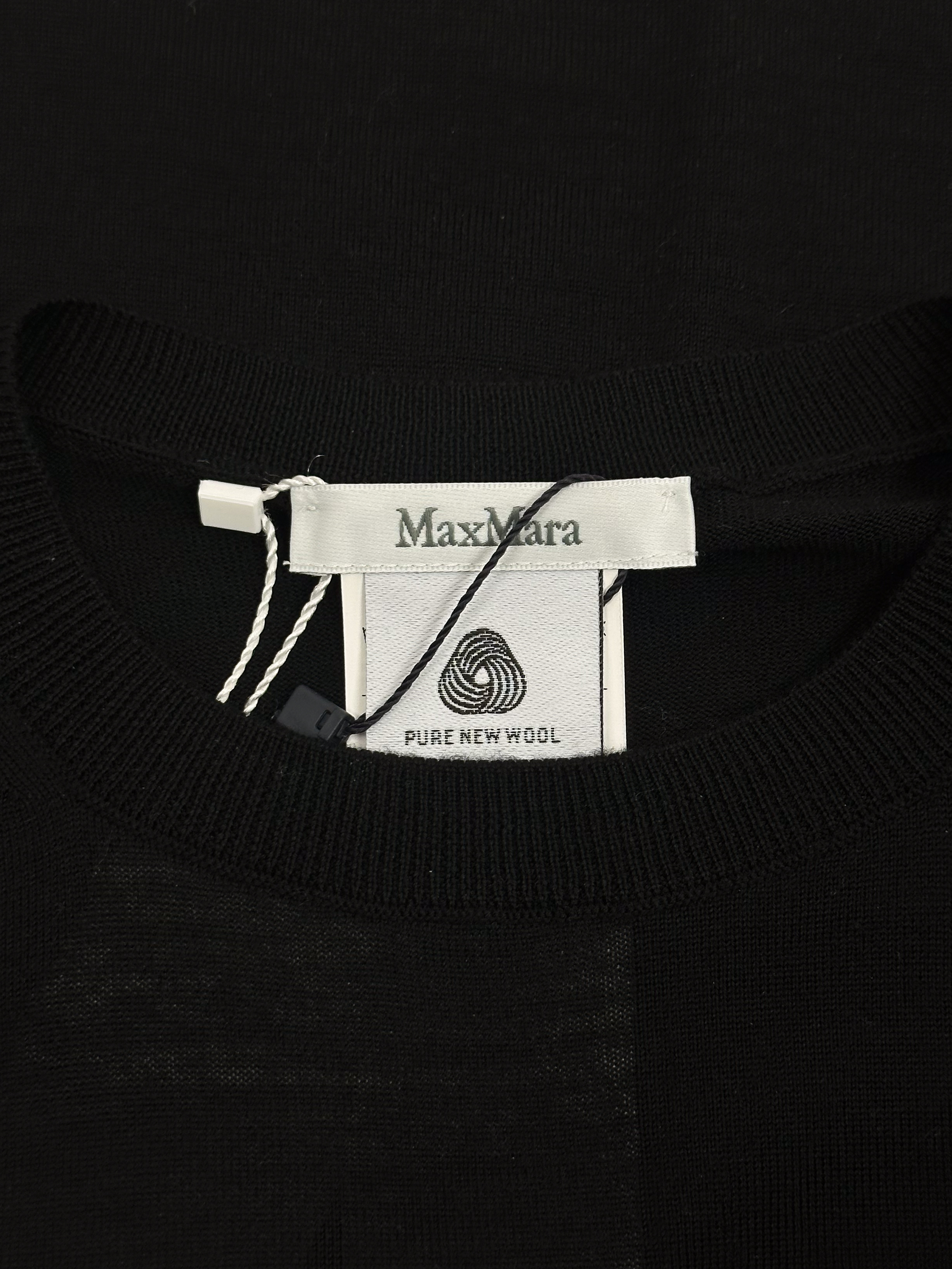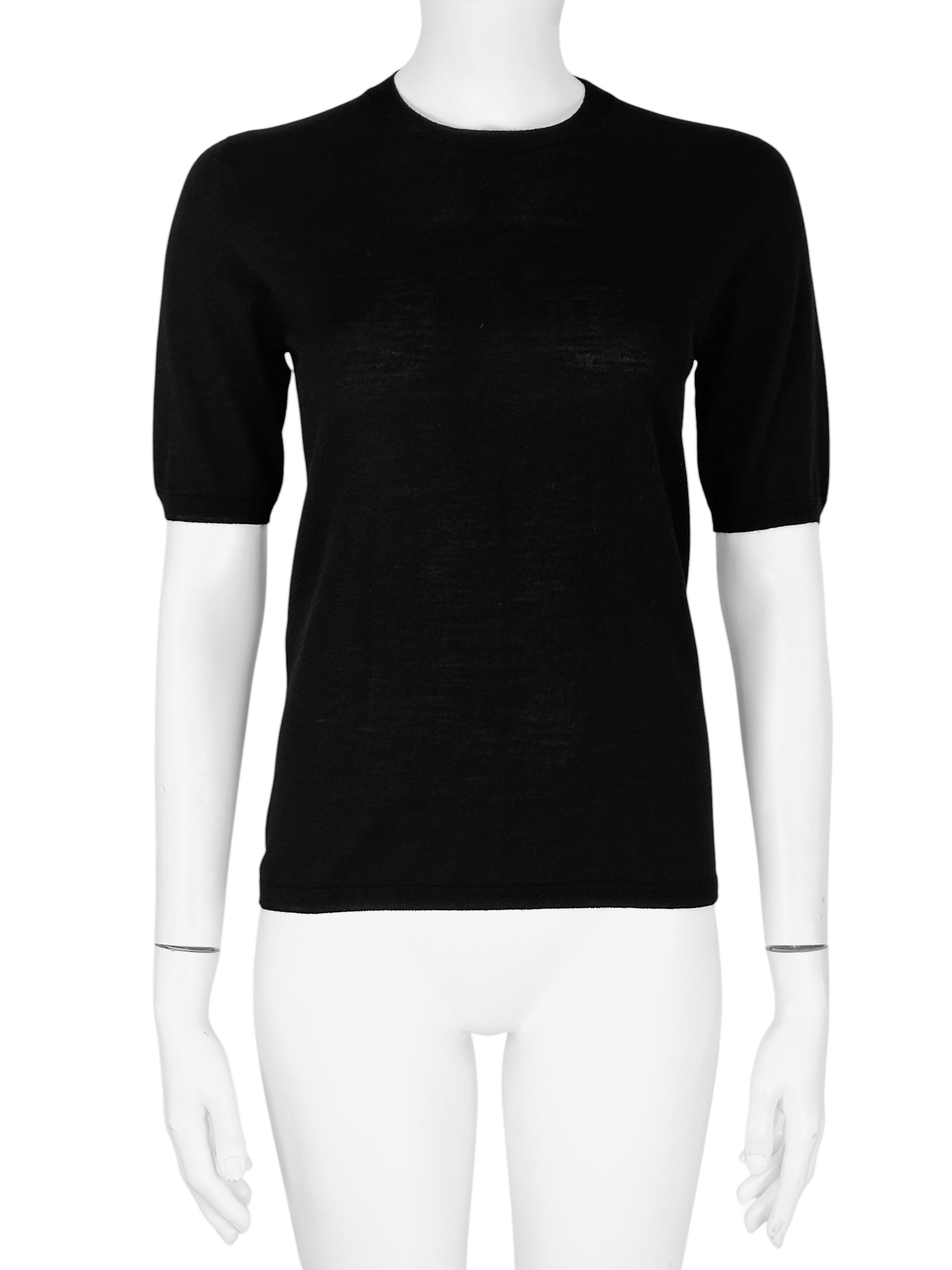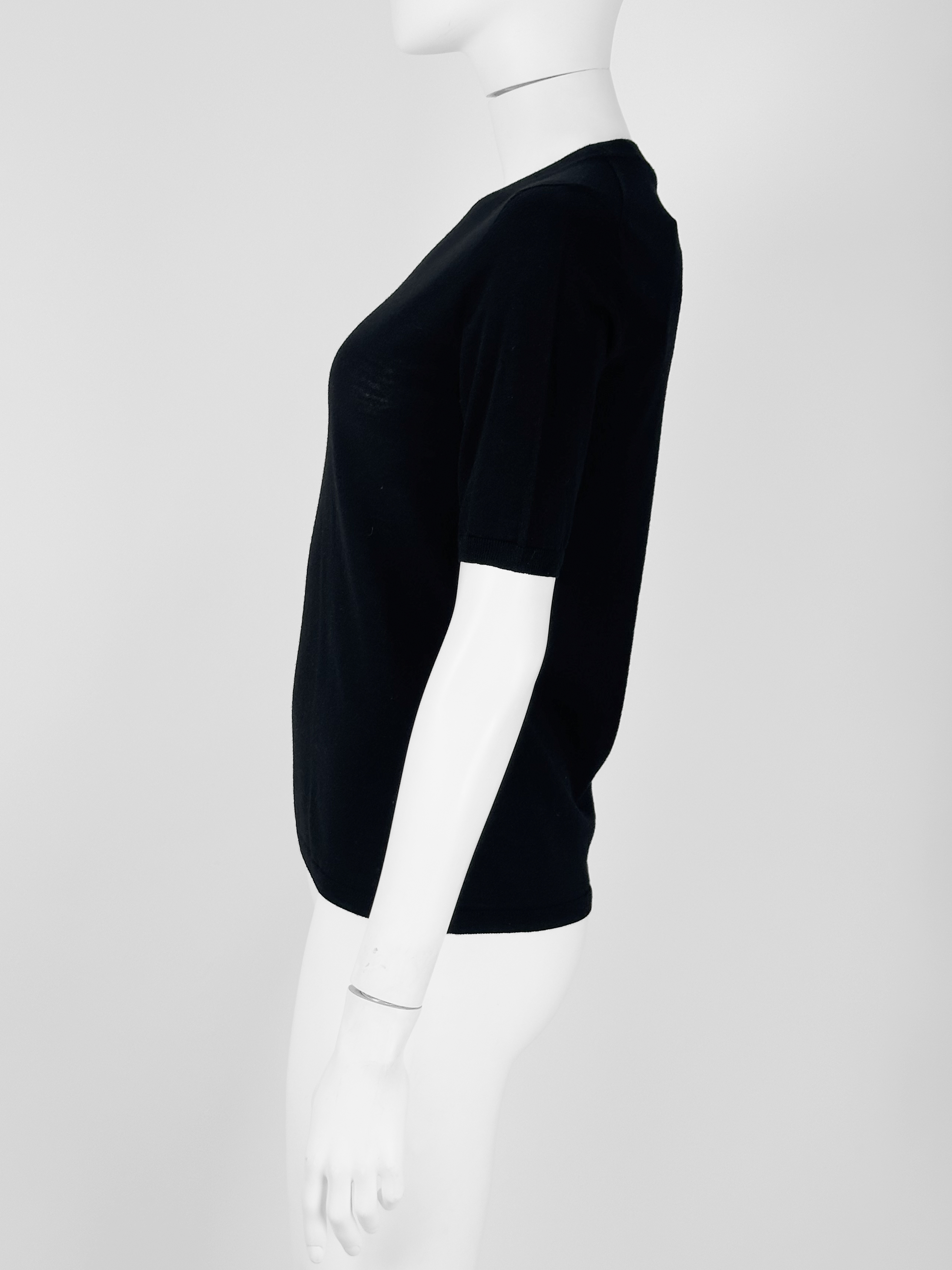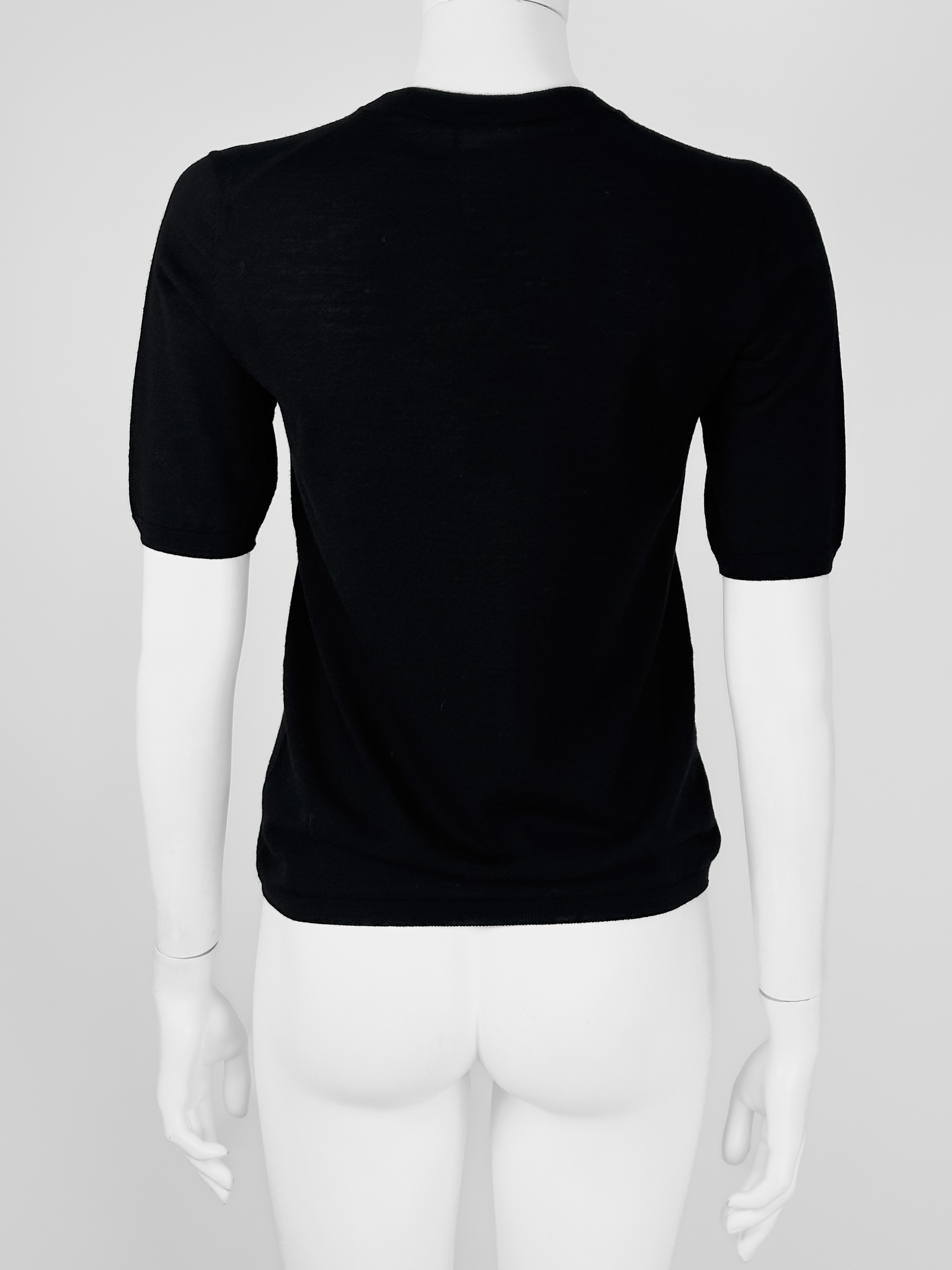 "Czarny cienki sweter z krótkim rękawem, zaokrąglony dekolt, wykończony ściągaczem. Rozmiar z metki M. Skład: 100% wełna. Stan nowy z metką. Wymiary: szerokość mierzona od pachy do pachy 45cm, długość całkowita 64cm."