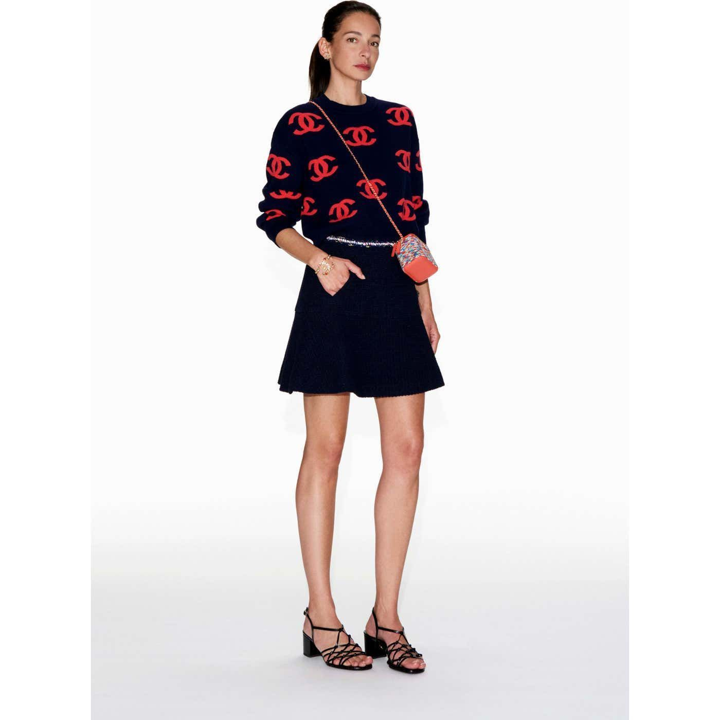 "SWETEREK Z GRUBEGO KASZMIRU W KOLORZE GRANATOWYM Z LOGO W KOLORZE RÓŻOWYM - MARKA CHANEL - KOLEKCJA 2021 - ROZMIAR 36. STAN BARDZO DOBRY."