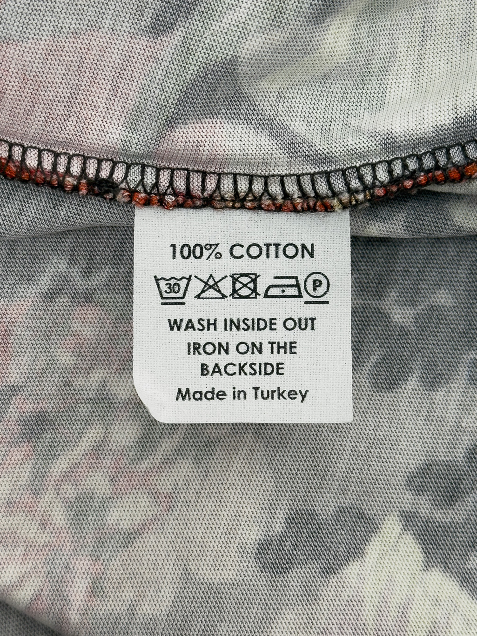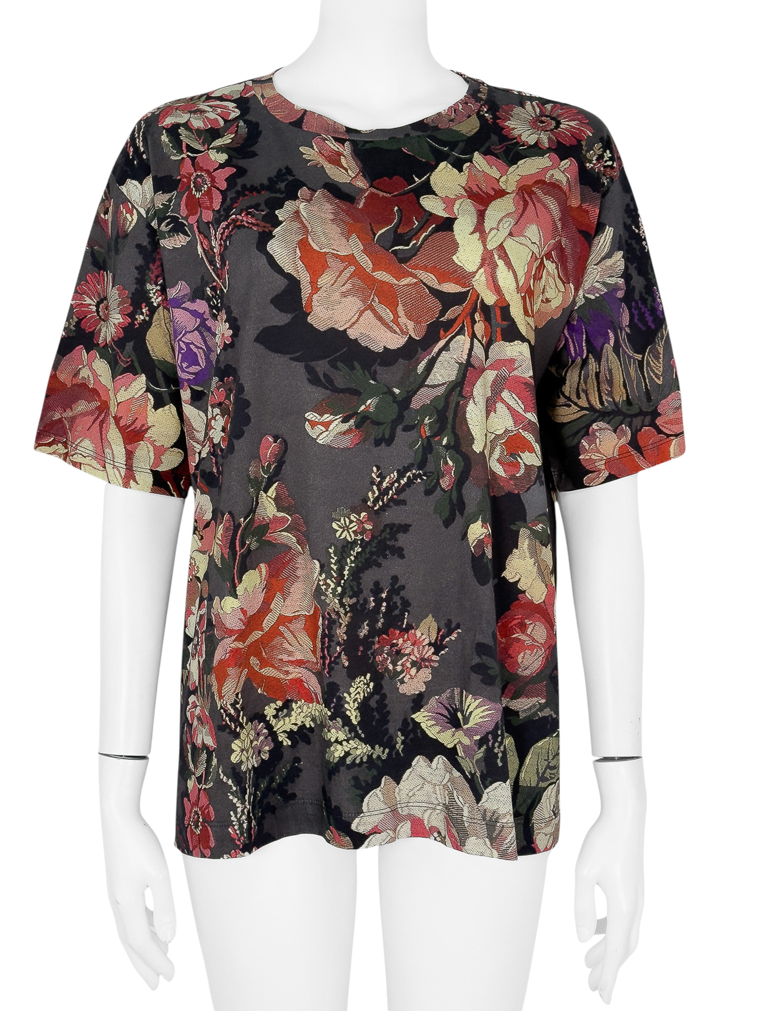 "Ciemnoszary bawełniany t-shirt ozdobiony różowo-fioletowo-czerwoną grafiką kwiatów, prosty krój, zaokrąglony dekolt. Stan bardzo dobry. Rozmiar z metki L. Skład: 100% bawełna. Wymiary: szerokość mierzona od pachy do pachy 59cm, długość całkowita 66cm."