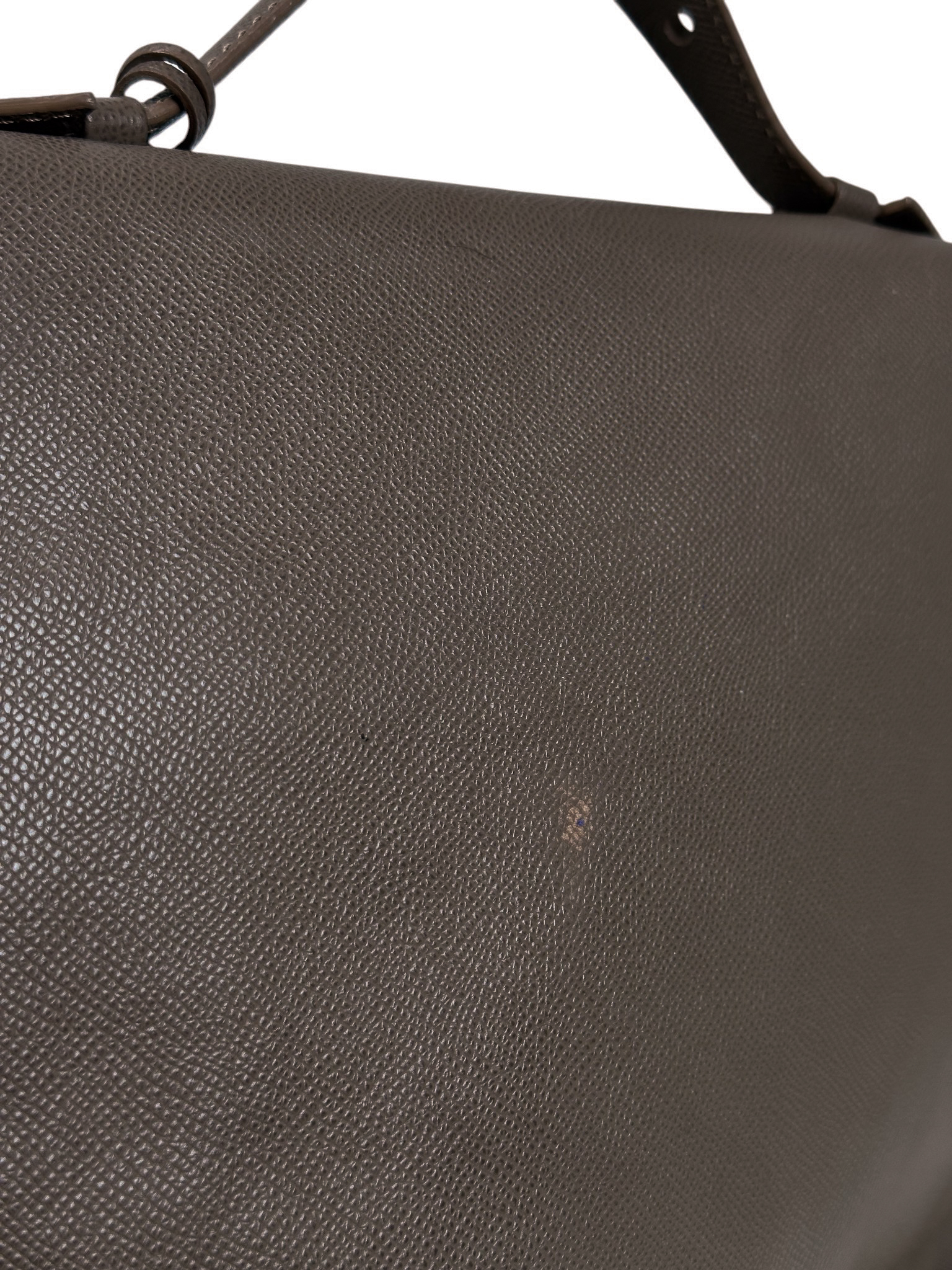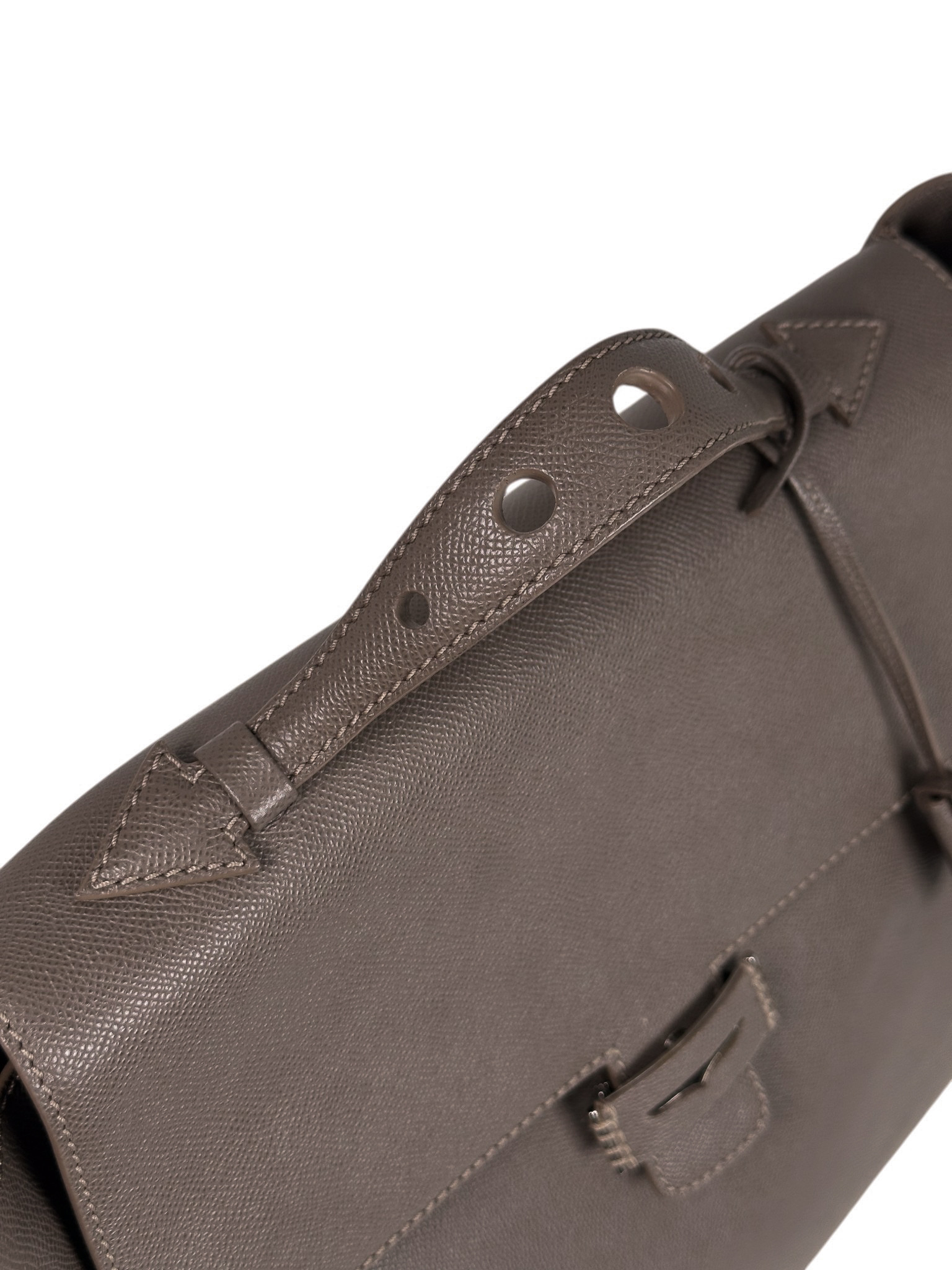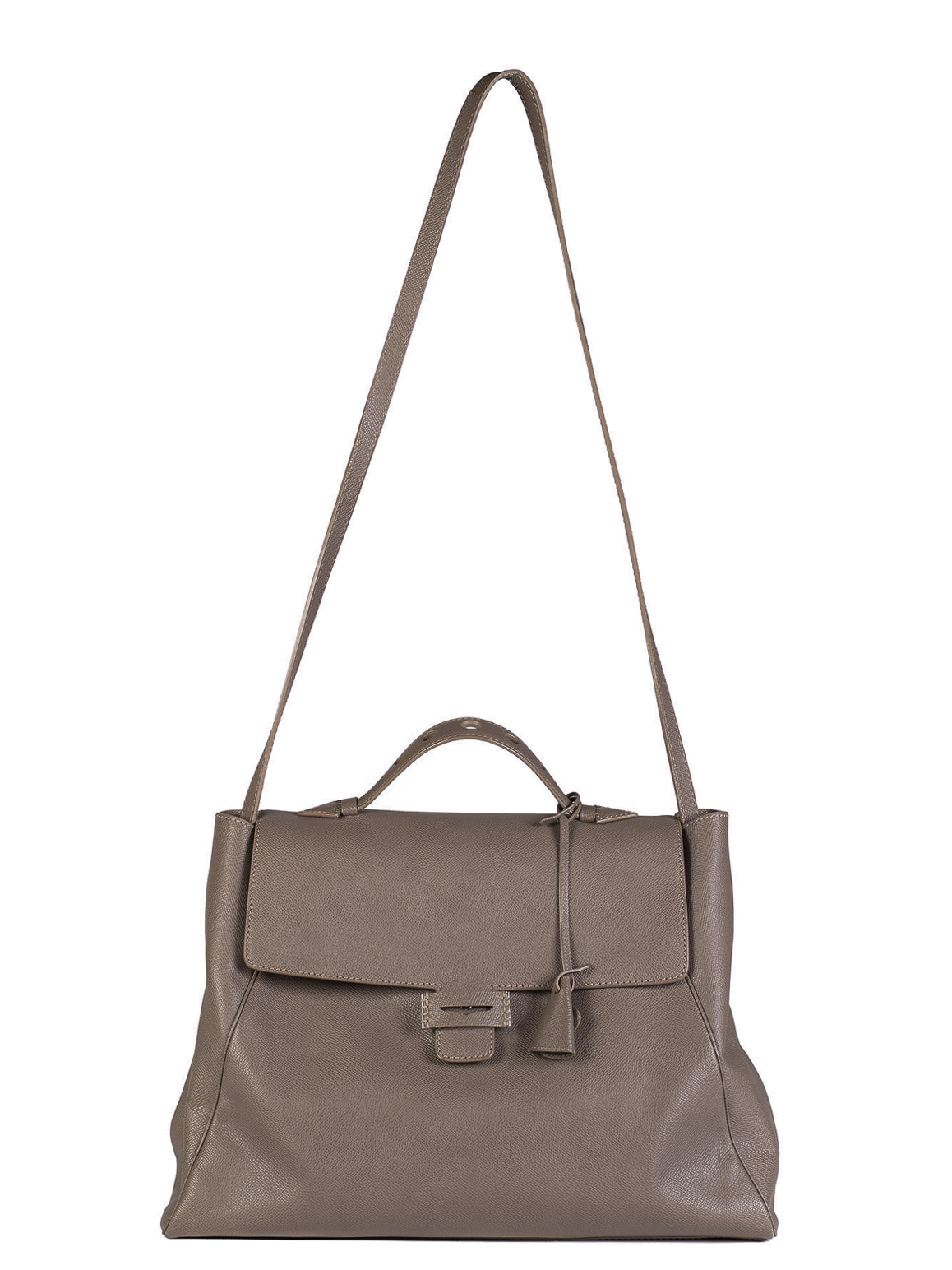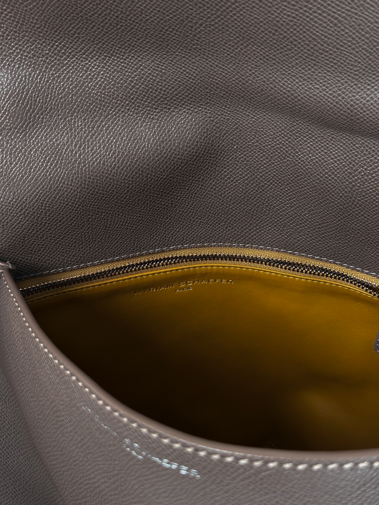 "Szara torba MYRIAM SCHAEFER w kształcie trapezu z dodatkowym długim paskiem, zapinana na klapkę, wewnątrz musztardowa. Kieszonka na suwak i dwie kieszonki otwarte. Wymiary:szer. 39 cm. wys.30 szer. bok cm. 14 cm. Wymiary podstawy: 41 cm. x 13 cm."