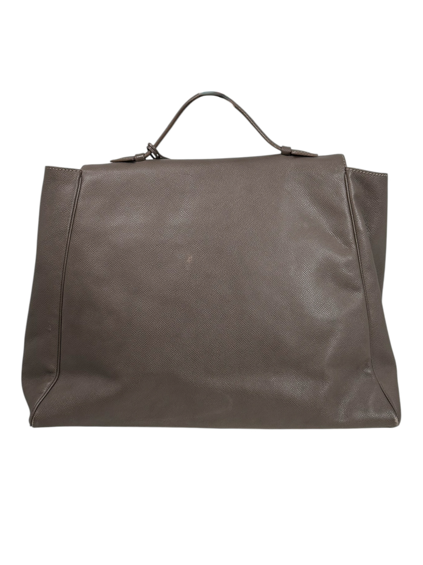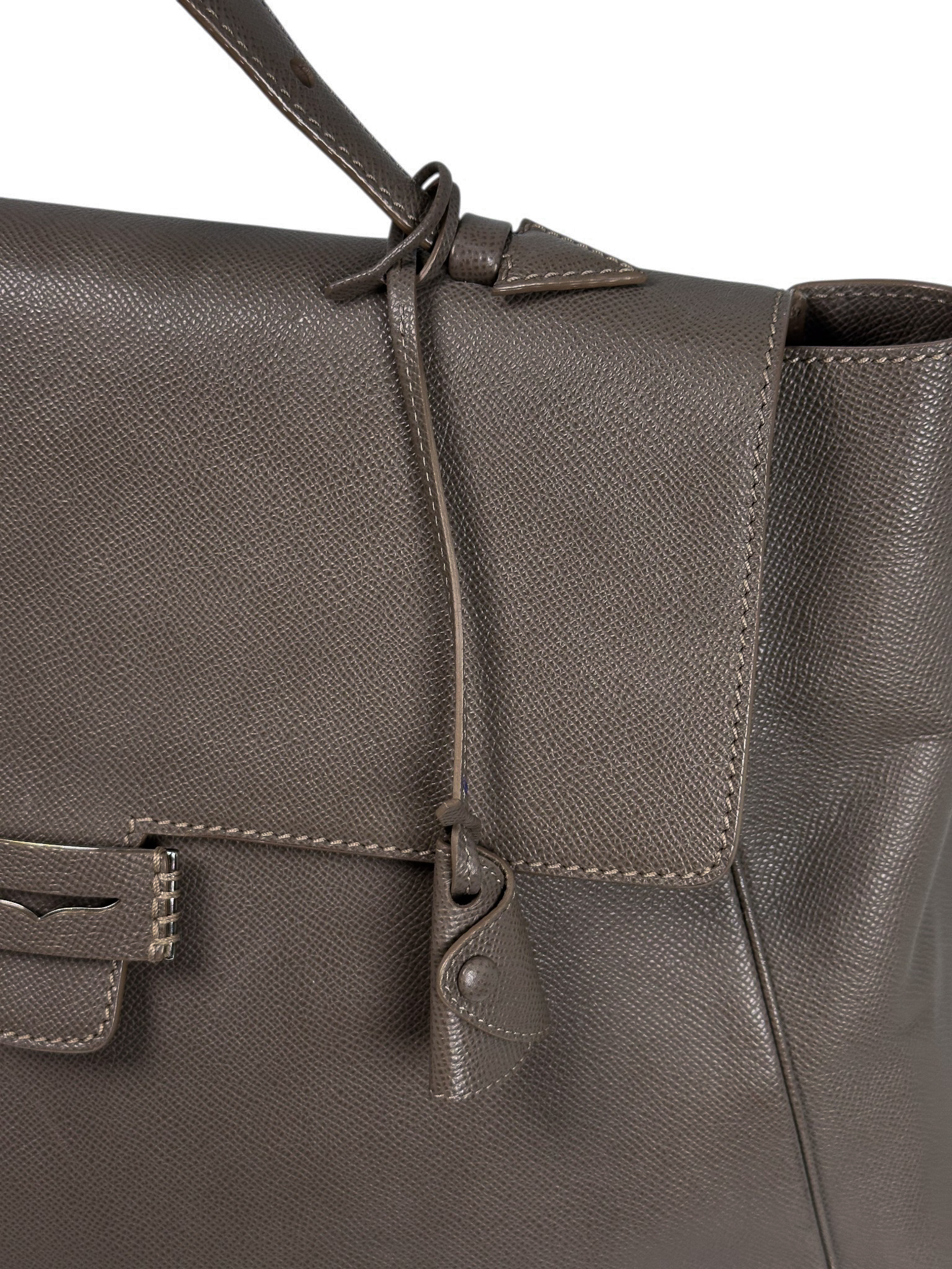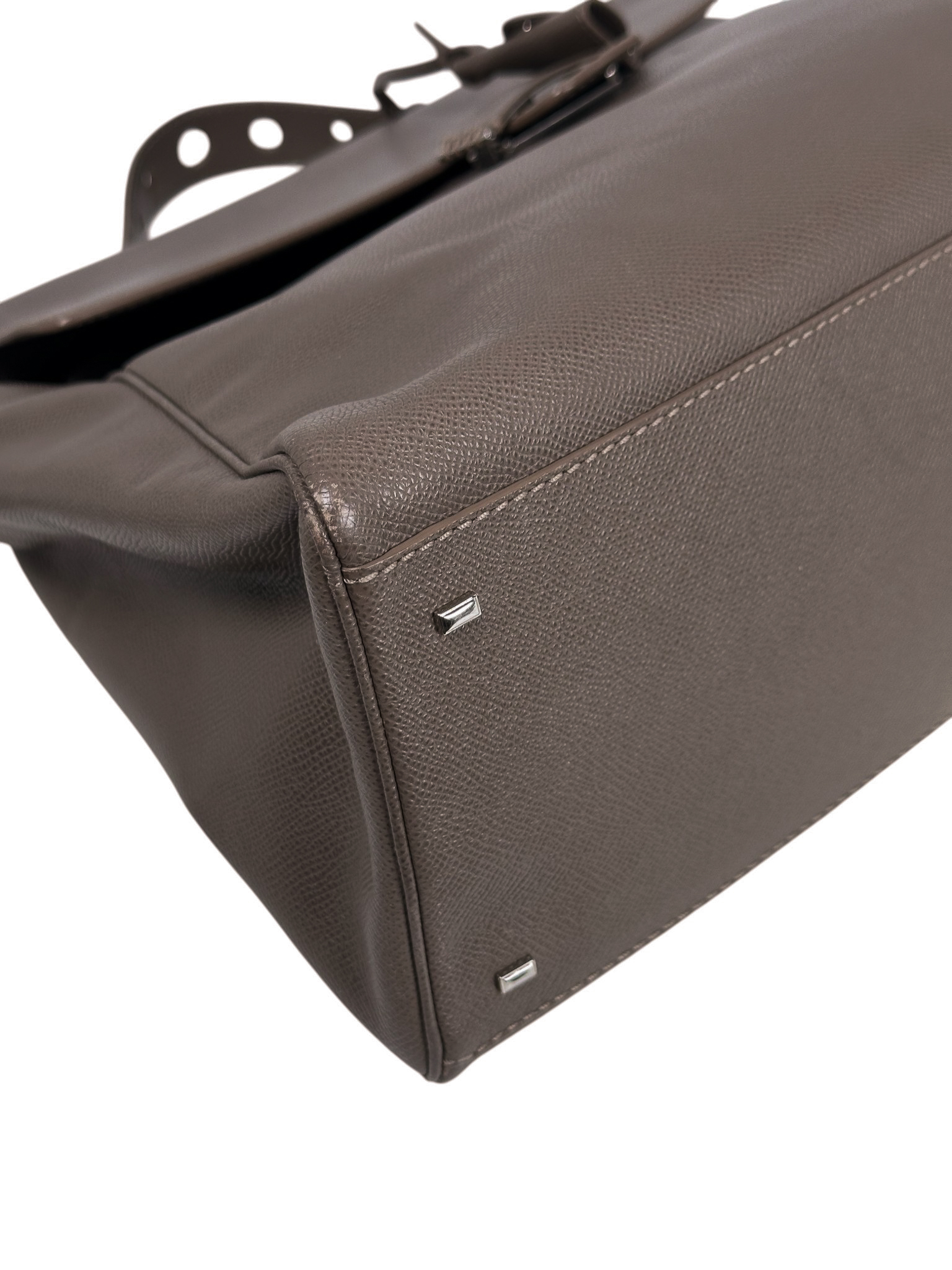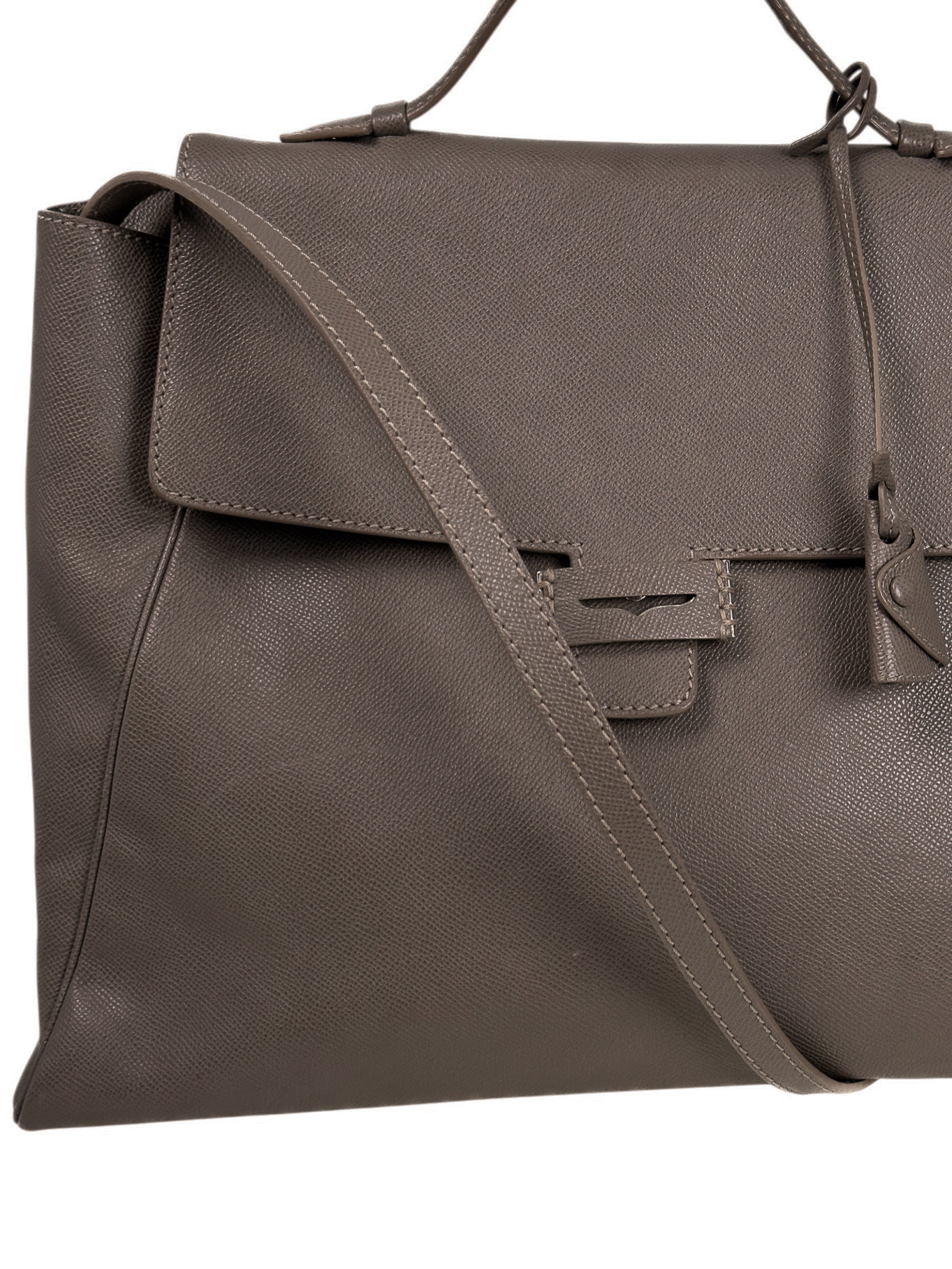 "Szara torba MYRIAM SCHAEFER w kształcie trapezu z dodatkowym długim paskiem, zapinana na klapkę, wewnątrz musztardowa. Kieszonka na suwak i dwie kieszonki otwarte. Wymiary:szer. 39 cm. wys.30 szer. bok cm. 14 cm. Wymiary podstawy: 41 cm. x 13 cm."