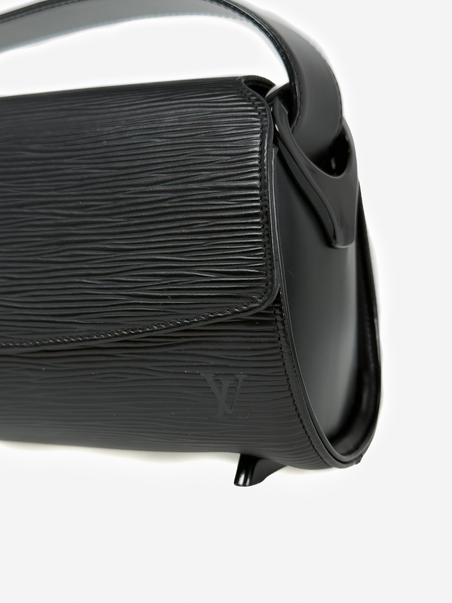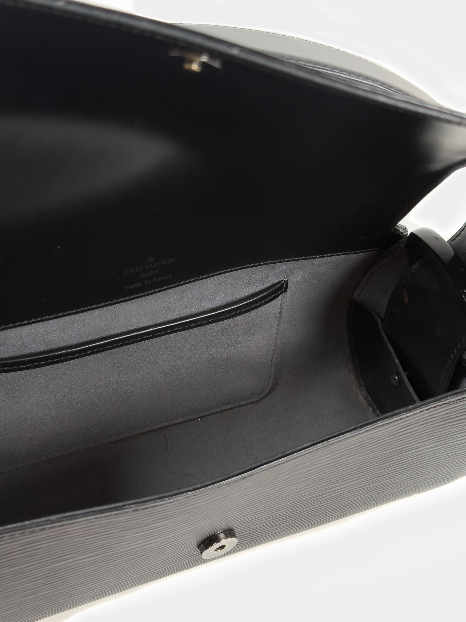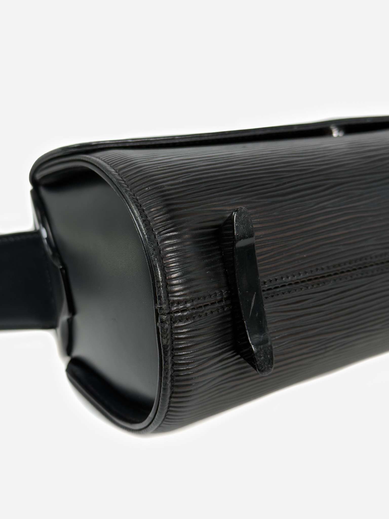 "Czarna torebka w skórze epi, kształt bagietki, logowanie marki w prawym rogu, zapinana na zatrzask, szary środek. Stan: bardzo dobry, pojedyncze zarysowania. Wymiary: szerokość 25cm, wysokość 13cm, głębokość 9cm."